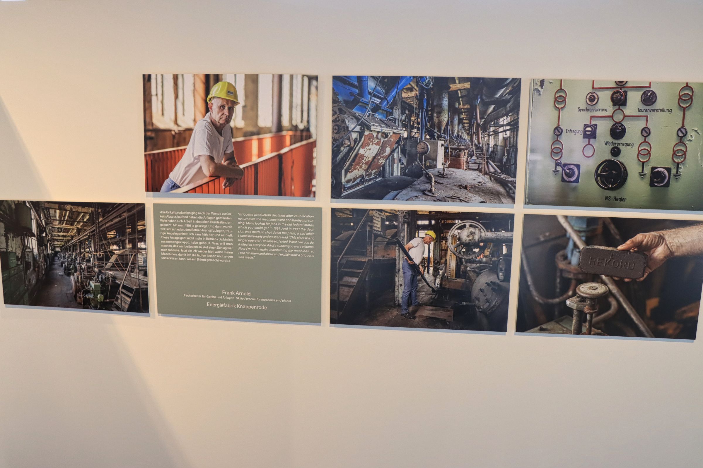 Gleich in der Eingangshalle der Kohlenwäsche (leider nur bis 6. April 2025) die Ausstellung „Industriegeschichten – Reportagen aus Museen, die keine waren“. Die Bilder und Texte zeigen Fabriken der ehemaligen DDR, die nach der Wende abgewickelt und geschlossen wurden und zeigt Menschen, die um 1990 von heute auf morgen arbeitslos wurden. Einige von ihnen haben das alte erhalten und zeigen es heute in Museen der Industriegeschichte (nachzulesen auch hier unter Industriegeschichten.de).
