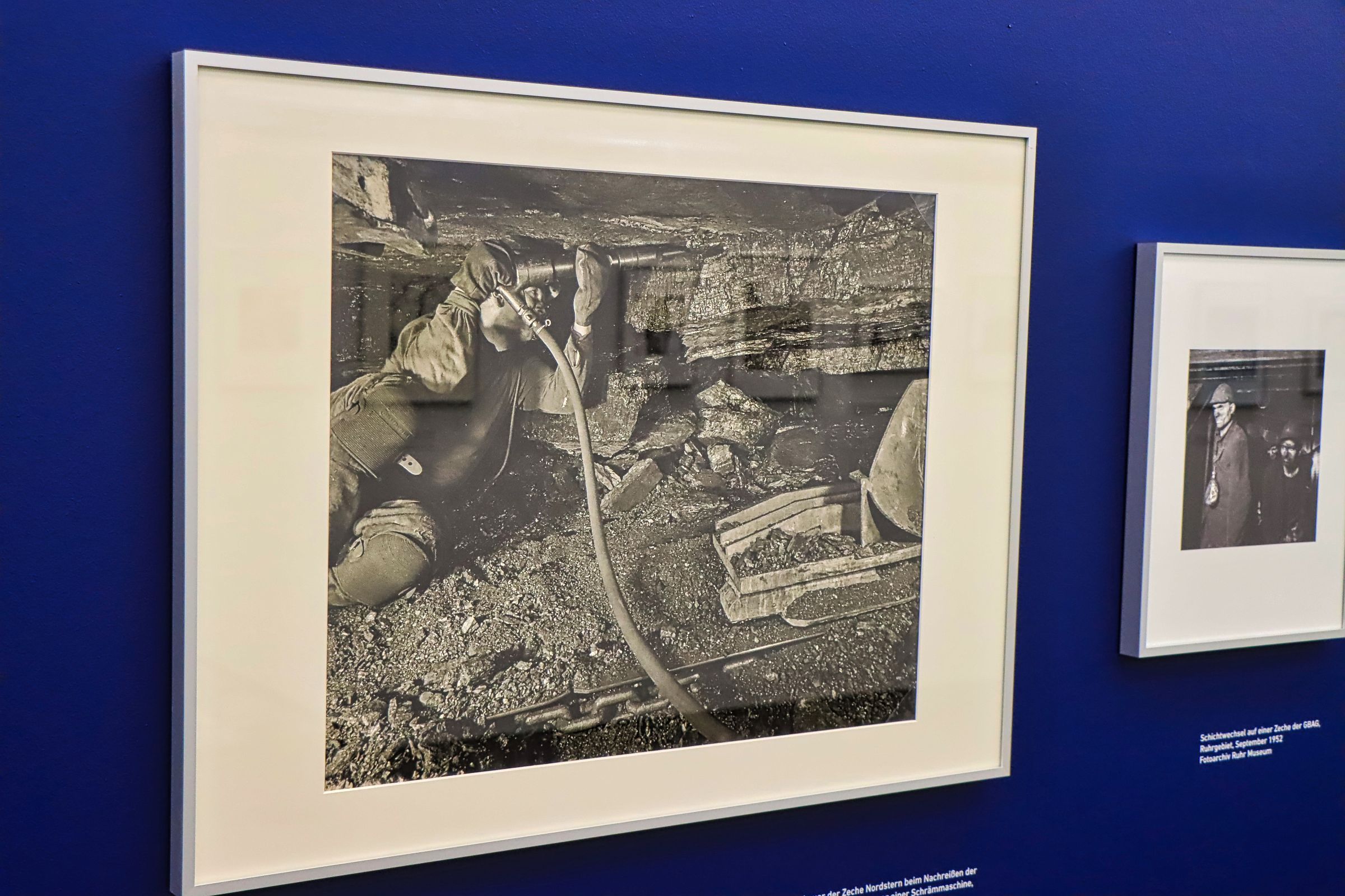 Nach einer Stippvisite auf der Dachterrasse der Zeche Zollverein mit sehr viel Wind ging es in Ausstellung Nummer drei. „Bilder im Auftrag – Fotografien von Ruth Hallersleben“ (noch bis August 2025). Sie betrieb von den 1930’er bis in die 1960’er Jahre Industriefotografie im Bereich Schwerindustrie, Architektur, Landschaft und Bergbau z.B. beim Betriebssport auf Zeche Minister Stein. Die Aufnahmen sind gut, vor allem wenn man bedenkt in welcher Zeit sie gemacht wurden, daß die Bilder allerdings große Summen bei Verkäufen erzielten kann ich nicht verstehen.