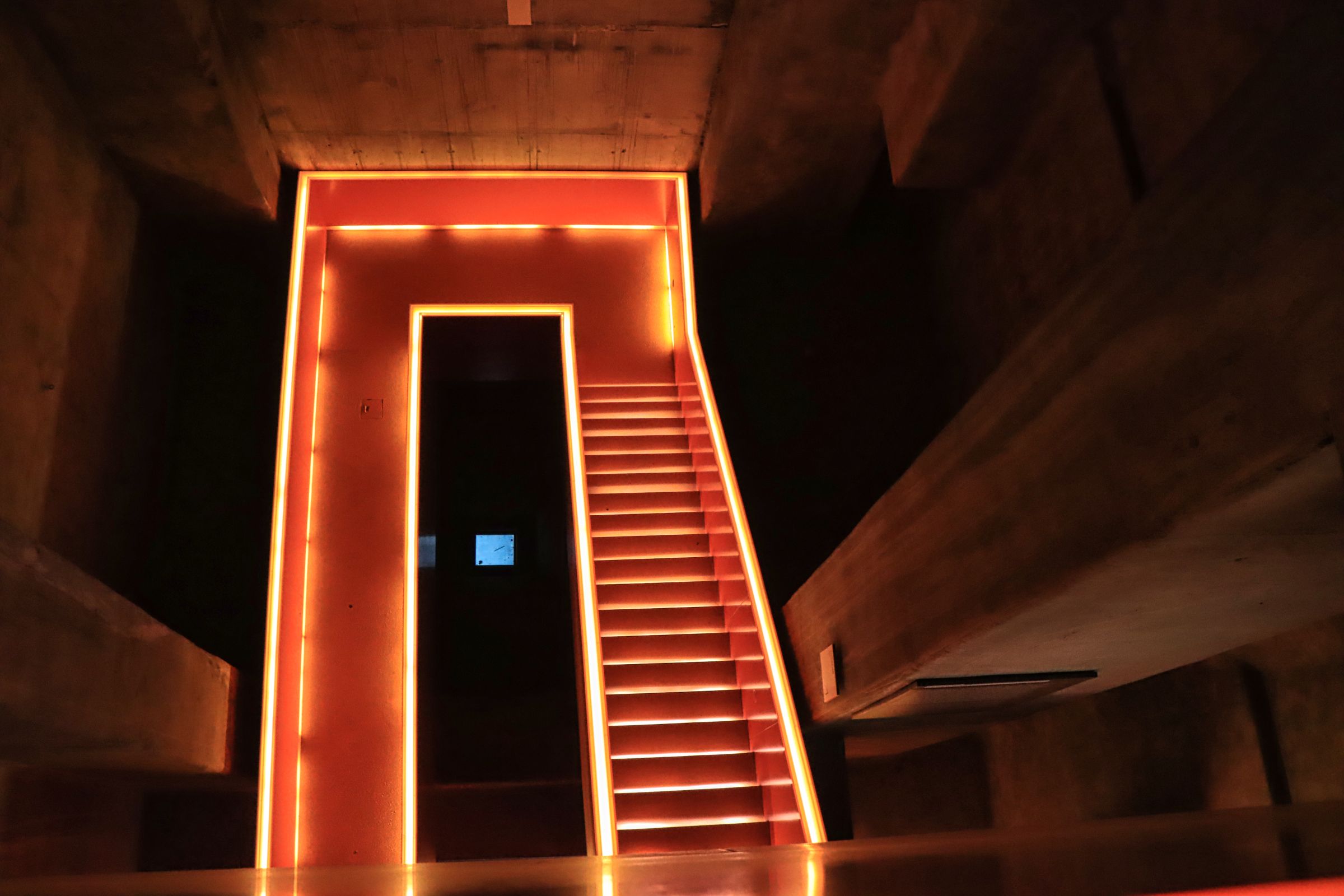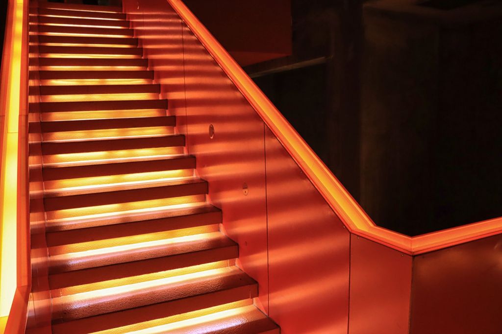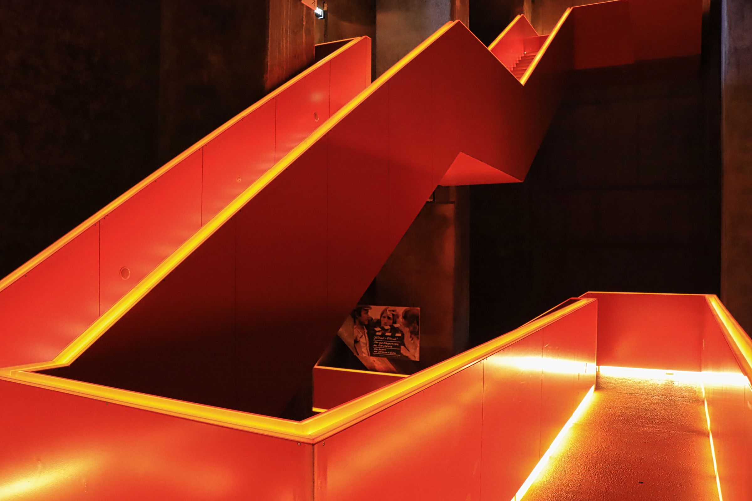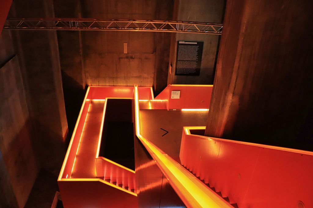 Nicht nur, daß die Schafe unweit der bekannten Rolltreppe zum Ruhrmuseum weideten, Schafe werden hier zur umweltfreundlichen Rasenpflege eingesetzt und hatten, passend zur Osterzeit, auch gleich ein paar Osterlämmchen dabei, nein es gab auch freien Eintritt zu einer Reihe von Ausstellungen. Gelegenheit nochmal ein paar aktuelle Bilder mit der besseren Kamera vom Treppenhaus zum Ruhrmuseum zu machen. Dem fließenden Stahl der Stahlindustrie nachempfunden, leuchtet das Treppenhaus in wunderschönem orange.