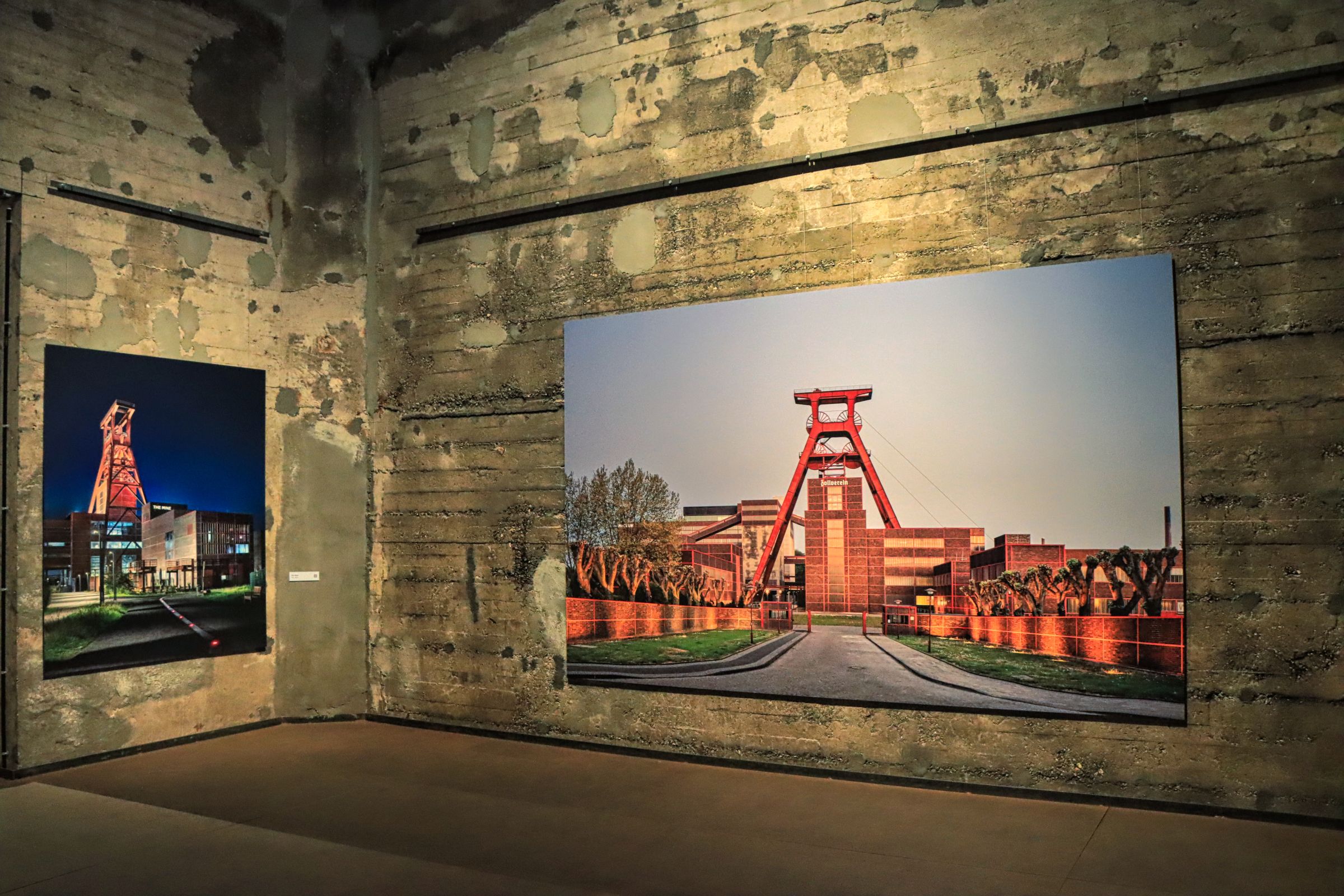 Die Ausstellung zeigt großformatige Fotos (und wenn ich groß sage, meine ich groß) der Zeche und Kokerei Zollverein, des angegliederten neuen Hotels und der Folkwang Universität. Bei den Fotos ist nichts dem Zufall überlassen worden. Die Lichtstimmung, der Sonnenstand oder die blaue Stunde. Mit dabei natürlich das oben erwähnte Treppenhaus des Ruhrmuseums. Da lohnt auch das Begleitbuch (die Paperbackausgabe ist mit 29,95 € nur halb so teuer, wie das Hardcover). Mehr wertvolle Bilder <räusper> findet ihr wieder bei Flickr oder Google Photos und die dürft ihr, unter Namensnennung, sogar in eure Ausstellung hängen.