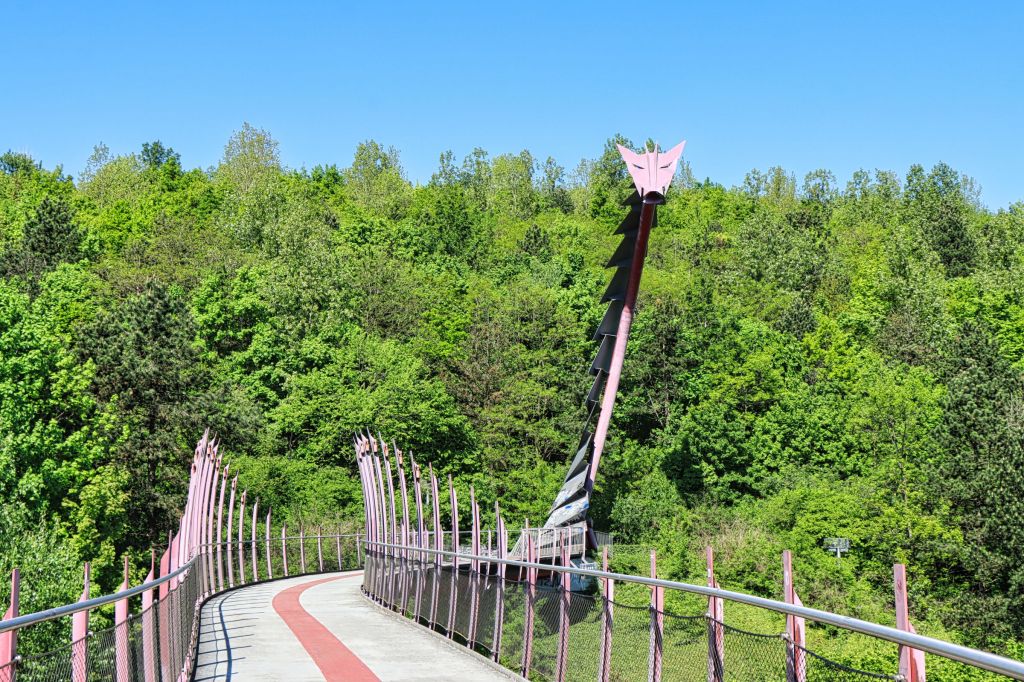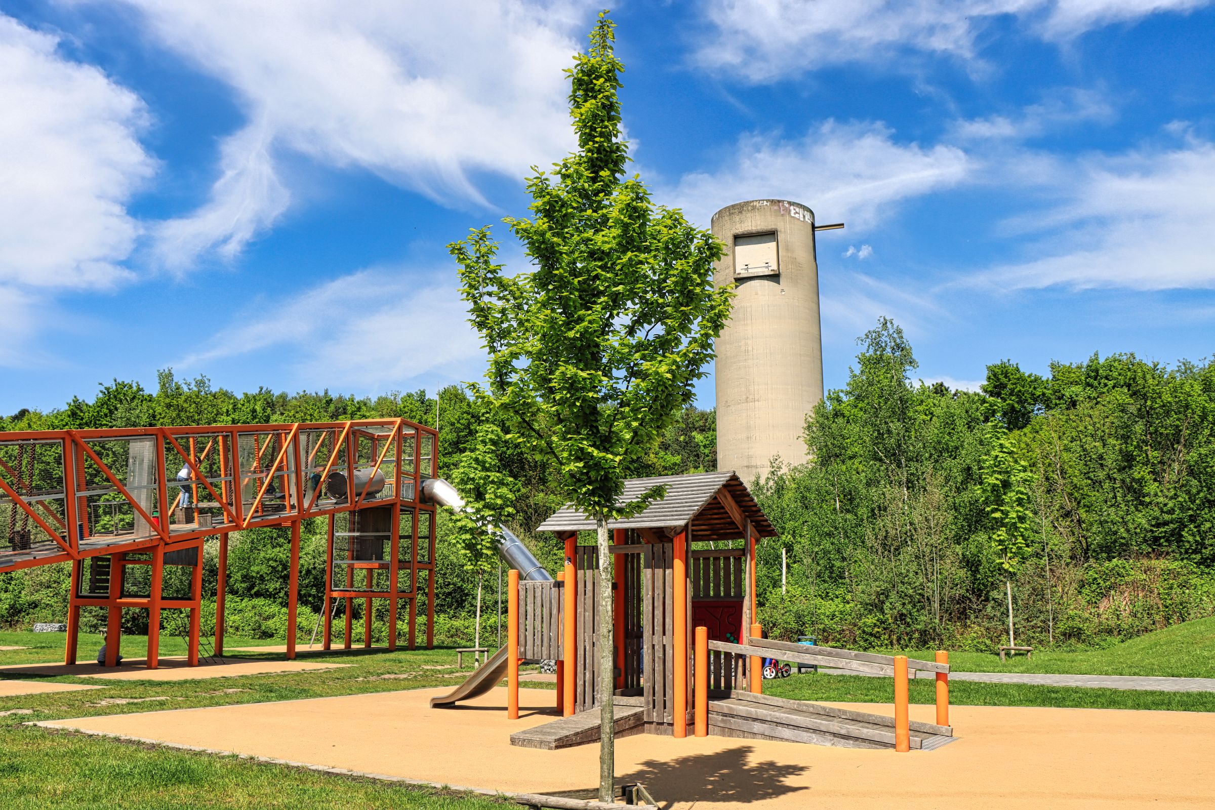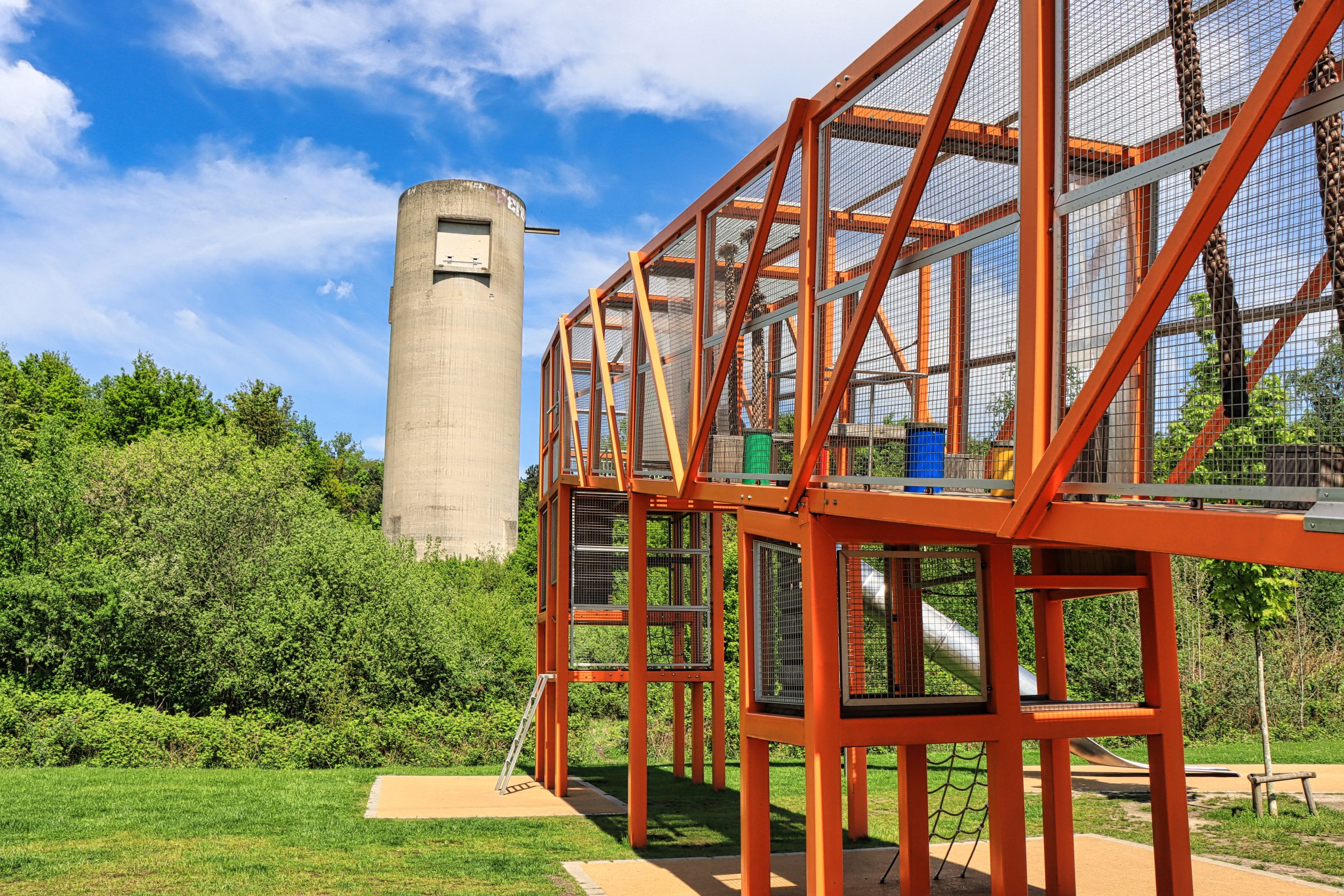 Auf dem Rückweg zur Drachenbrücke bin ich dann nochmal kurz abgebogen zu den ehemaligen Bahnanlagen der Zeche Ewald. Die Brachflächen wurden renaturiert und 2022 zum AktivLinearPark umgebaut. Der verläuft auf 1,5 Kilometern zwischen der Hohewardstraße in Herten und der Wanner Straße in Recklinghausen und ist so eine Art Outdoorfitnessstudio mit Radweg und Kinderspielplatz. Die Farbe orange dient hier als Gestaltungsmerkmal z.B. für die alten Masten der Eisenbahn oder die Klettergrüste. Einige Tafeln erläutern zusätzlich die Elemente entlang des Weges.