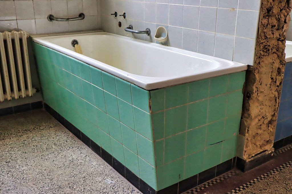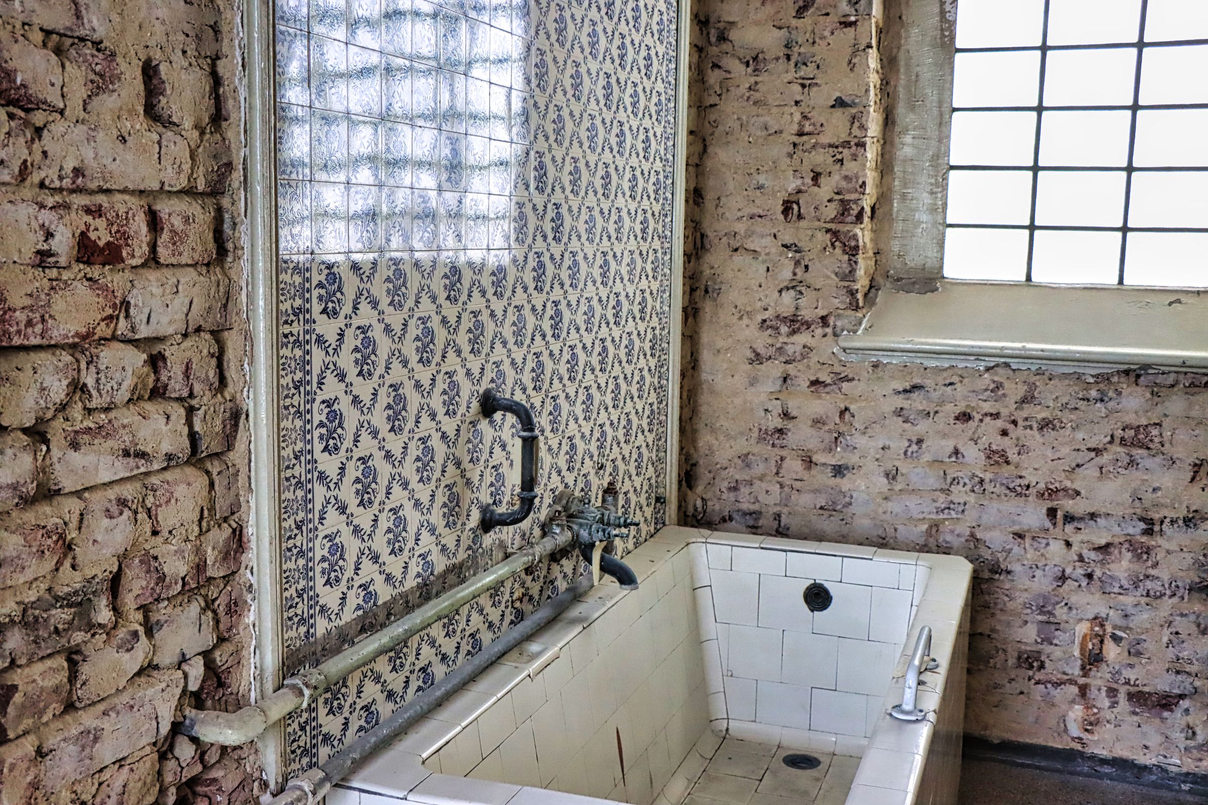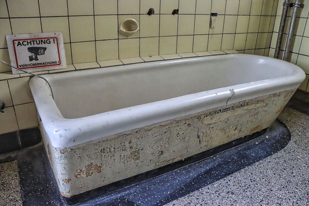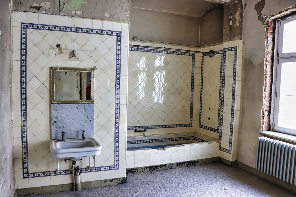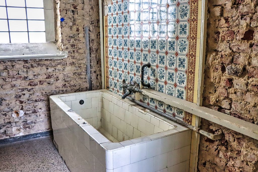 Damals waren allerdings das Damen- und das Herrenbad nicht zugänglich, so daß sich die Bildausbeute in Grenzen hielt. Jetzt geht es langsam wieder los mit Führungen und Fotosessions, wie die am letzten Wochenende. Natürlich muß man immer noch einen Bauhelm und dieses Mal sogar eine Kopflampe tragen, aber Sicherheit geht vor, denn nach wie vor ist das alte Stadtbad noch so etwas wie eine Baustelle. Die Räume in Parterre waren früher mal kleine Badezimmer, als es noch kein Bad in jeder Wohnung gab. Abgetrennte Räume mit Wannenbädern erster und zweiter Klasse und z.T. wunderschönen Kacheln an den Wänden und Fliesen auf dem Boden.