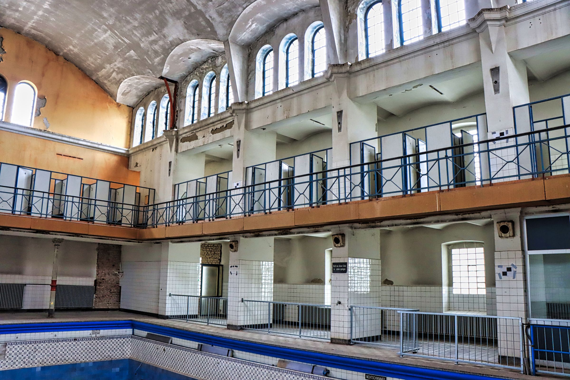 Im Jahr 1890 eröffnet, im Jahr 2000 für immer geschlossen. Im Jahr 2019 war ich das erste Mal hier im alten Krefelder Stadtbad. Unglaublich, daß das schon wieder 6 Jahre her ist. Und es hat sich einiges getan in der Zeit. Der Putz wurde von den Wänden geholt, neue Fenster wurden eingebaut und Sicherungen wurden integriert, daß einem nichts auf den Kopf fällt. Zum Aktionstag „Stadtbad open“ war ich das letzte Mal hier. Im August ging es in Workshops darum, eigene Ideen zum Fortbestand des Bades beizusteuern.