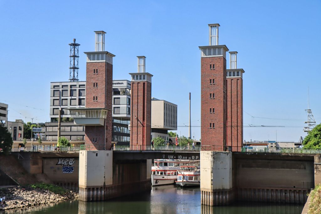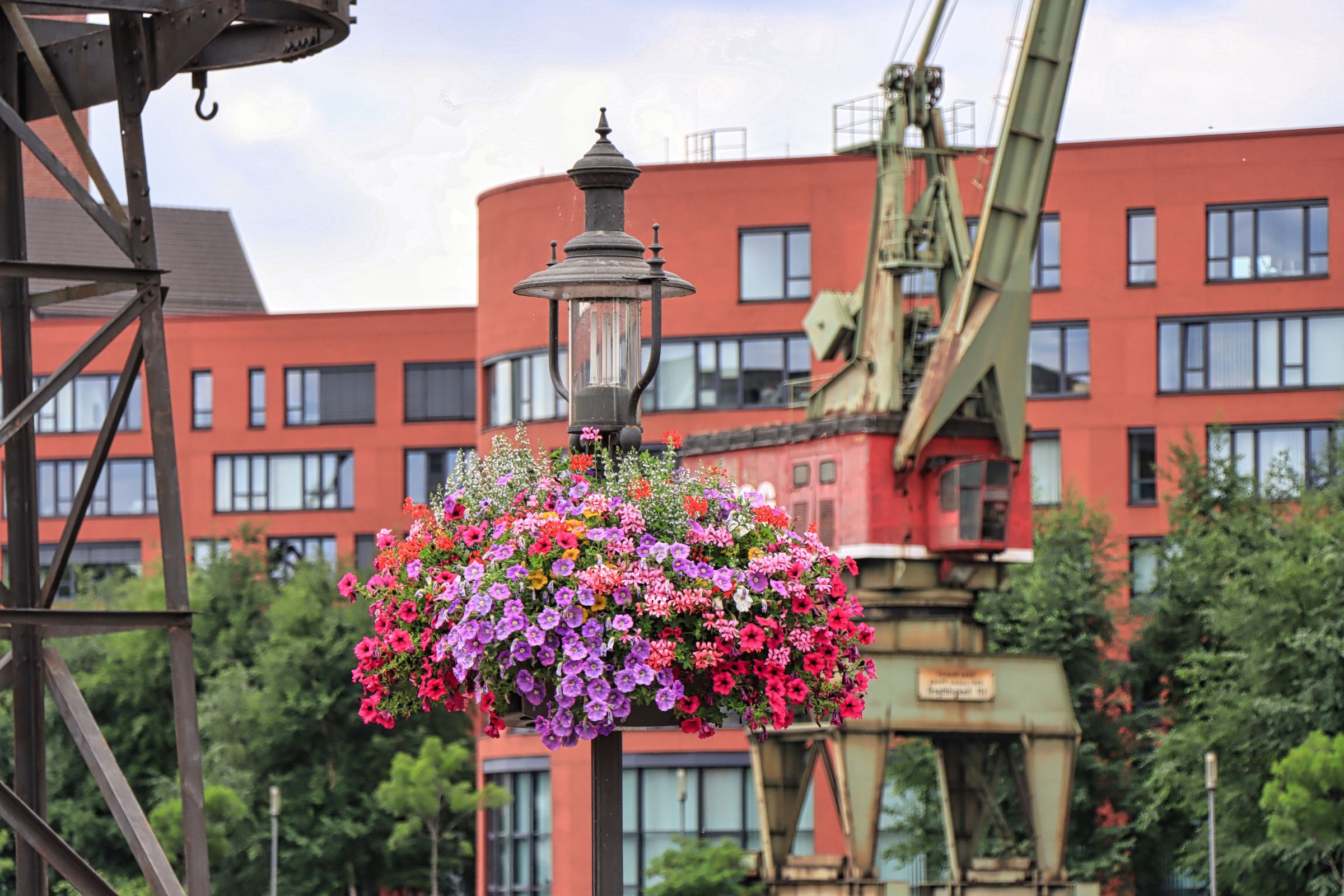 Wo ich nun einmal im Inenhafen war, habe ich einen Tag nach der Extraschicht dort noch ein paar Fotos gemacht. Während gerade Bühnen abgebaut wurden und die Wiesen mit hunderten von Flaschen doch arg vermüllt aussahen, habe ich das Schwanentor als Eingang zum Innenhafen seit langer Zeit mal wieder unverhüllt gesehen. Die Renovierung scheint beendet zu sein. Was mir schon beim letzten Mal aufgefallen ist, rund um die Marina hängen entlang der Laternen sehr schönen Blumenkübel.