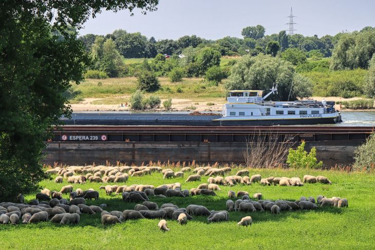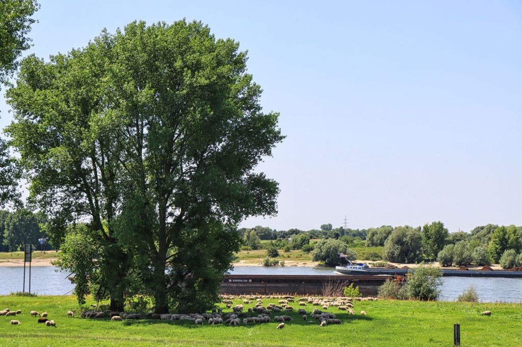 Mal sehen, was die Baustelle Rheinbrücke Neuenkamp (A40) so macht. Sie macht Fortschritte würde ich sagen, langsam schiebt sich die Fahrbahn des zweiten Bauabschnitts voran und irgendwann werden dann die beiden Brückenteile in der Mitte zusammengeschoben, was wieder eine Sperrung nach sich ziehen wird. Nachdem Asbest in der alten Brücke gefunden wurde, vermutet man die Fertigstellung irgendwann in 2028. Etwas unterhalb der Brücke zogen gerade die Schafe in ihr neues Quartier. Sie sind die lebendigen Rasenmäher auf den Rheinwiesen und am Rheindeich.
