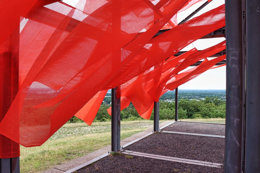 Das heißt aber auch, daß ich mehrfach Fotos auf den Landmarken des Reviers gemacht habe, zu verschiedenen Tages- und Jahreszeiten, bei Sonne und (ganz selten) bei Schnee. Dennoch kann ich nicht genug davon bekommen, das Ruhrgebiet und den Niederrhein von oben zu sehen. Seit diesem Wochenende gibt es eine neue Kunstinstallation auf der Halde Norddeutschland von Danuta Karsten mit dem Titel „Windzeichnung“. Das Hallenhaus wurde dazu mit roten Stoffbahnen verhängt, die sich im Wind bewegen. Ein schöner Aufmacher für diesen Beitrag. Die Installation ist bis zum Spätsommer auf der Halde zu sehen.