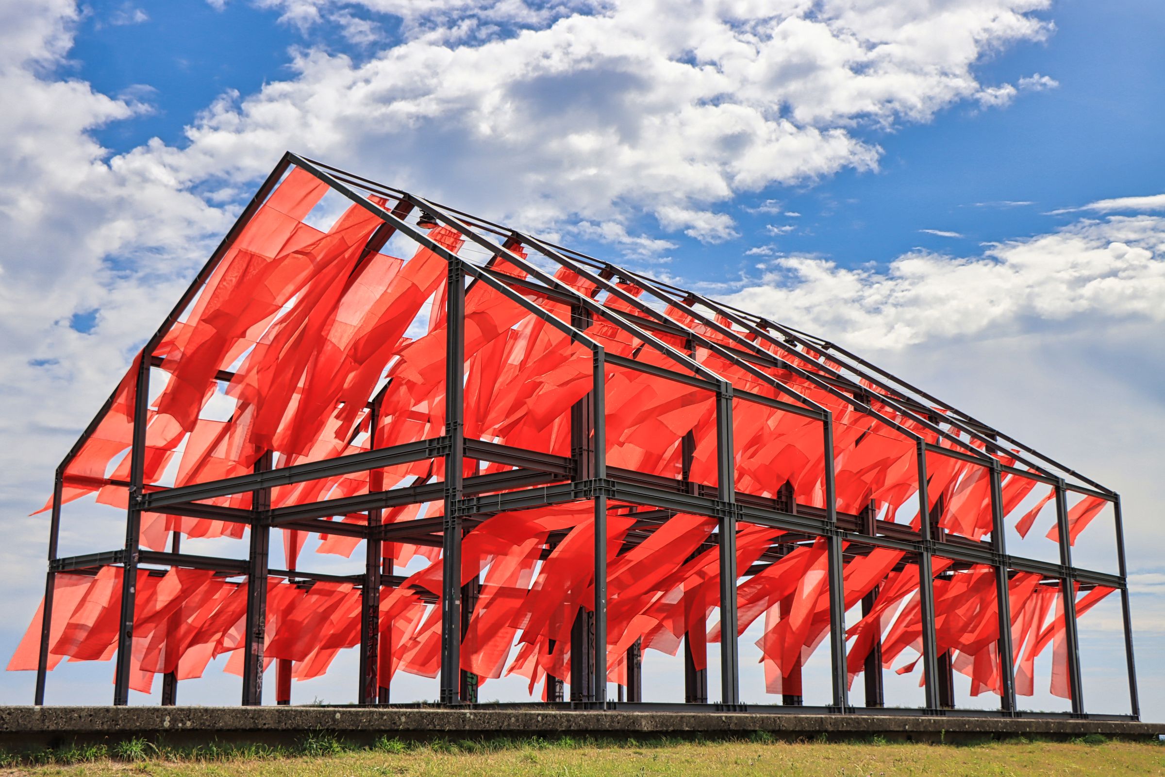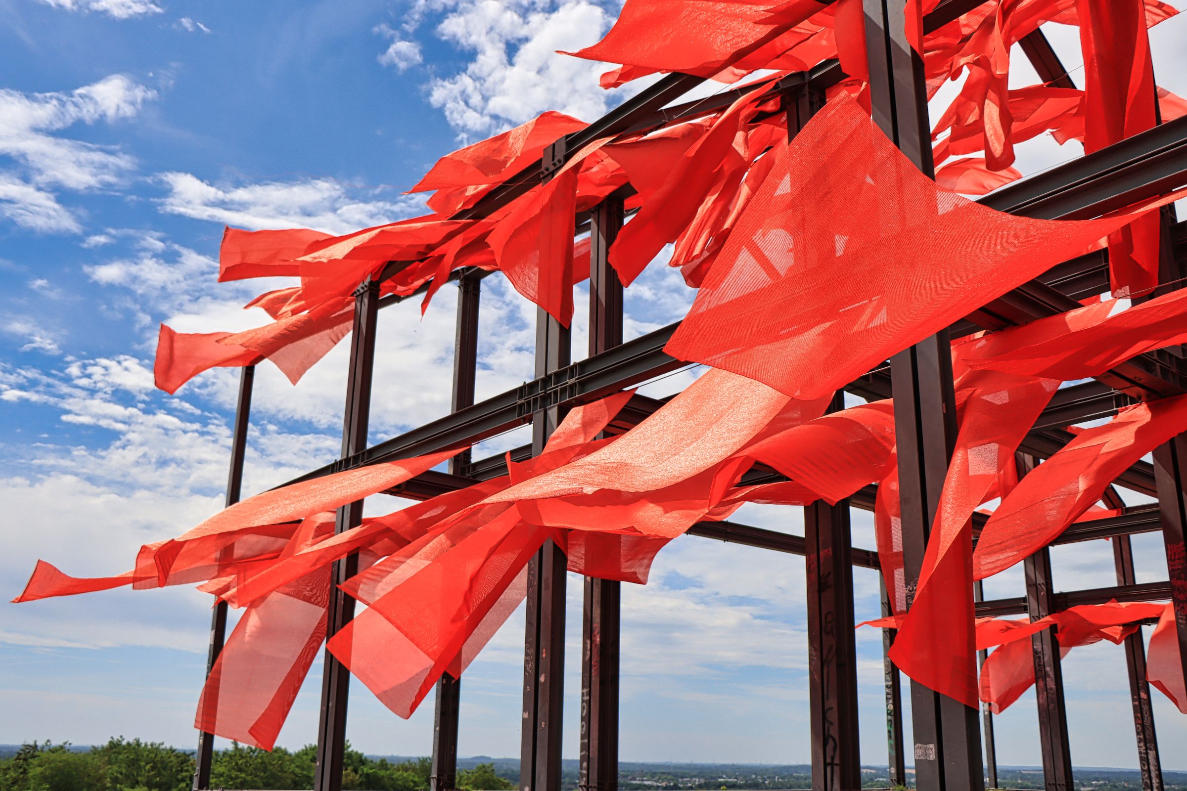 Das heißt aber auch, daß ich mehrfach Fotos auf den Landmarken des Reviers gemacht habe, zu verschiedenen Tages- und Jahreszeiten, bei Sonne und (ganz selten) bei Schnee. Dennoch kann ich nicht genug davon bekommen, das Ruhrgebiet und den Niederrhein von oben zu sehen. Seit diesem Wochenende gibt es eine neue Kunstinstallation auf der Halde Norddeutschland von Danuta Karsten mit dem Titel „Windzeichnung“. Das Hallenhaus wurde dazu mit roten Stoffbahnen verhängt, die sich im Wind bewegen. Ein schöner Aufmacher für diesen Beitrag. Die Installation ist bis zum Spätsommer auf der Halde zu sehen.