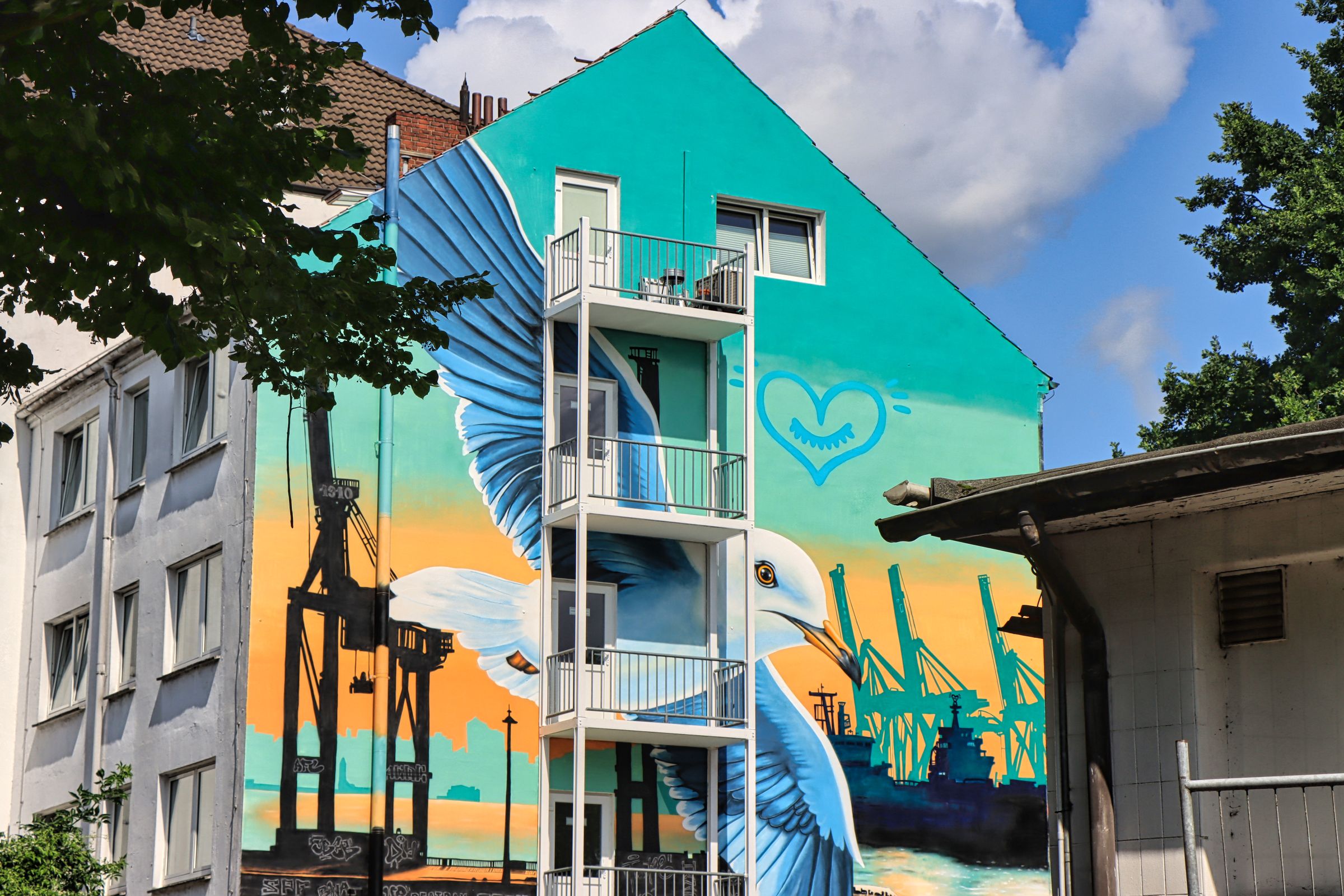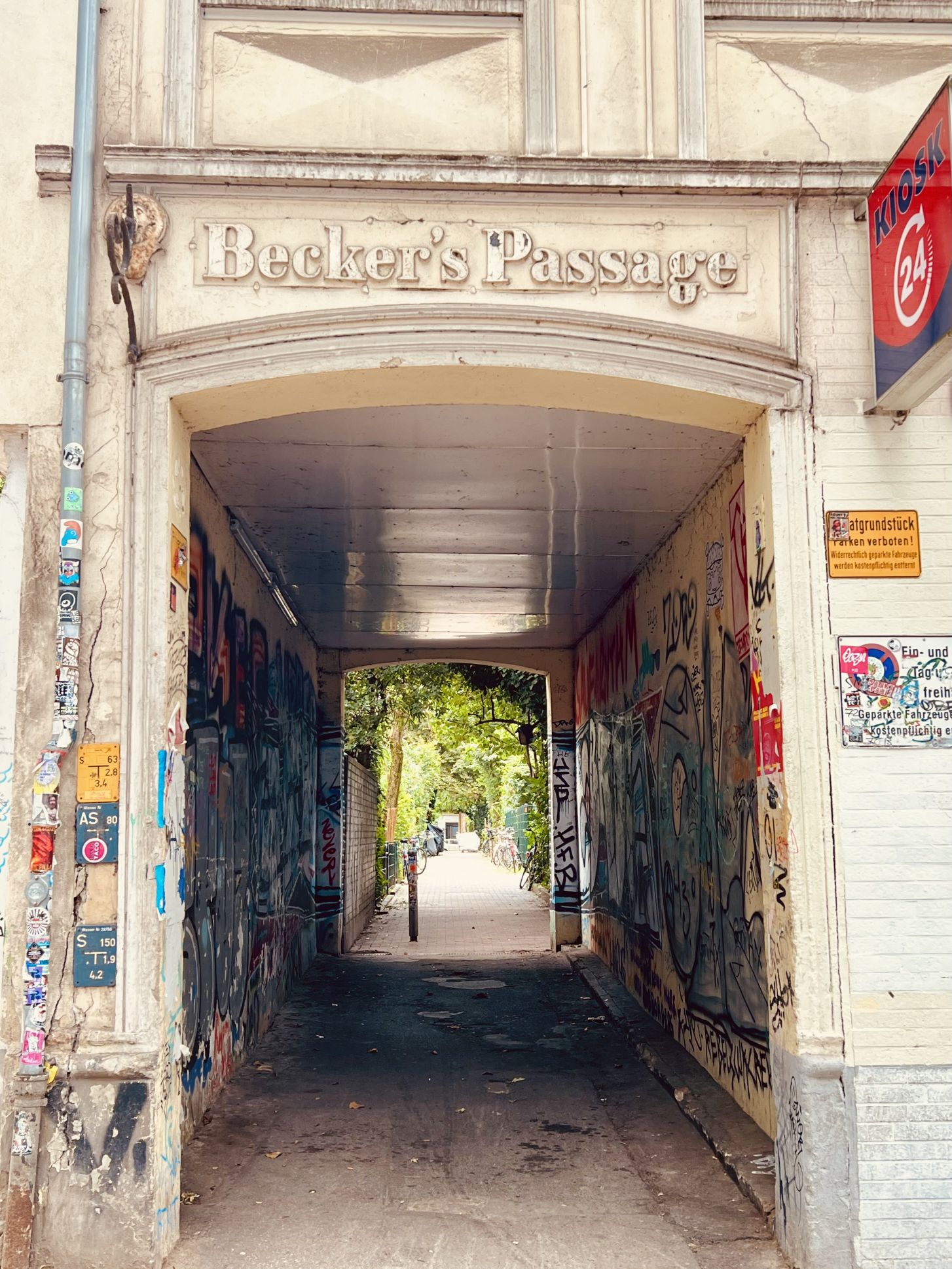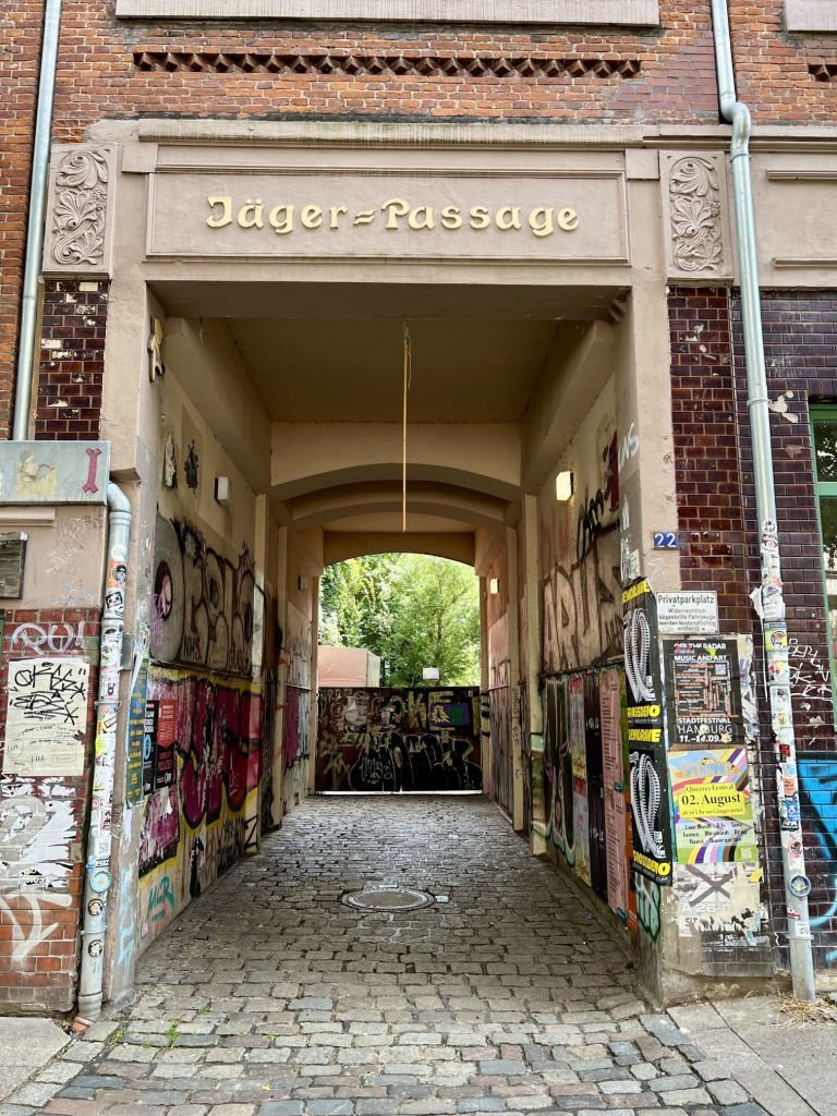Apropos St. Pauli, ich hatte gelesen, daß es in einigen Straßen noch alte Passagen gibt, die über eine Art Hinterhof zwei parallel verlaufende Straßen miteinander verbinden. Zum wohnen sicher total schön, optisch nun ja, entscheidet selber. Bei der Suche sind mir auch gleich noch ein paar StreetArt Motive begegnet, die ich euch hier gerne zeige. Die grimmigen Herren sind Teil einer der o.g. Passagen.