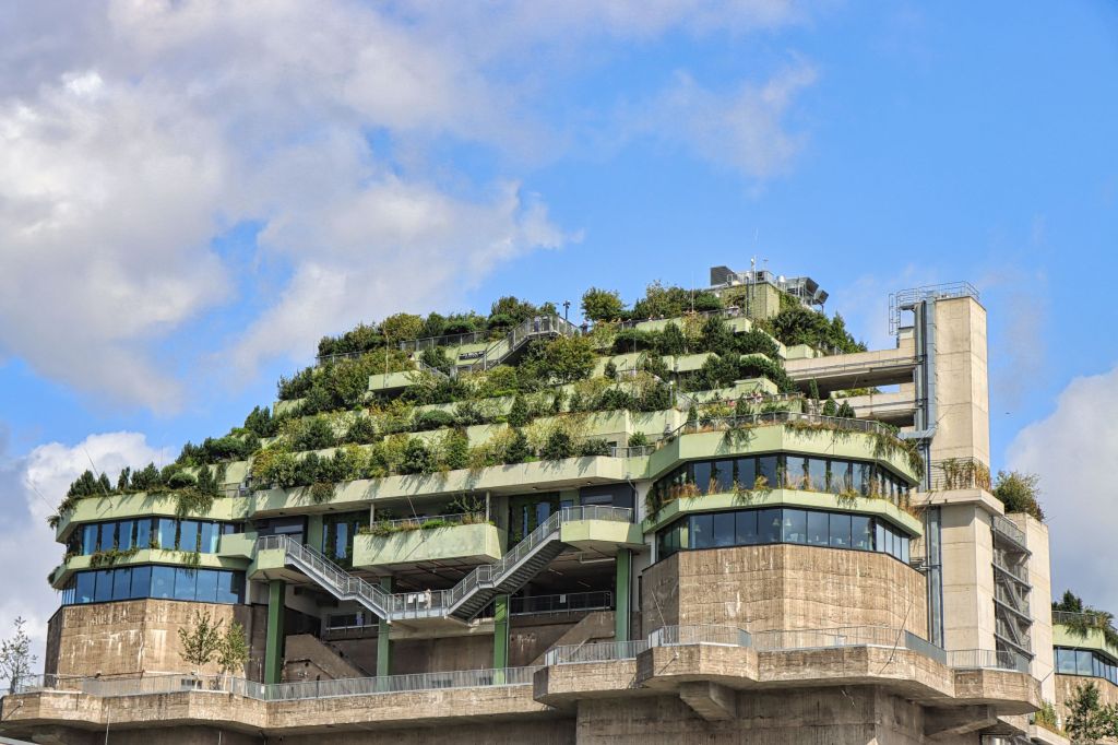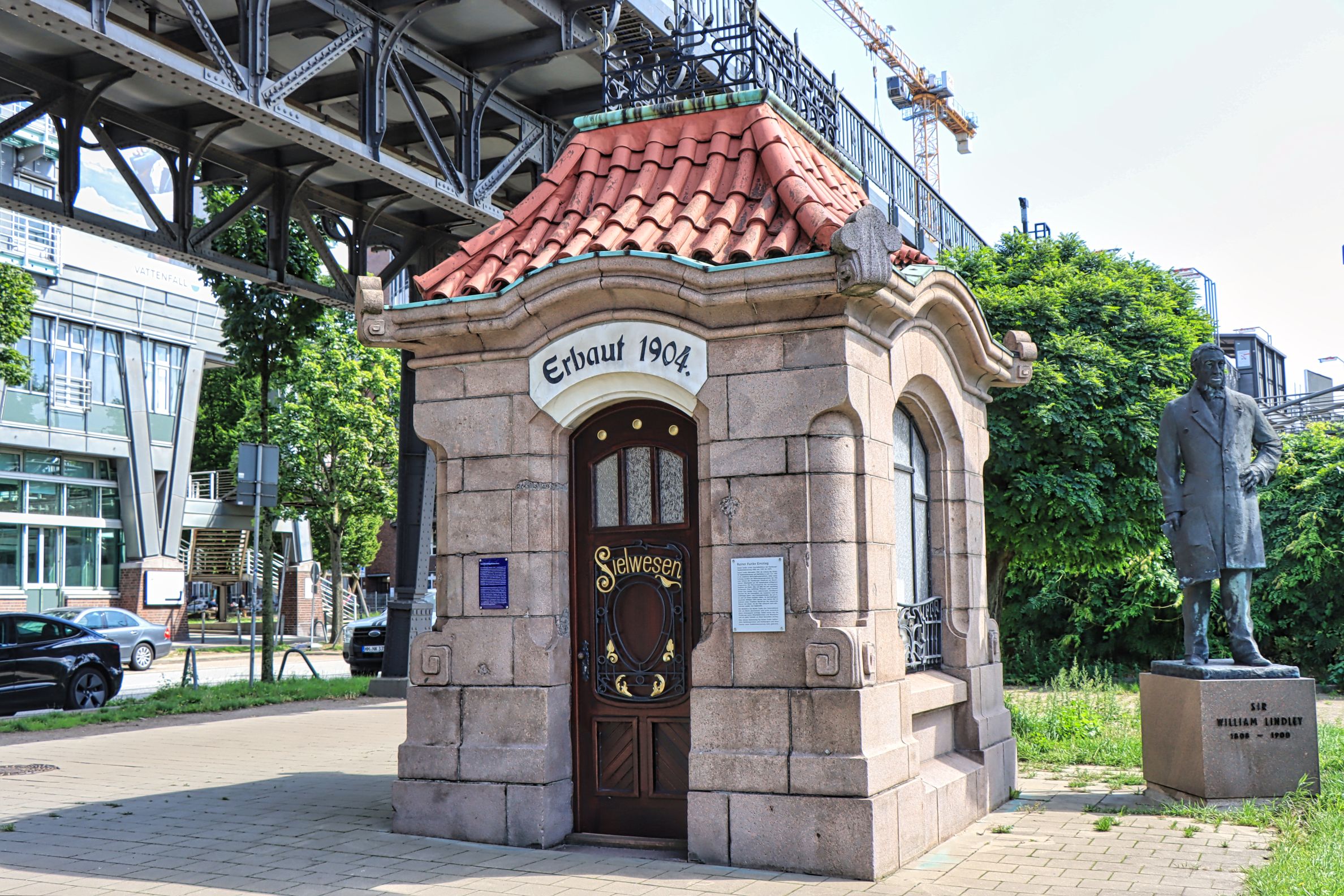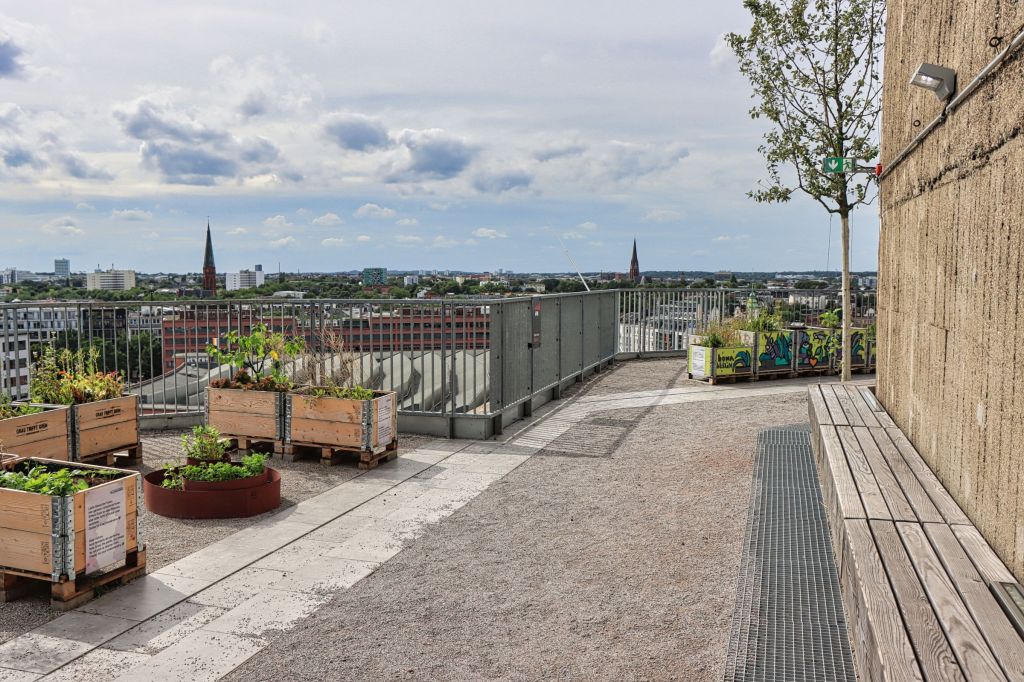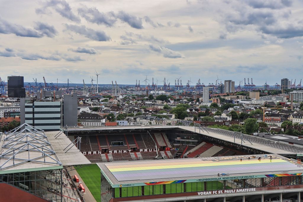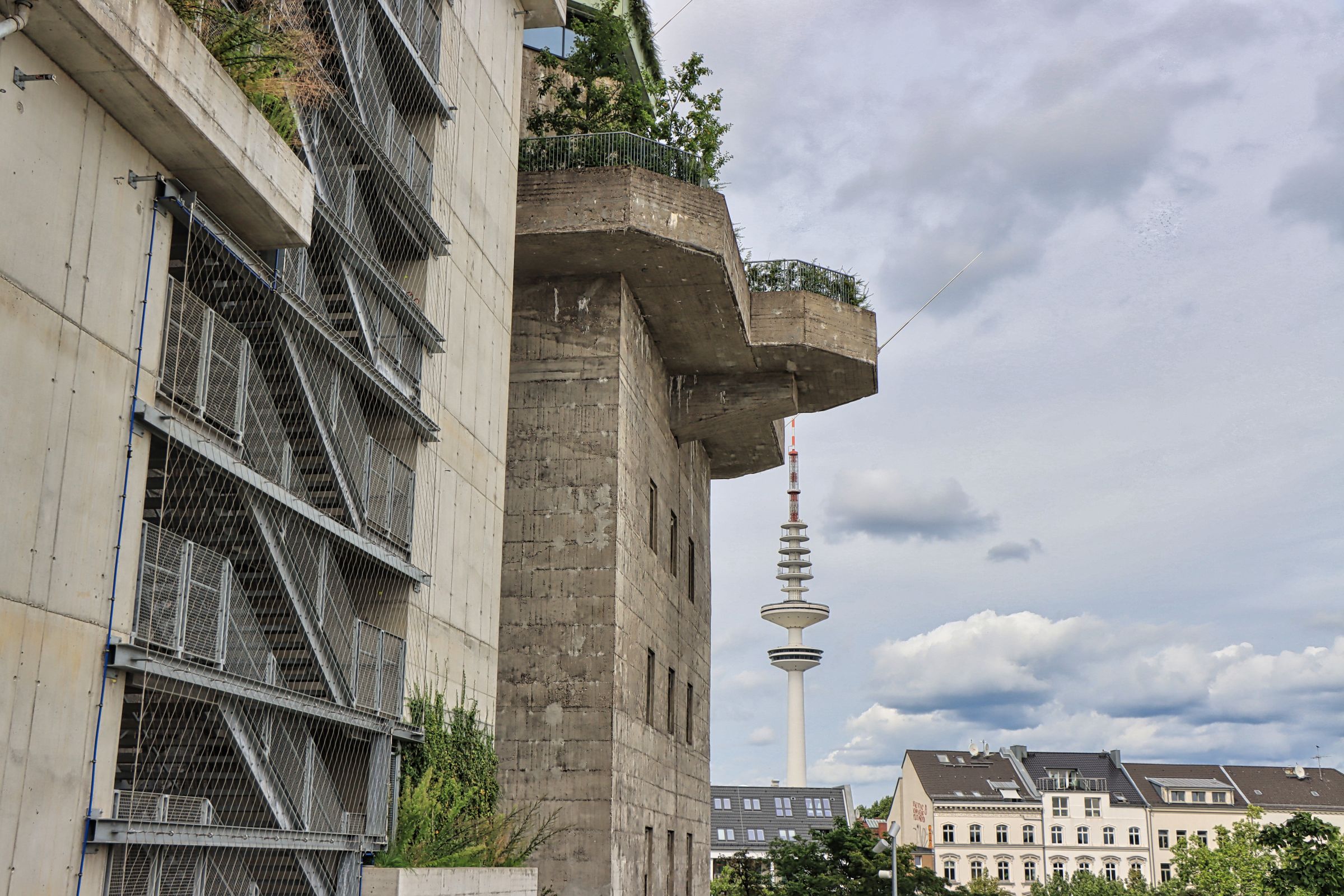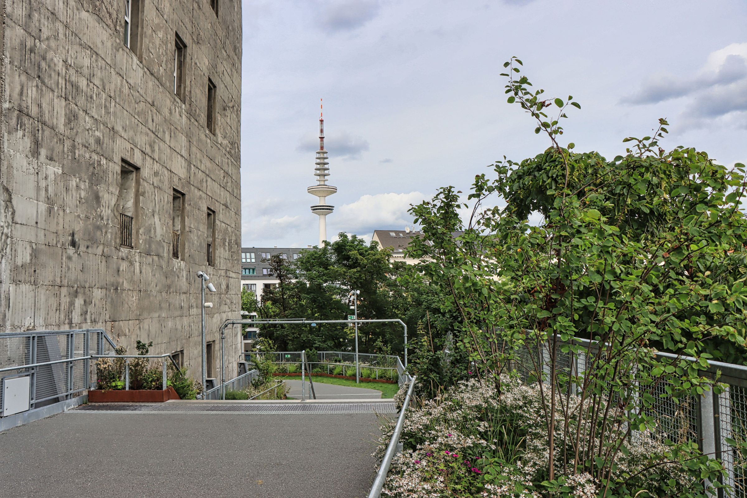 Nur einen Steinwurf von der U-Bahn Station Feldstraße liegt am Heiligengeistfeld der nicht zu übersehende Hochbunker. Lt. Wikipedia wurde er im Jahr 1942 von 1.000 Zwangsarbeitern in 300 Tagen zum Schutz der Hamburger Bevölkerung erbaut. Die Grundfläche des Bunkers mißt 75 × 75 Meter, er ist ursprünglich 38 m hoch, hat eine Wandstärke von 3,5 m und einer Deckendicke von 5 m. Nun, es gibt hübschere Gebäude, daher wurde der Flakbunker zum grünen Bunker umgebaut, um 20 m erhöht und mit hunderten von Treppenstufen sowie Büschen und Bäumen versehen. Aktuell ist das Betreten durch ein Drehkreuz kostenfrei möglich (Taschen mußten vorgezeigt werden, ich glaube Getränke waren nicht erlaubt).
