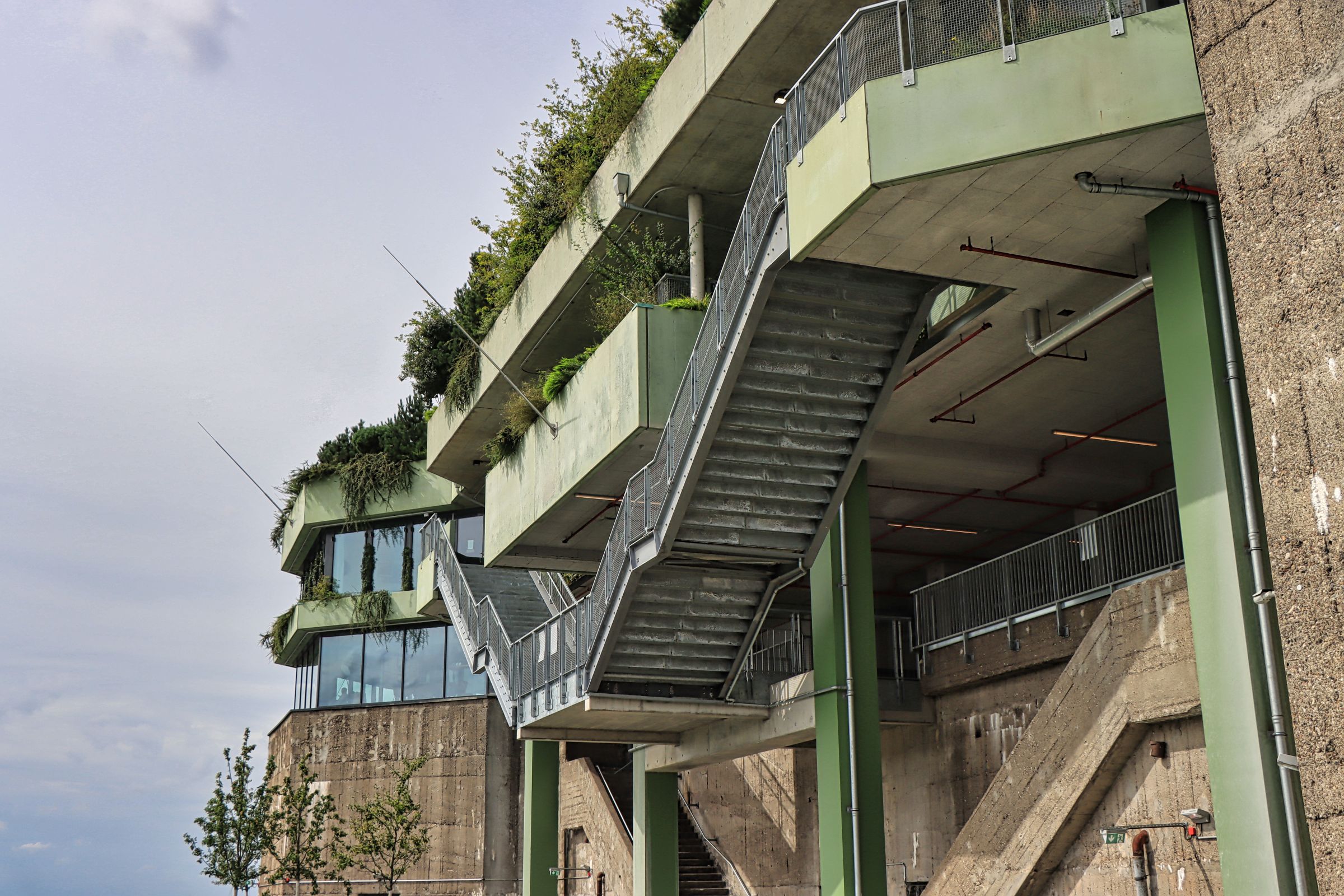 Der Weg hoch ist sehr treppenreich, aber breit genug. Man merkt gar nicht, daß man außen am Gebäude nach oben geht. Auf Höhe der ehemaligen Flakgeschütze kann man einmal um den ganzen Bunker herumgehen mit einer tollen Aussicht über die Stadt. Oben angekommen gibt es, wenn man möchte ein kühles Getränk.