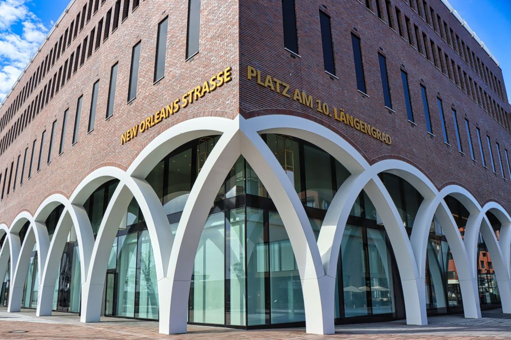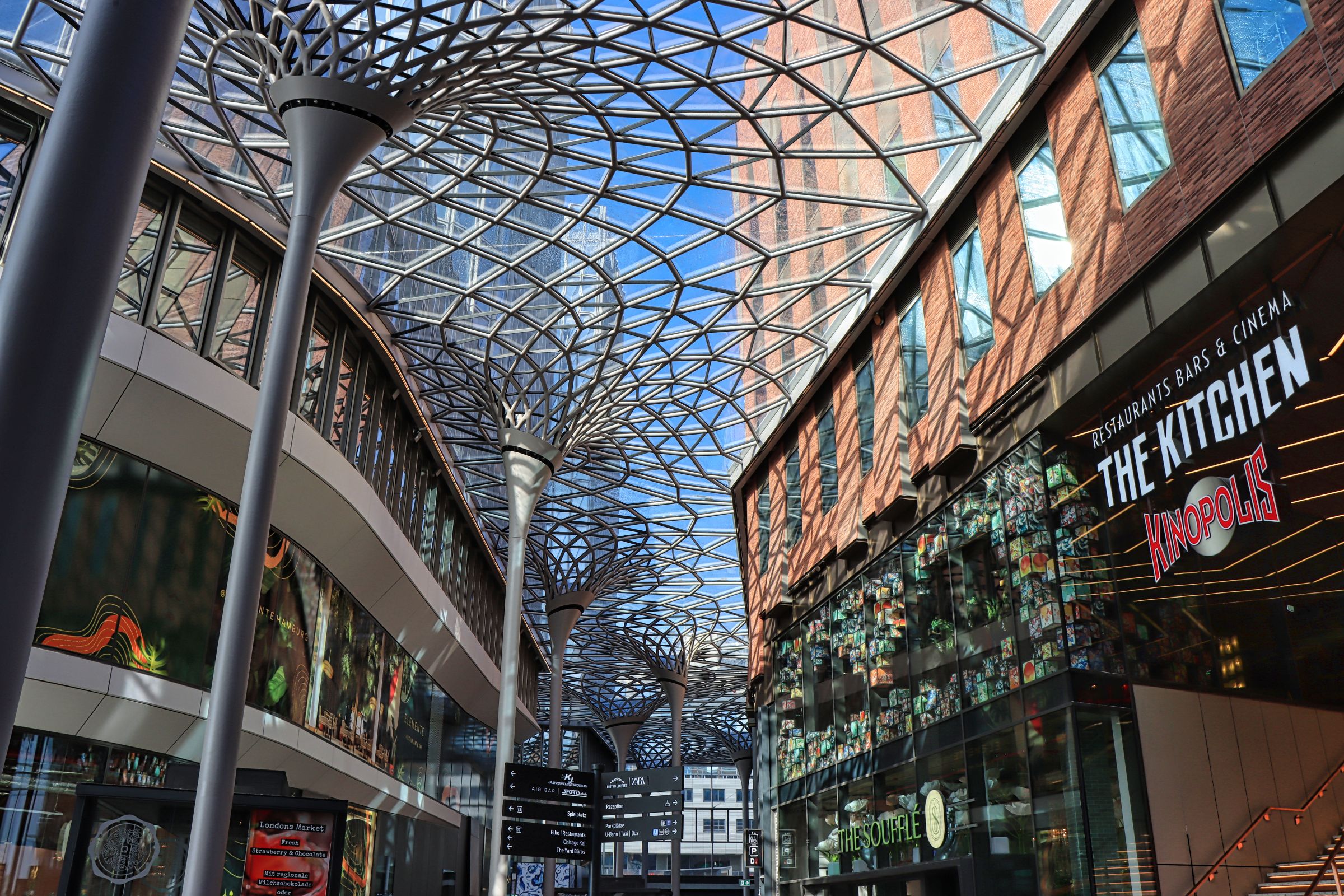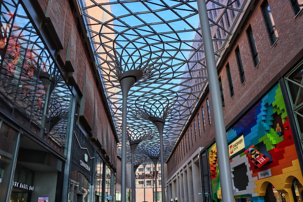 Der folgende Morgen überraschte mit Sonne. Also ab ins Einkaufscenter Überseequartier, das im Frühjahr neu eröffnet hat. Von meinem Hotel ein gemütlicher Fußweg von ca. 10 Minuten. Um 09:30 Uhr ist es noch schön leer in den Gängen, genug Zeit ein paar Bilder zu machen. Optisch ist es schon ein Hingucker geworden. Da es beim Bau aber gleich mehrere, nennen wir es unglückliche Zwischenfälle gab, wurde an einer Bank vor der Türe den verstorbenen Arbeitern mit einer Tafel gedacht. Als ich später am Tag nochmal dort war (im Tiefgeschoß ist ein REWE), war es mir definitiv zu voll.