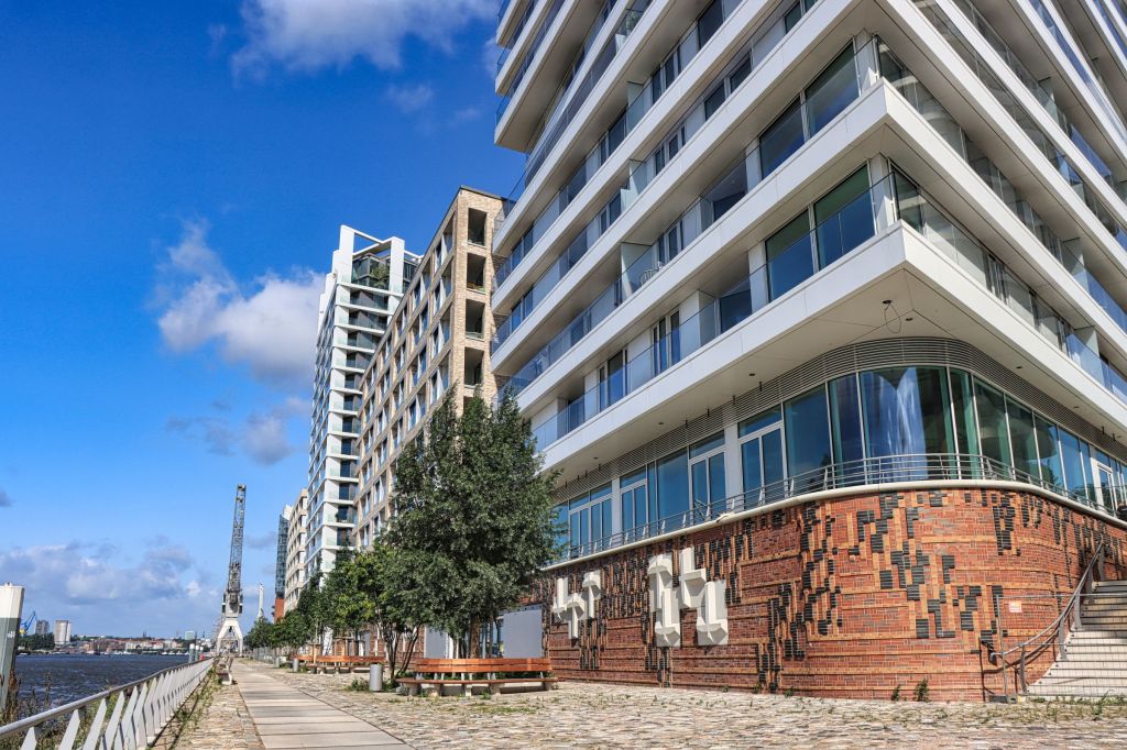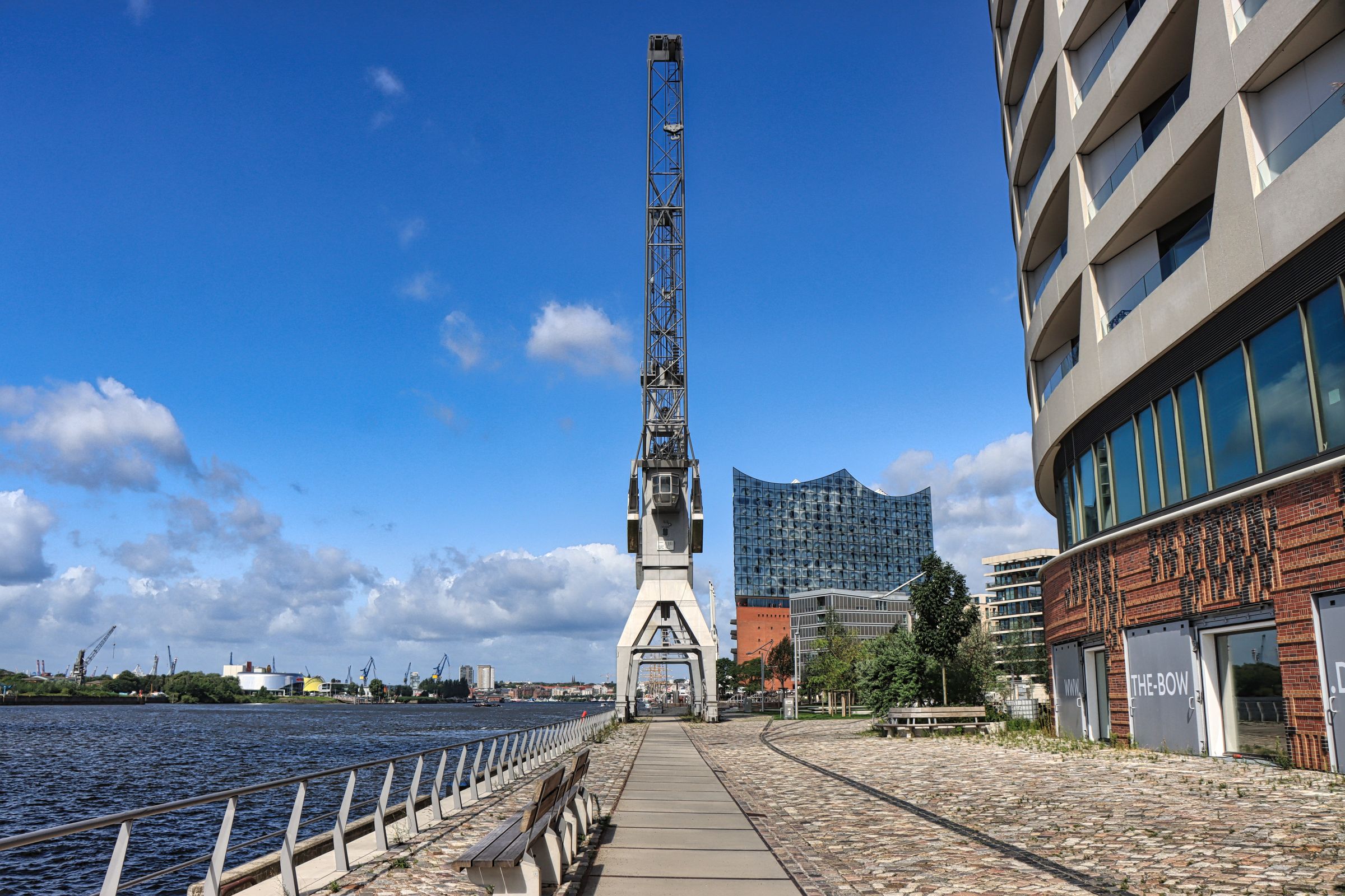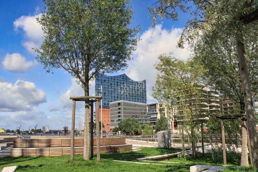 Ich laufe ein paar Ecken weiter zum Strandhöft. Ihr kennt den Teil der Hafencity vielleicht durch den Marco-Polo-Tower, der bereits 2010 gebaut wurde. Hier stehen nun auch die letzten Gebäude, lediglich die Arbeiten an einigen Wegen liefen noch. Der Weg bis an die Spitze des Strandhöfts (über Strand- bzw. Hübenerkai) ist aber seit dem Frühjahr 2025 zugänglich. Mit bestem Blick auf die Elbphilharmonie und auf den gegenüberliegenden Steinwerder Hafen, könnte man hier gut einen ganzen Nachmittag aushalten. Aber ich wollte ja weiter.