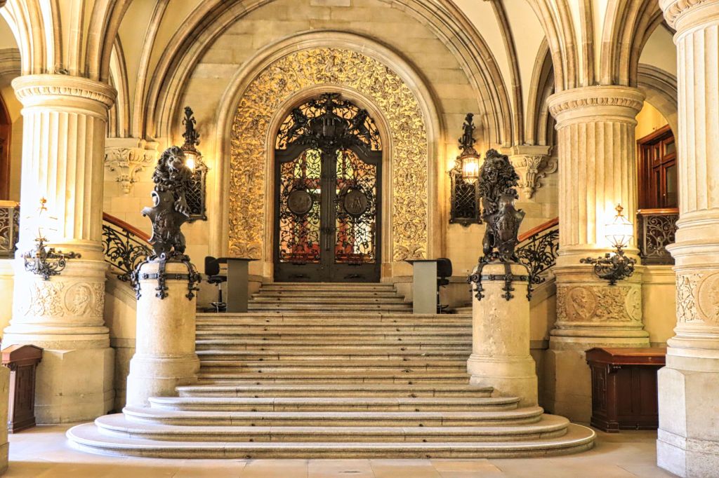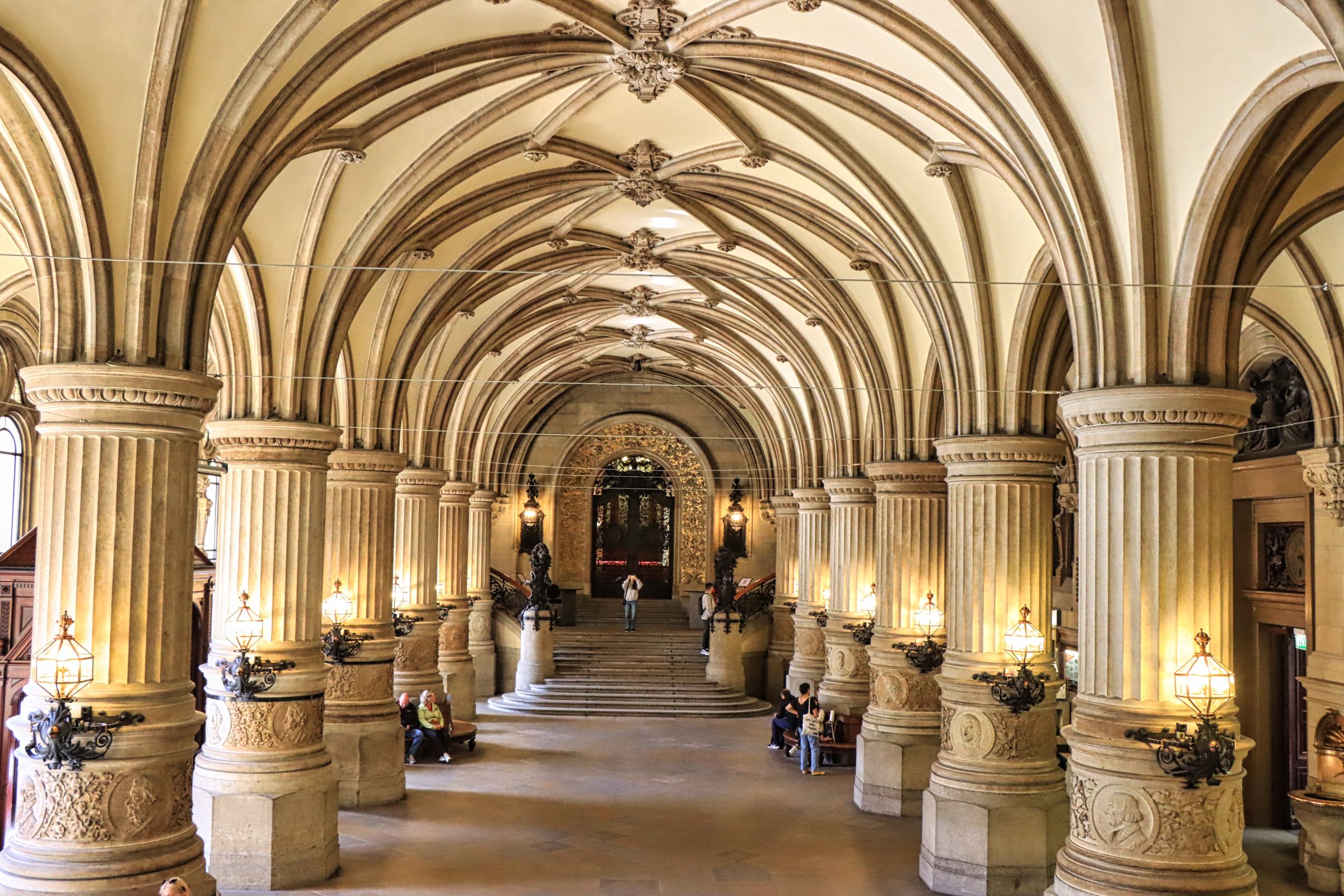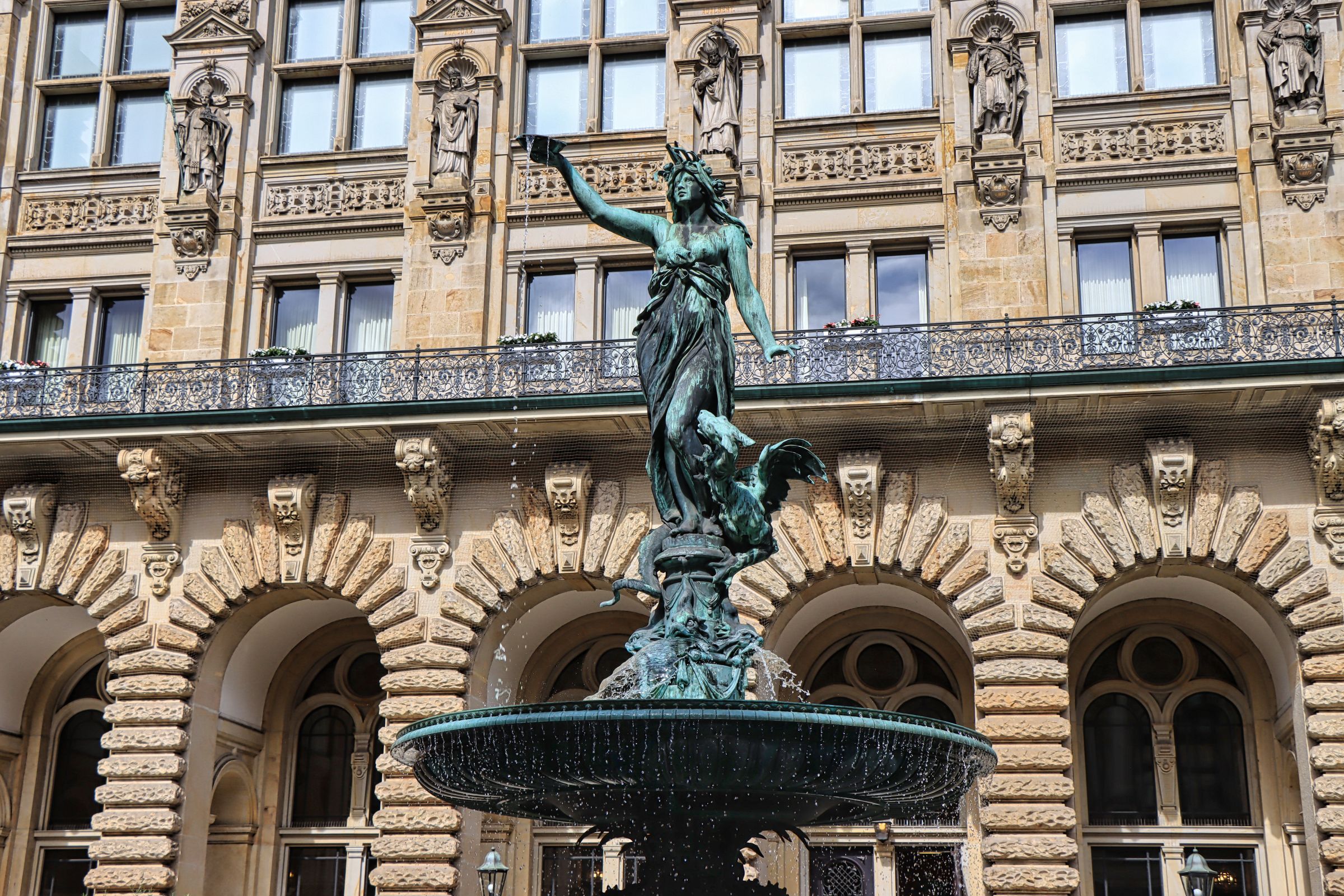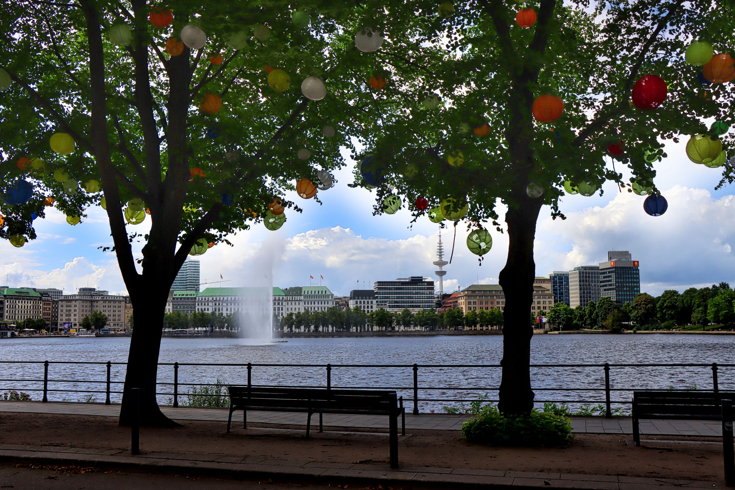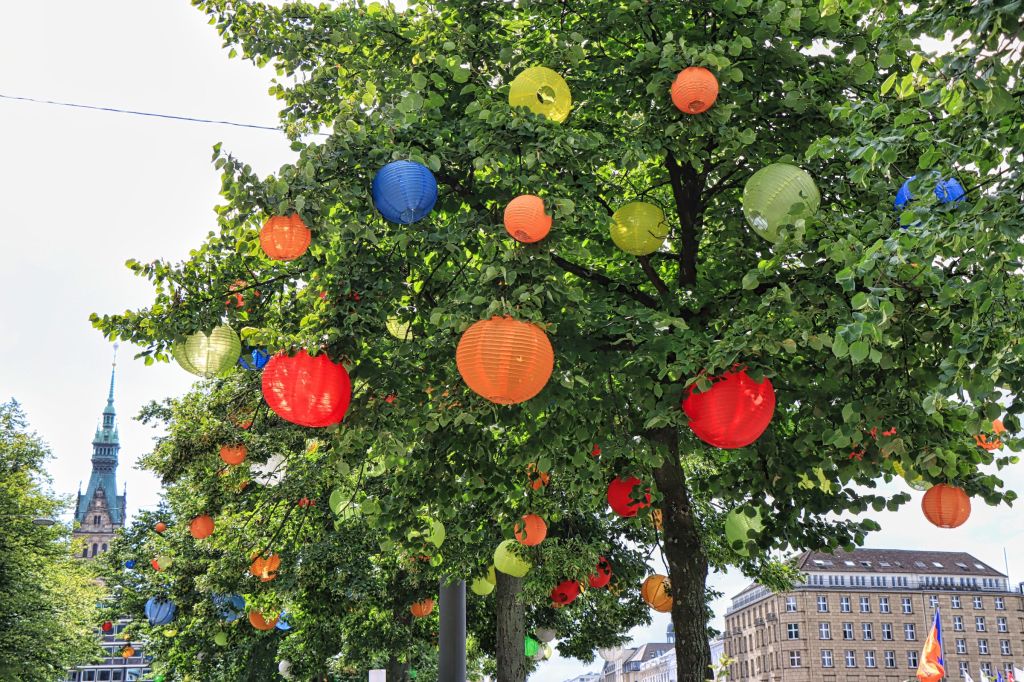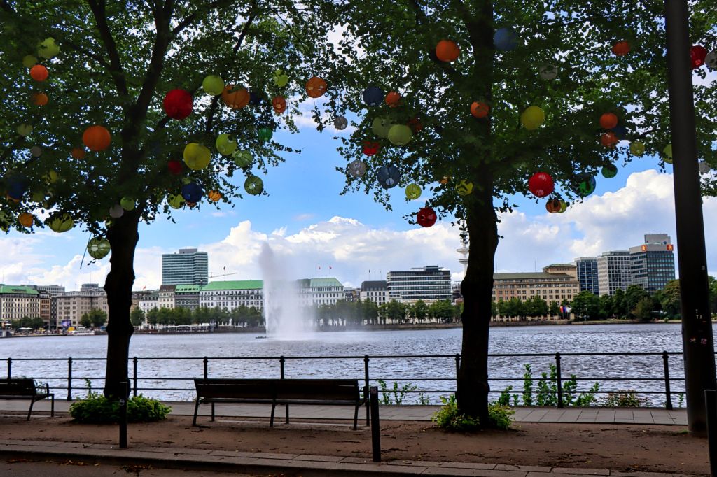 Mein nächstes Ziel war das Hamburger Rathaus, daß ich vor vielen Jahren mal besucht habe. Die Türen ins Innere und auf den Innenhof stehen offen und ich sag mal so, man sollte es sich (nochmal) mal angucken, es lohnt sich. Einige Meter entfernt liegt, aber das wißt ihr natürlich, die Alster und ich habe die eine Bank gesucht. Na gut es gab auch noch 3-4 andere, aber diese eine war nicht in Benutzung, also optimal um die Alsterfontäne und die Bäume abzulichten, die auch dieses Jahr wieder mit vielen bunten Lampignons geschmückt sind. Verpaßt habe ich (wie ich später gelesen habe) die passenden bunten Blumenbeete, aber ich sprenge ja auch so schon das Bildangebot dieses Blogbeitrags.