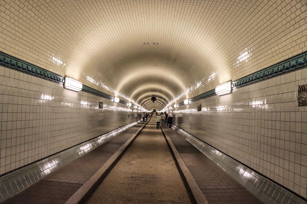 Jetzt hatte ich Hunger auf ein Fischbrötchen und weil die Brücke 10 an den Landungsbrücken kein Geheimtipp mehr ist, bin ich durch den alten Elbtunnel auf die andere Elbseite nach Steinwerder. Dort gibt es nämlich auch eine Verkaufsstelle der Brücke 10. Ein Brötchen mit Bismarckhering und eine Flache Astra Kiezmische waren dann auch mein Geburtstagsmahl. Ja, richtig gelesen, Geburtstag mit Blick auf die Landungsbrücken, den Michel und die Elphi. Auch wenn ihr nur wenig Zeit in Hamburg habt, nehmt euch die Zeit den alten Elbtunnel zu durchqueren (zu Fuß dauert das für die 426 m ca. 10-15 Min.) und blickt mal von der anderen Seite auf Hamburg. Ihr dürft übrigens den Autoaufzug nutzen, denn Autos fahren hier schon länger nicht mehr durch.