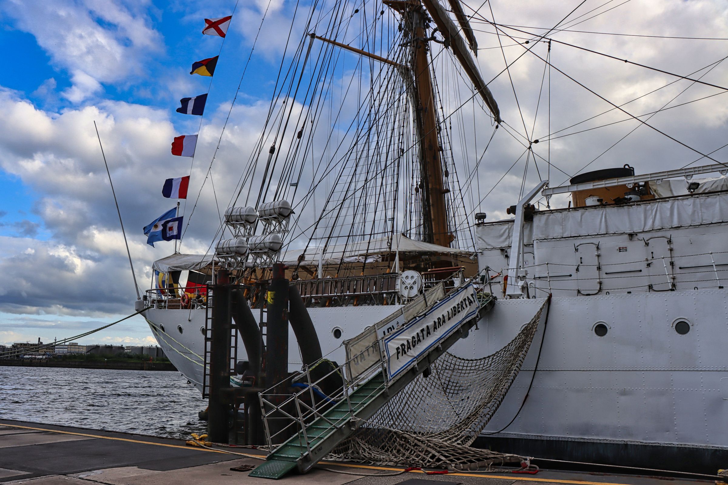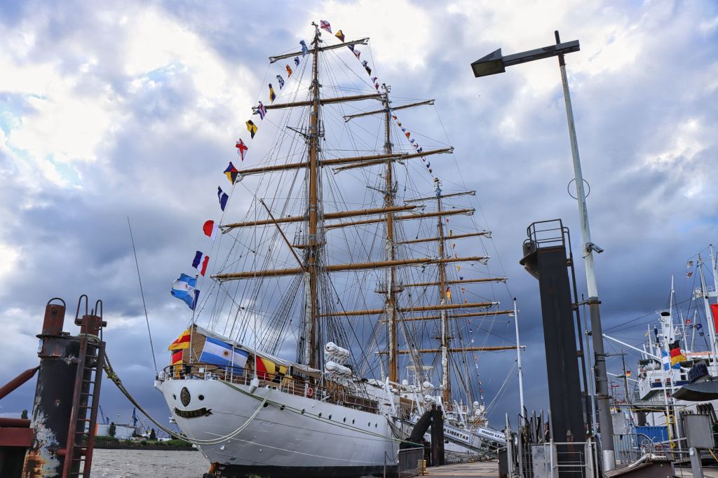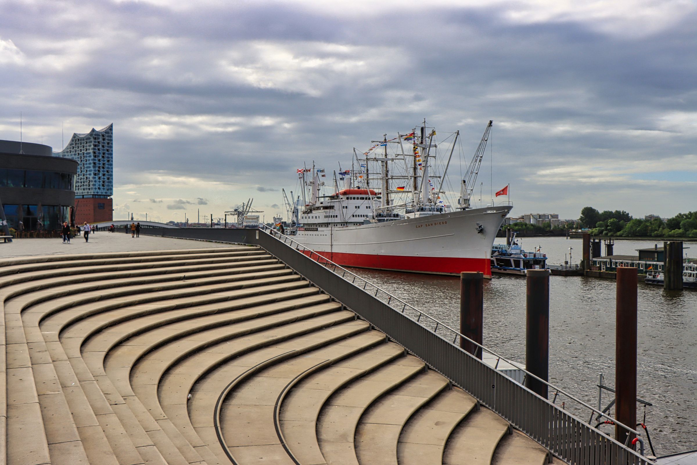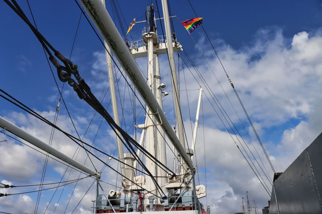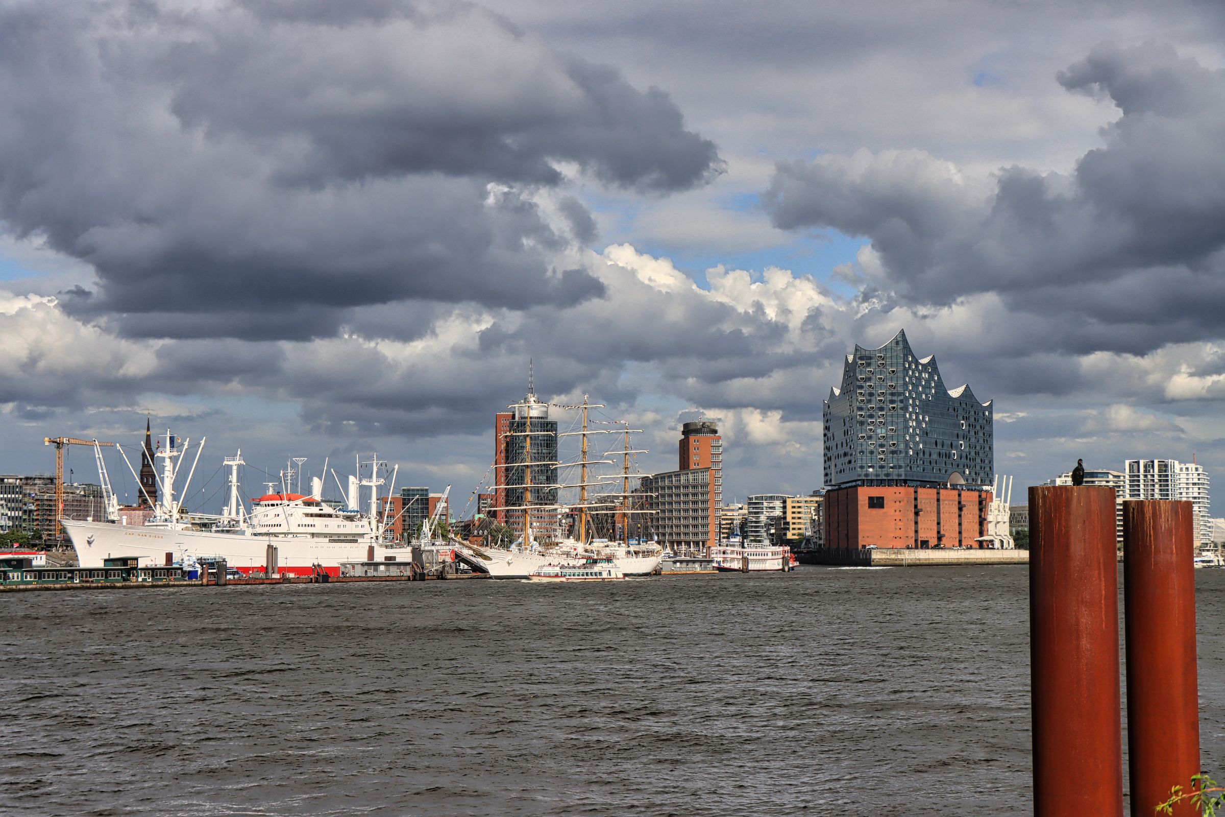 Erst als ich wieder zurück bin fällt mir auf, daß an der Überseebrücke ein Segelschiff liegt. Nanu, seit wann liegt denn da ein Dreimaster, das mußte ich mir näher ansehen, obwohl die dunklen Wolken nahten. Es war die Libertad, ein Schulschiff der argentinischen Marine. An den folgenden Nachmittagen konnte man das Schiff sogar besichtigen. Ich bin allerdings erstmal auf die Überseebrücke geflüchtet, denn jetzt zog so ein richtig dicker Regenschauer über den Hafen hinweg. Die sonnigen Bilder stammen daher vom nächsten Tag. Da habe ich mich zwischen Jan-Fedder-Promenade und Landungsbrücken rumgetrieben und mich auch spontan entschlossen, doch mal die Cap San Diego zu besuchen.