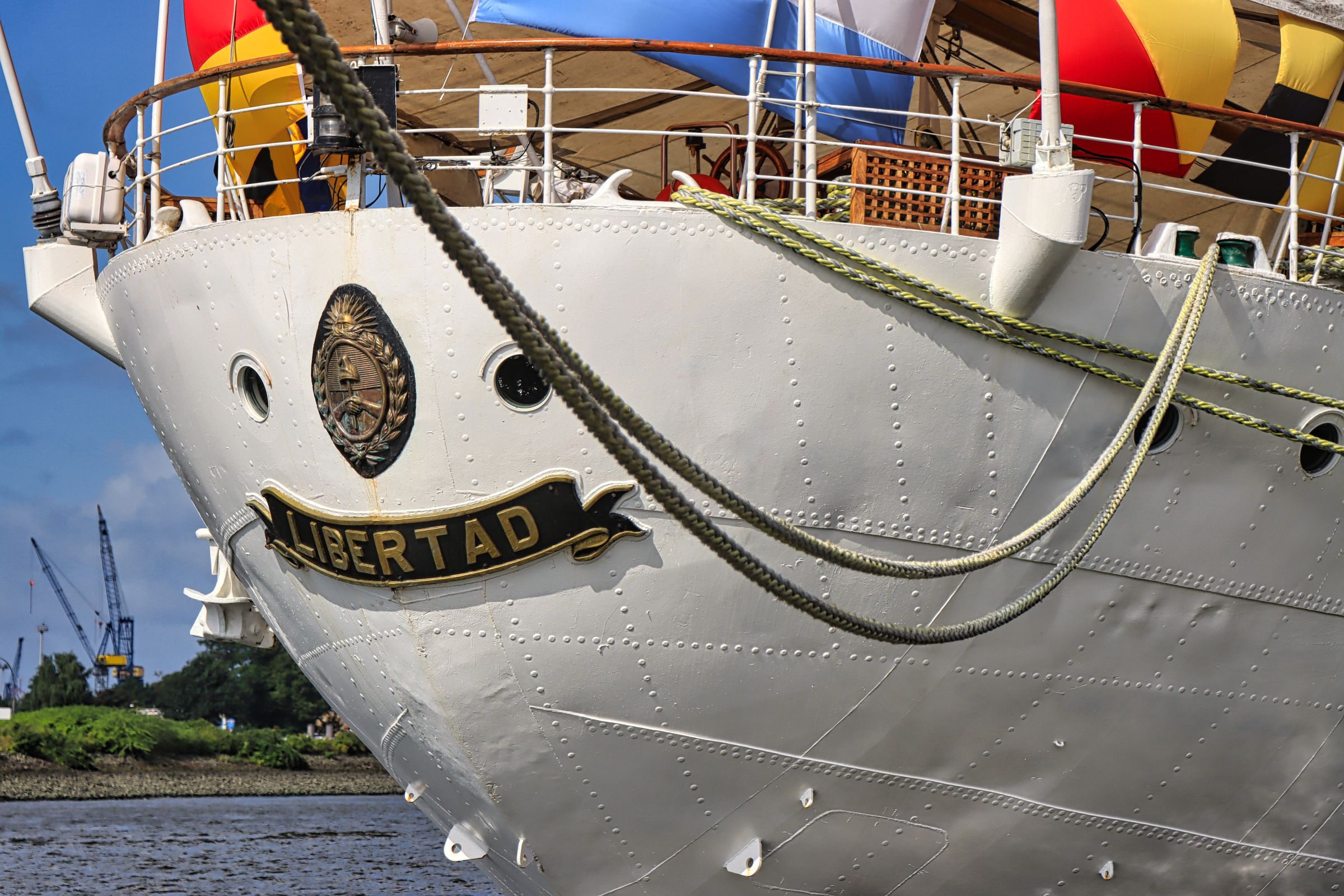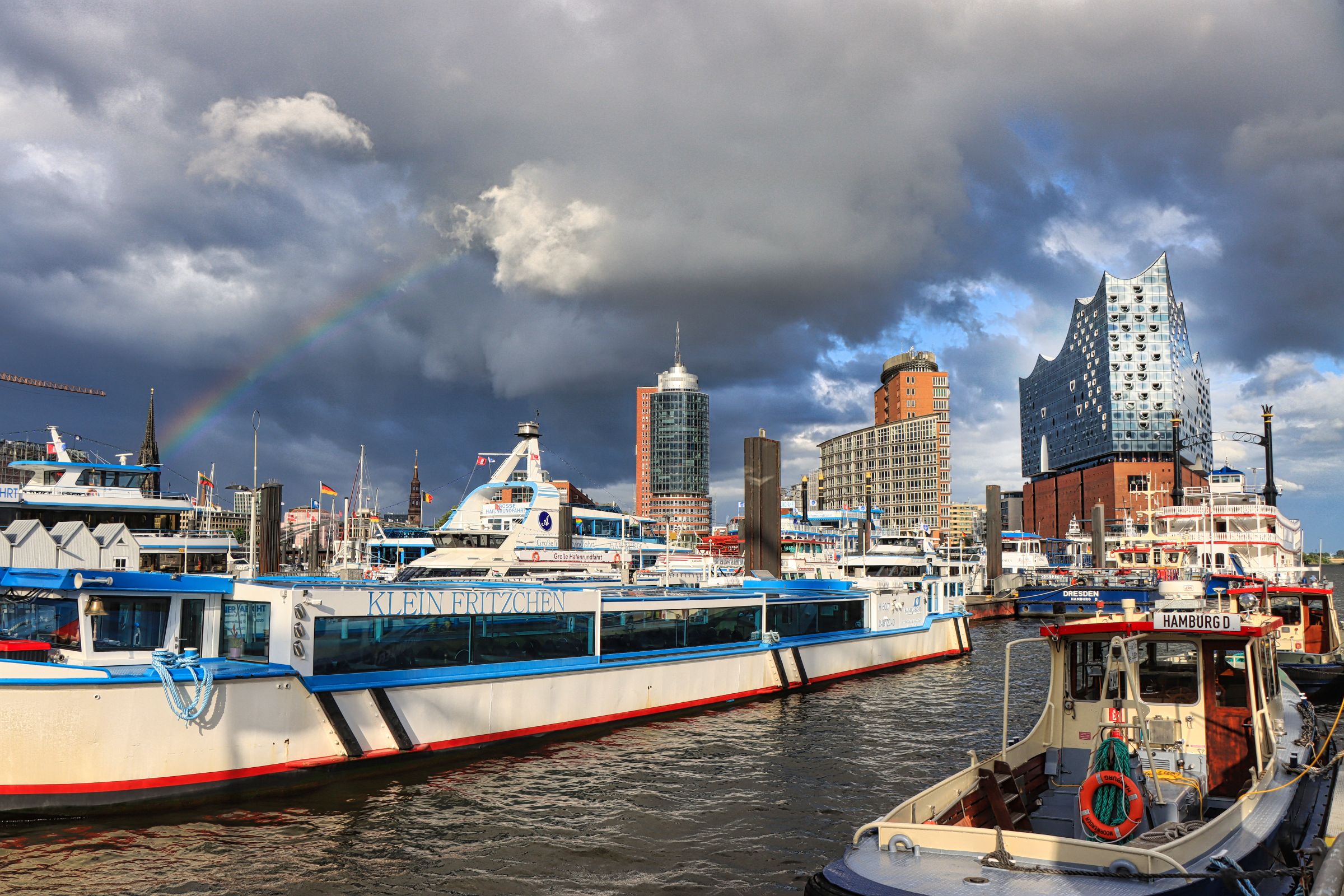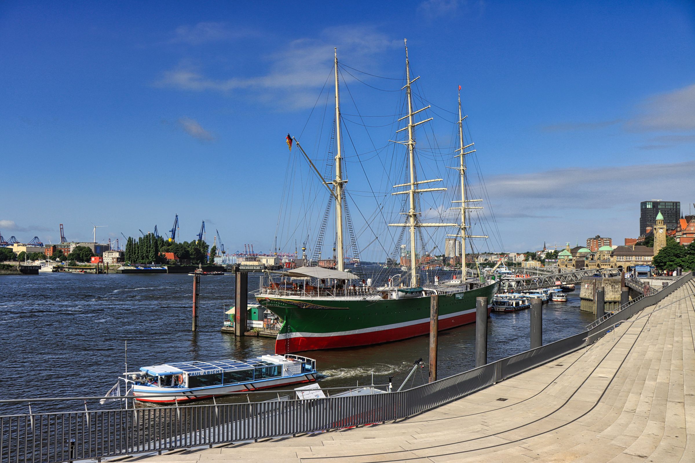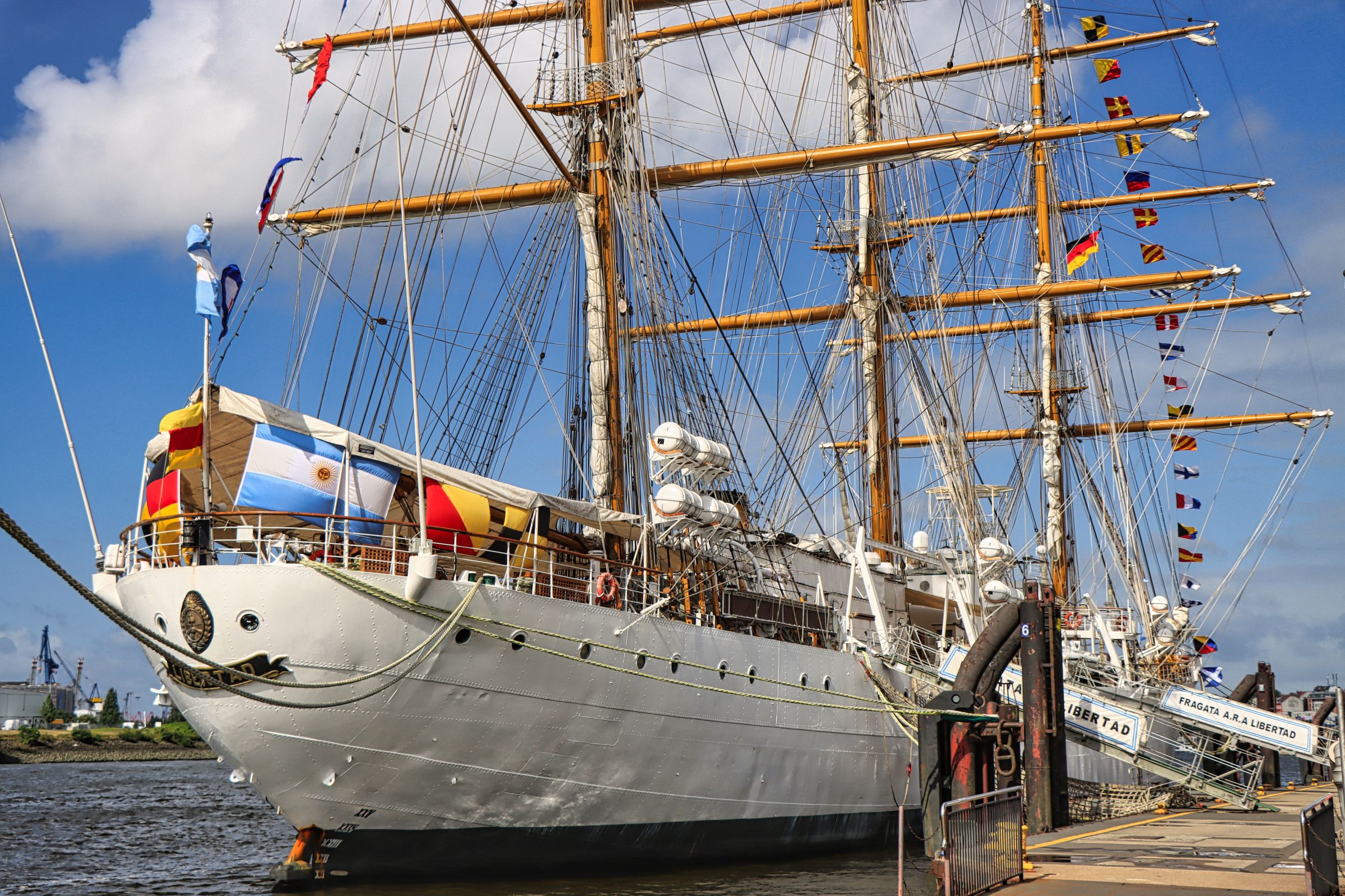 Erst als ich wieder zurück bin fällt mir auf, daß an der Überseebrücke ein Segelschiff liegt. Nanu, seit wann liegt denn da ein Dreimaster, das mußte ich mir näher ansehen, obwohl die dunklen Wolken nahten. Es war die Libertad, ein Schulschiff der argentinischen Marine. An den folgenden Nachmittagen konnte man das Schiff sogar besichtigen. Ich bin allerdings erstmal auf die Überseebrücke geflüchtet, denn jetzt zog so ein richtig dicker Regenschauer über den Hafen hinweg. Die sonnigen Bilder stammen daher vom nächsten Tag. Da habe ich mich zwischen Jan-Fedder-Promenade und Landungsbrücken rumgetrieben und mich auch spontan entschlossen, doch mal die Cap San Diego zu besuchen.
