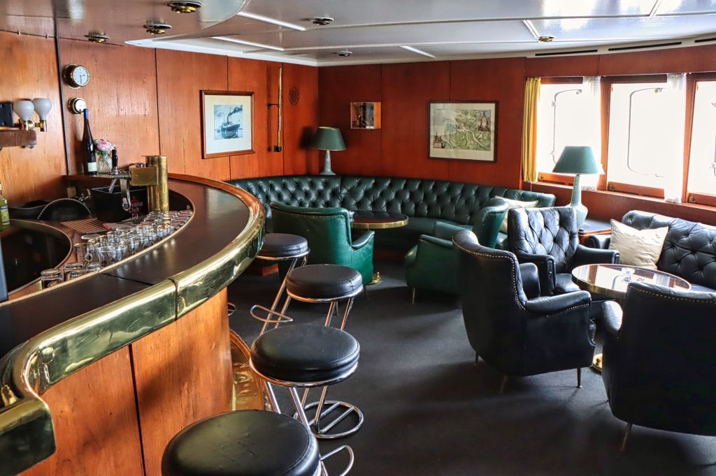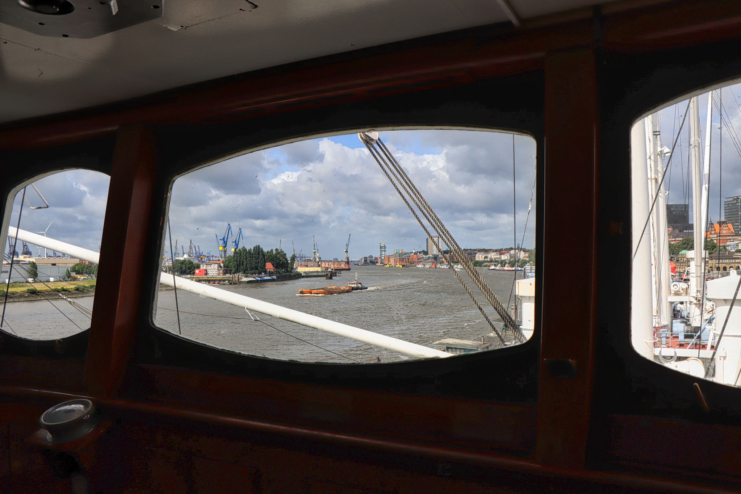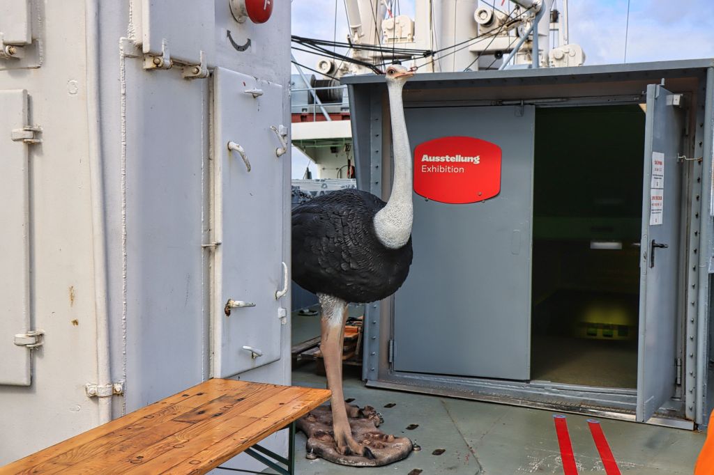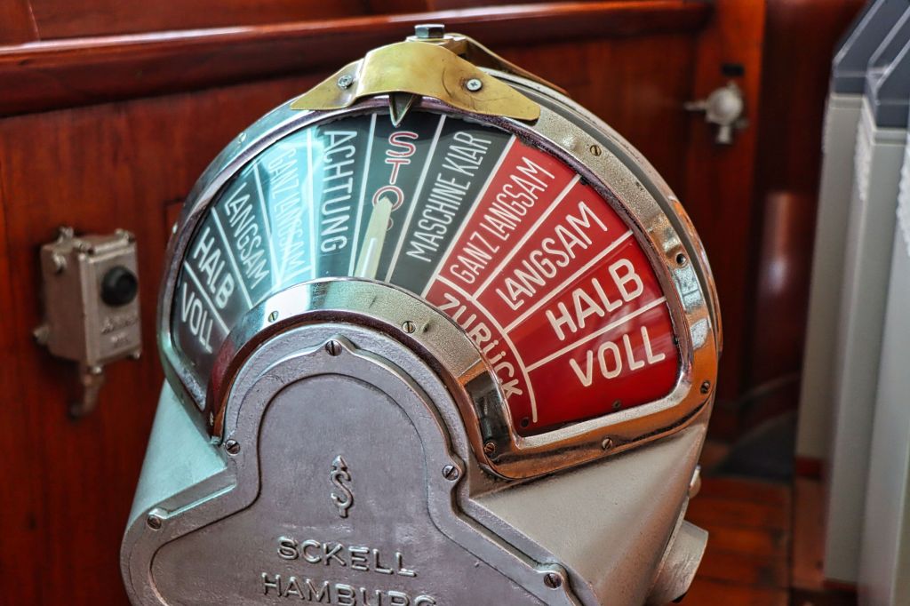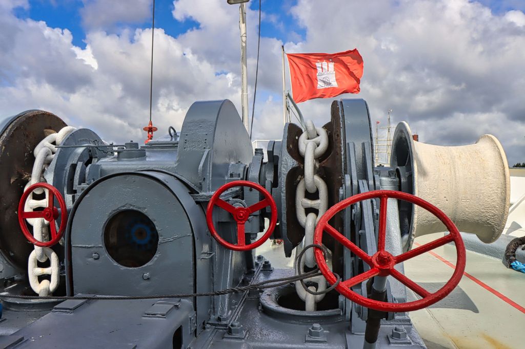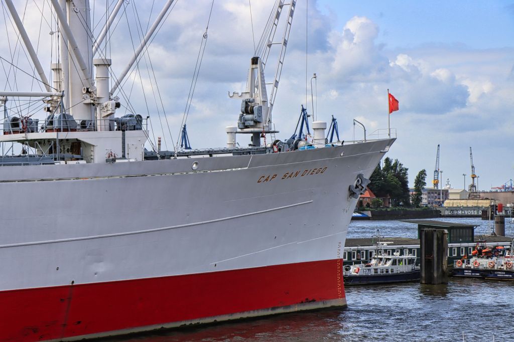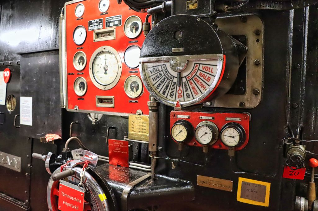 Die Cap San Diego, das letzte noch erhaltene Schiff einer Serie von sechs Stückgutfrachtern, die mal die Strecke nach Südamerika befahren haben, liegt als fahrtüchtiges Industriedenkmal an der Hamburger Überseebrücke. Wenn das Schiff nicht unterwegs ist, kann es von oben bis weit unter Deck als Museum besichtigt werden. Ein gekennzeichneter Weg führt vorbei an Kombüse und Salon, hinauf auf die Brücke und aufs Palaverdeck, tief runter in den Lade- und Maschinenraum. Ein Flyer und ein Audioguide für’s Handy begleiten einen über das Schiff. Da der Seegang vor Anker passabel ist, also selbst für eine Landratte wie mich geeignet.