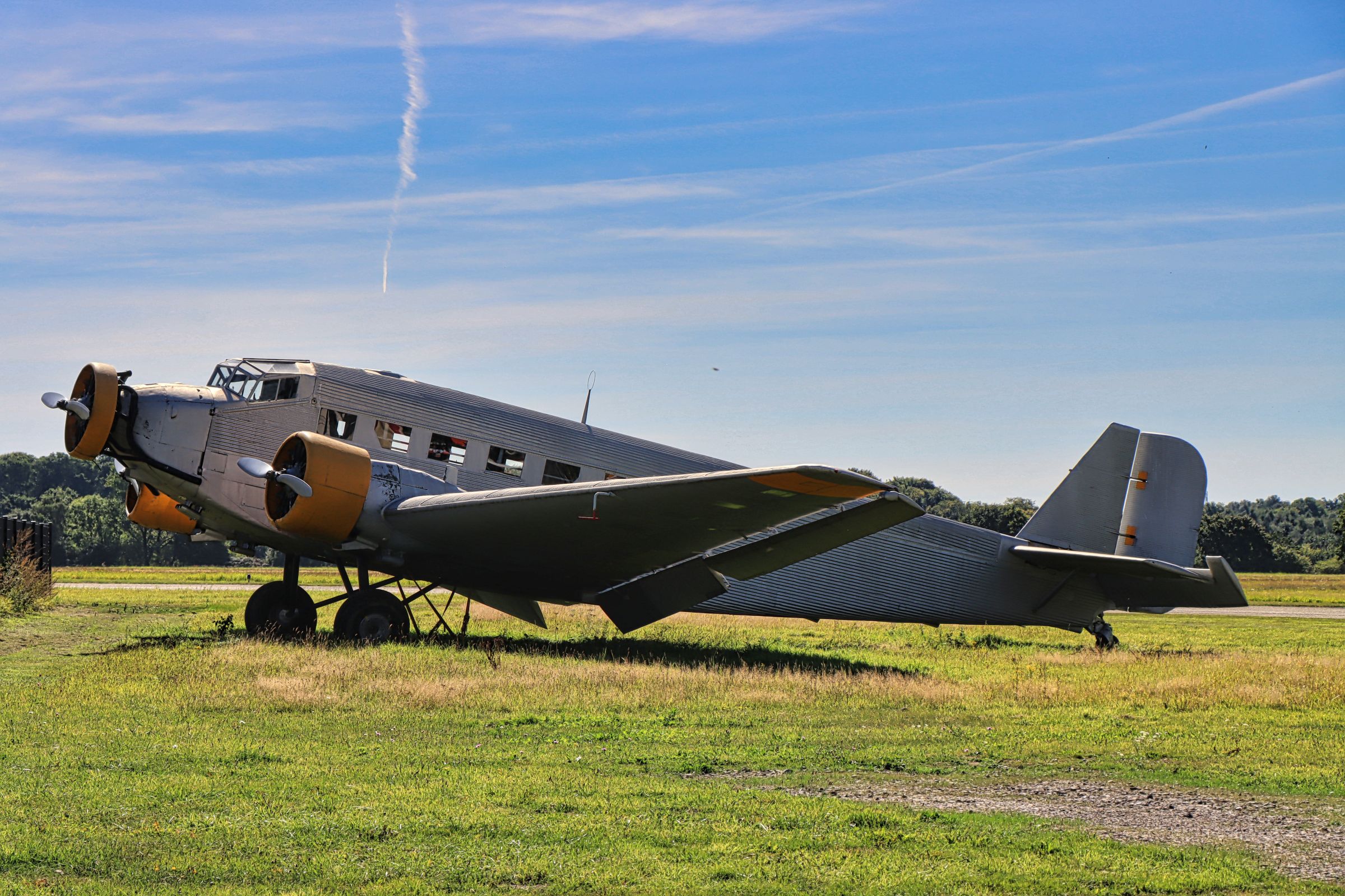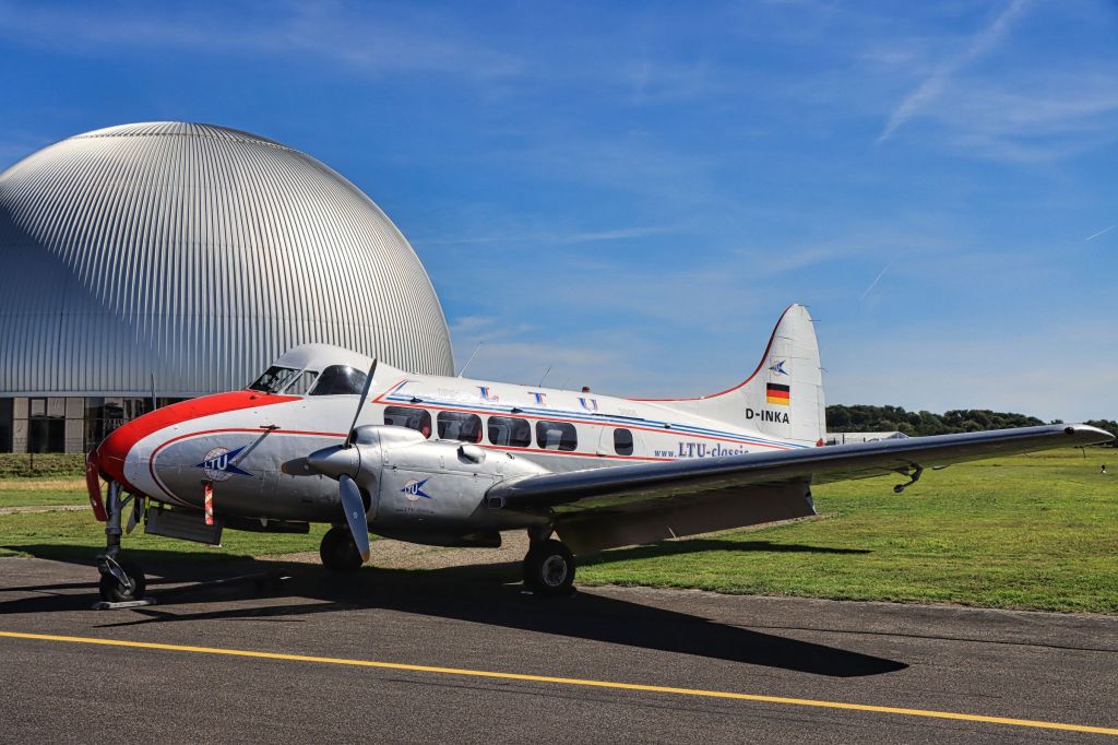 Zwischendrin waren die Hallen pardon die Hangar geöffnet, so daß man einen Blick auf Cessna & Co. werfen konnte. Der „Revier Heli“ stand neben anderen Helikoptern auf dem Flugfeld und sogar eine kleine handliche Drohne wurde ausgestellt. Zwei historische Maschinen durften natürlich nicht fehlen, die de Havilland Dove DH 104 (1957 von der LTU Lufttransport-Union in Belgien erworben), getauft auf den Namen „Augsburg“ mit der Kennung D-INKA und die JU52 (Typ AAC1, produziert im Oktober 1944, Seriennummer 053). Die JU52 stand hier allerdings etwas verschämt nur noch als Deko vor dem WDL Luftschiffhangar im Abseits.