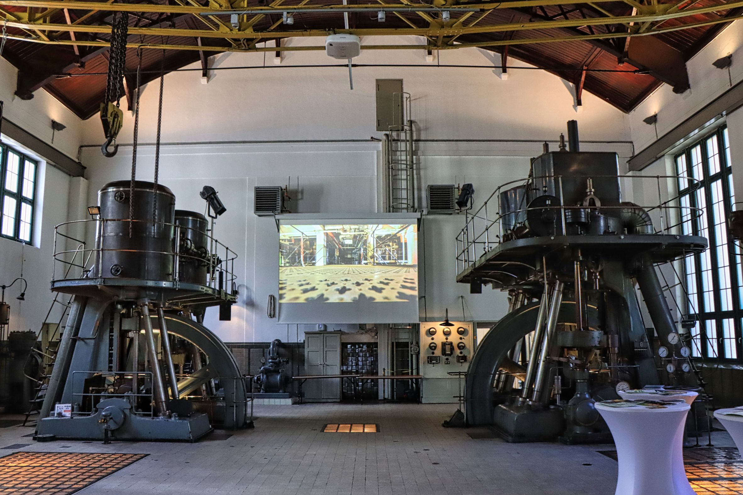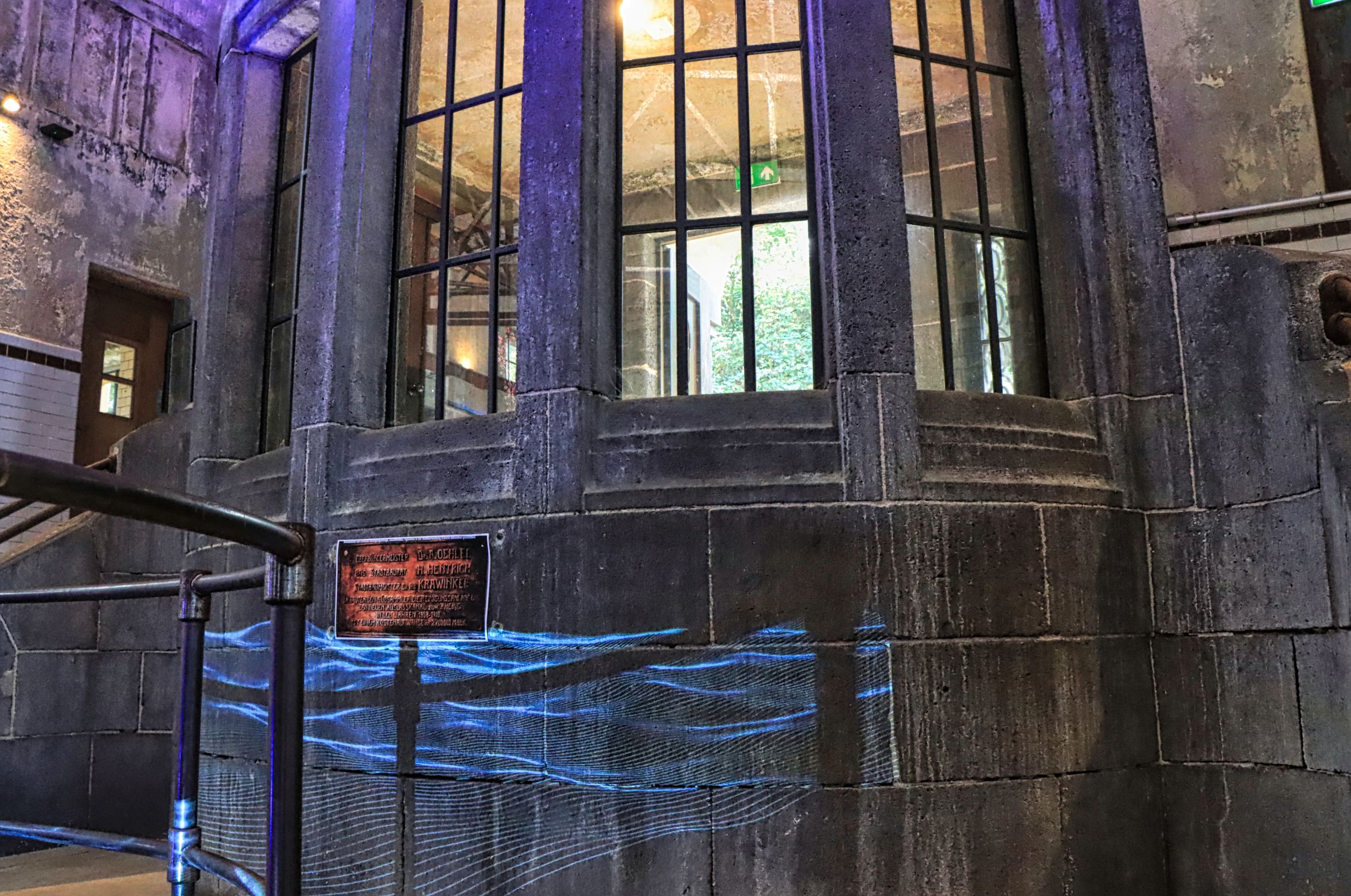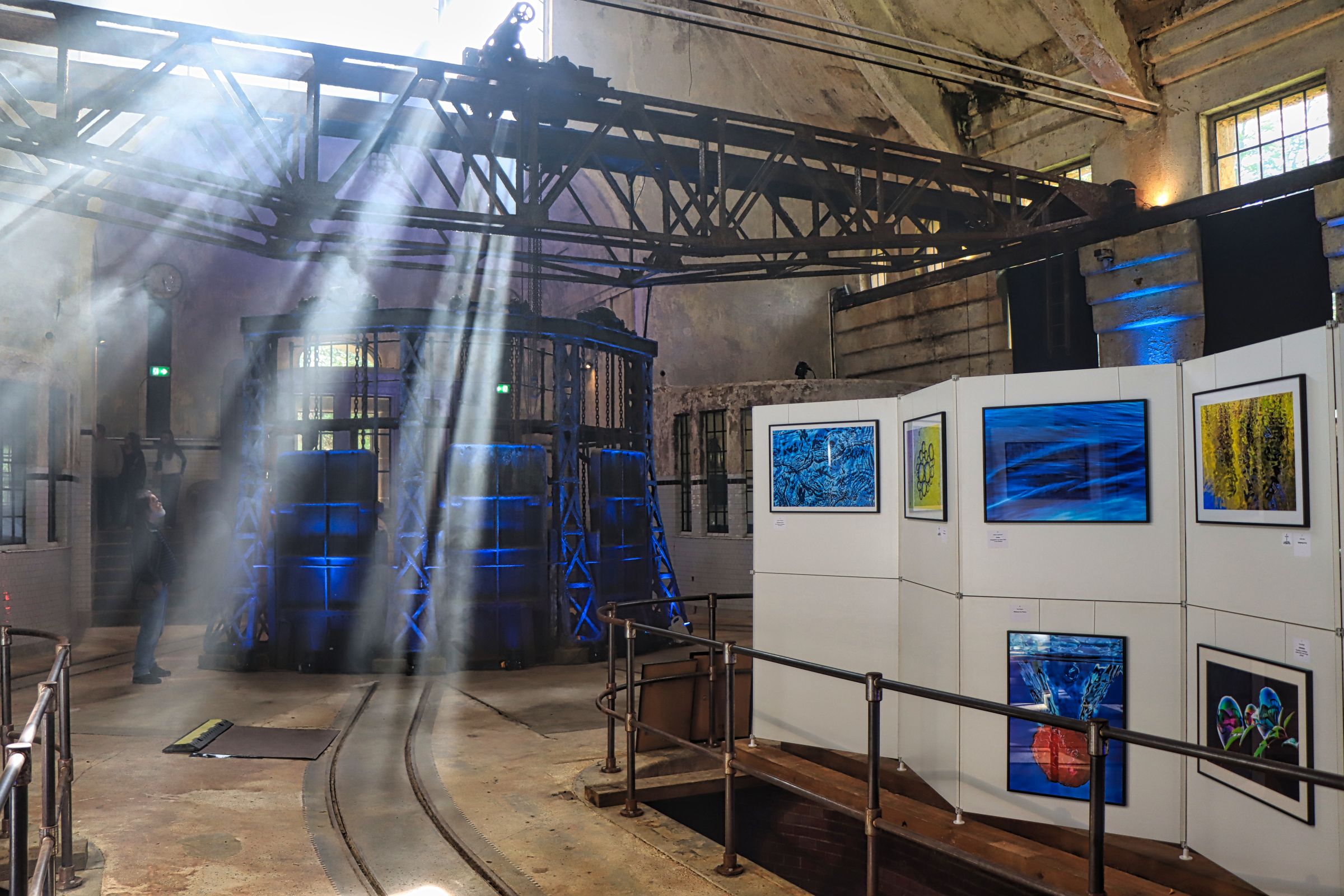 Im Anschluß ging es zurück auf die linke Rheinseite nach Krefeld Uerdingen. Hier wurde von 1910 bis 1962, das Pumpwerk sogar noch bis 1996, das Klärwerk der Stadt Krefeld betrieben. Ich berichtete schon vor einiger Zeit mal über dieses Kleinod (z.B. 2023). Das historische Klärwerk wird seit 2018 wieder renoviert. Seine neue Bestimmung ist aktuell ein Ausstellungs- und Veranstaltungsraum in historischer Kulisse. Und das paßte dieses Wochenende wie Faust aufs Auge, denn nicht nur, daß sich immer ein paar fotografische Highlights im Gebäude ergeben (dieses Mal wurde mit ein bisschen Trockeneisnebel die einfallende Sonne besonders hervorgehoben), nein aktuell läuft sogar eine Fotoausstellung des Covestro Foto Film Clubs zum Thema „Die Ästhetik des Wassers“.
