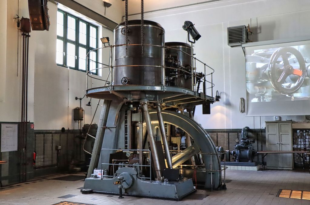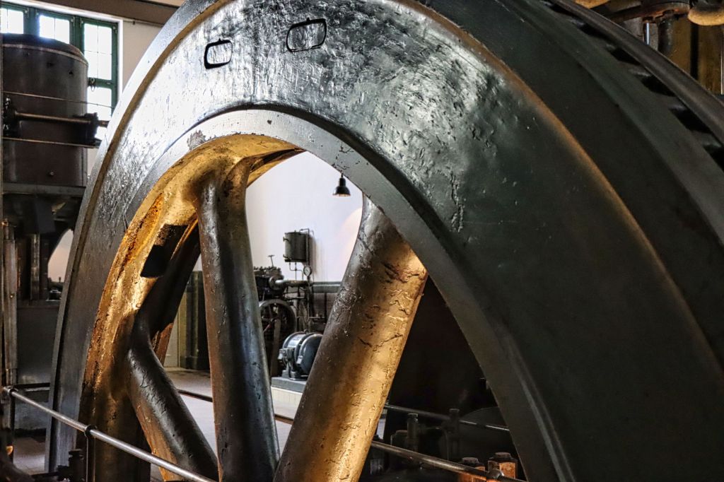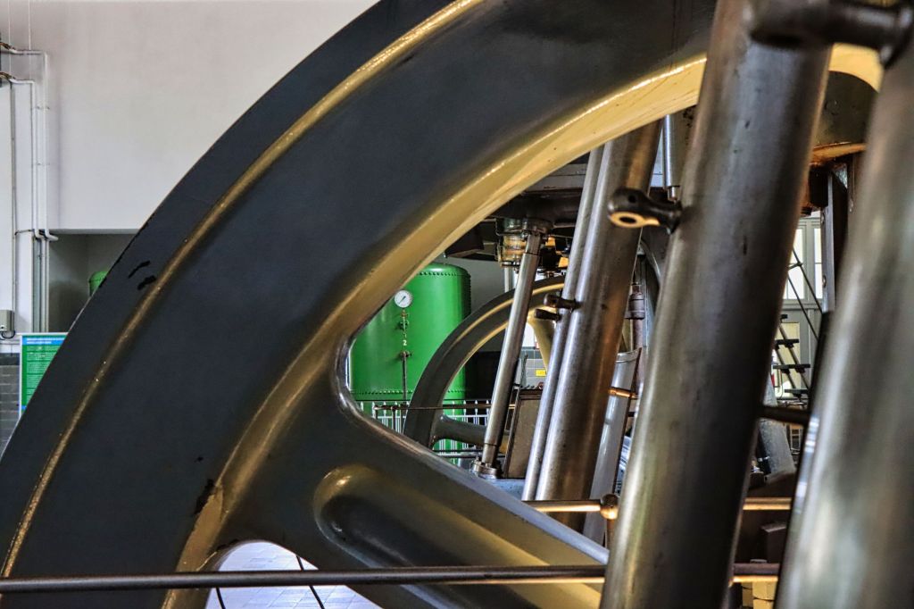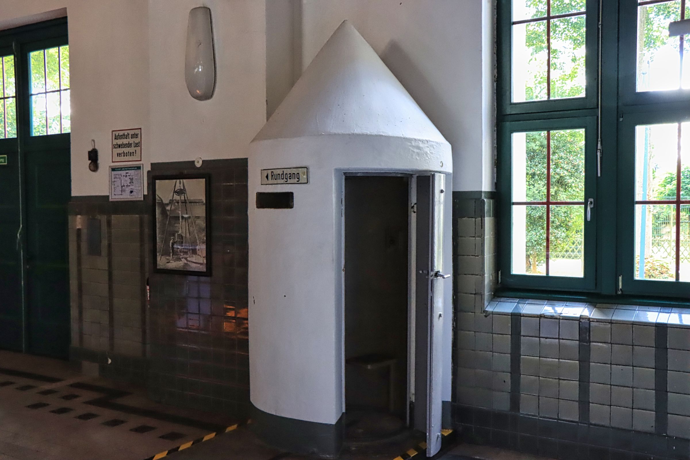 Das im neoklassizistischem Stil erbaute Gebäude beheimatet heute noch, fast vom Krieg verschont, drei Pumpen, welche bis in die 1980er Jahre hier Wasser aus der Erde gepumpt haben. Anfangs mit Kohle, später mit Gas betrieben. Nur eine einzige Granate hat das Gebäude im Krieg getroffen, das Loch und die Spuren der Splitter sind heute noch in der Decke bzw. am Boden zu sehen. Überhaupt die Eichendecke ist fast noch interessanter als die Maschinen in der Halle. In einer Ecke steht noch der Einmannbunker, in dem der Techniker bei einem Angriff Schutz suchen durfte. Die Kohle kam übrigens über den Rhein und mit einer Feldbahn zum Wasserwerk.