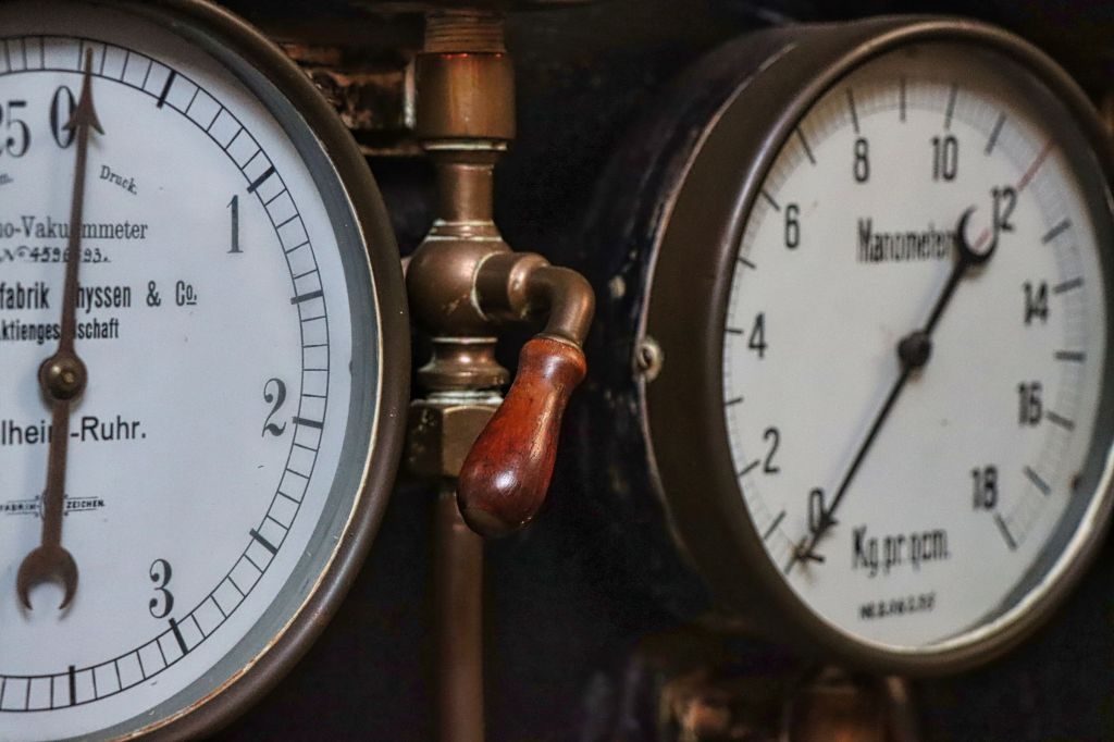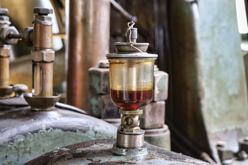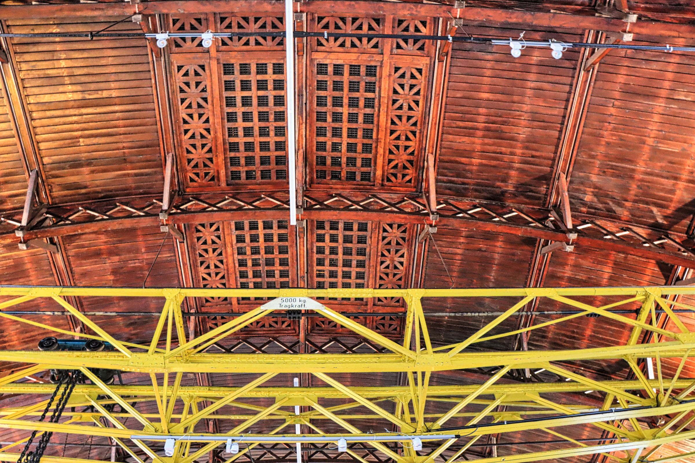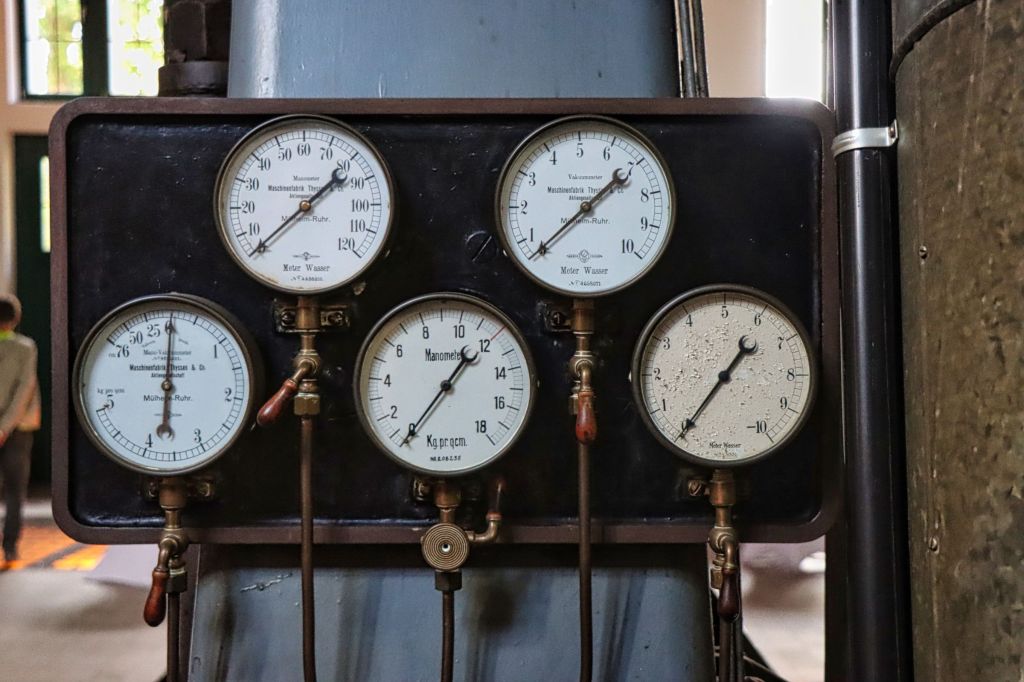 Das im neoklassizistischem Stil erbaute Gebäude beheimatet heute noch, fast vom Krieg verschont, drei Pumpen, welche bis in die 1980er Jahre hier Wasser aus der Erde gepumpt haben. Anfangs mit Kohle, später mit Gas betrieben. Nur eine einzige Granate hat das Gebäude im Krieg getroffen, das Loch und die Spuren der Splitter sind heute noch in der Decke bzw. am Boden zu sehen. Überhaupt die Eichendecke ist fast noch interessanter als die Maschinen in der Halle. In einer Ecke steht noch der Einmannbunker, in dem der Techniker bei einem Angriff Schutz suchen durfte. Die Kohle kam übrigens über den Rhein und mit einer Feldbahn zum Wasserwerk.