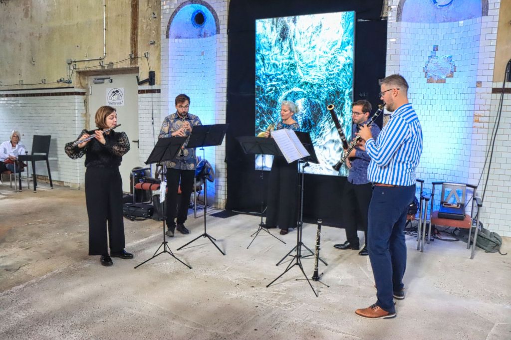 Was paßte also besser also auch hier am Tag des offenen Denkmals vorbei zu gucken. Dazu Musik des Holzbläserquintetts NR5, bestehend aus SolobläserInnen des Theaters Krefeld / Mönchengladbach und einen Becher frisch gebrühten Kaffee. Seid ehrlich, wo kann man eine Ausstellung in einem historischen Gebäude mit einem Becher Kaffee in der Hand besuchen? Alle Bilder dieses Blogbeitrags gibt’s auch bei Flickr und Google Photos, die der Ausstellung „Die Ästhetik des Wassers“ noch am 20./21. und 27./28.09.25 im historischen Klärwerk.