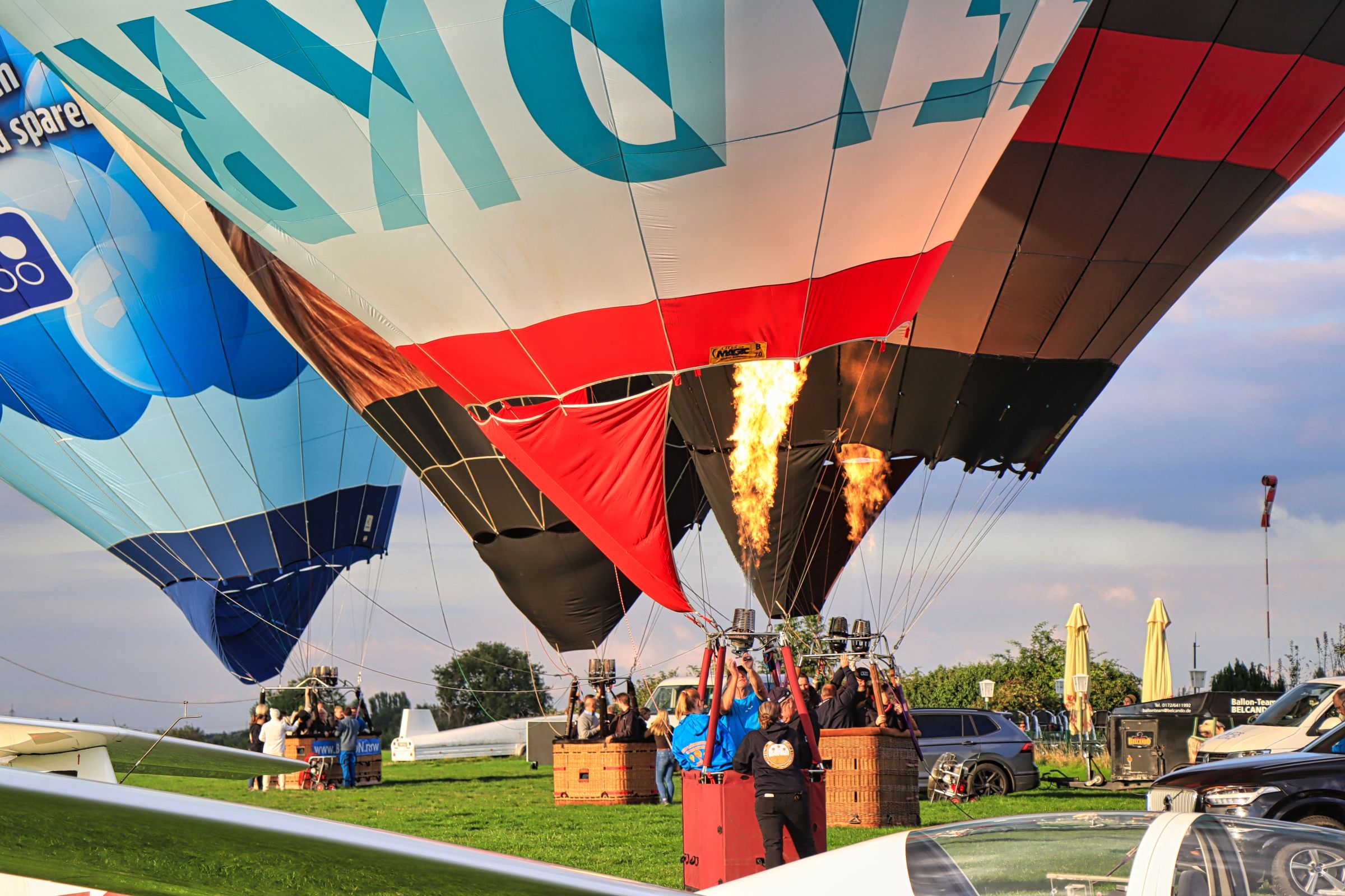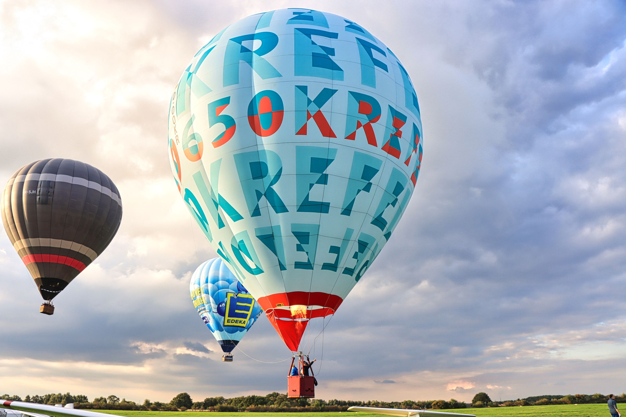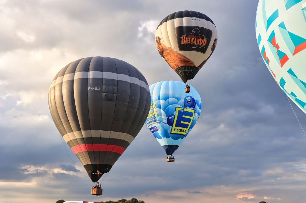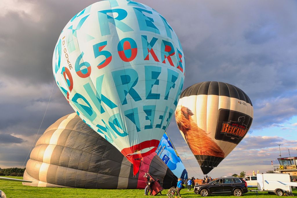 Über mir tat sich eine riesige dunkle Wolke auf, so daß ich befürchtete, der Ballonstart könnte doch noch ins Wasser fallen. Aber nichts da, als ich ausstieg, waren die Vorbereitungen schon in vollem Gange. Also im Laufschritt zum Startplatz und los geht’s. Nach rund 10-15 Minuten standen die Ballons startfertig auf dem Segelflugplatz und nacheinander ging es für die vier Ballons in die Höhe. Unter ihnen natürlich unser Jubiläumsballon 650 Jahre Krefeld. Das Ergebnis der spontanen Fotosession seht ihr hier und im Krefelder Album von Flickr oder Google Photos.