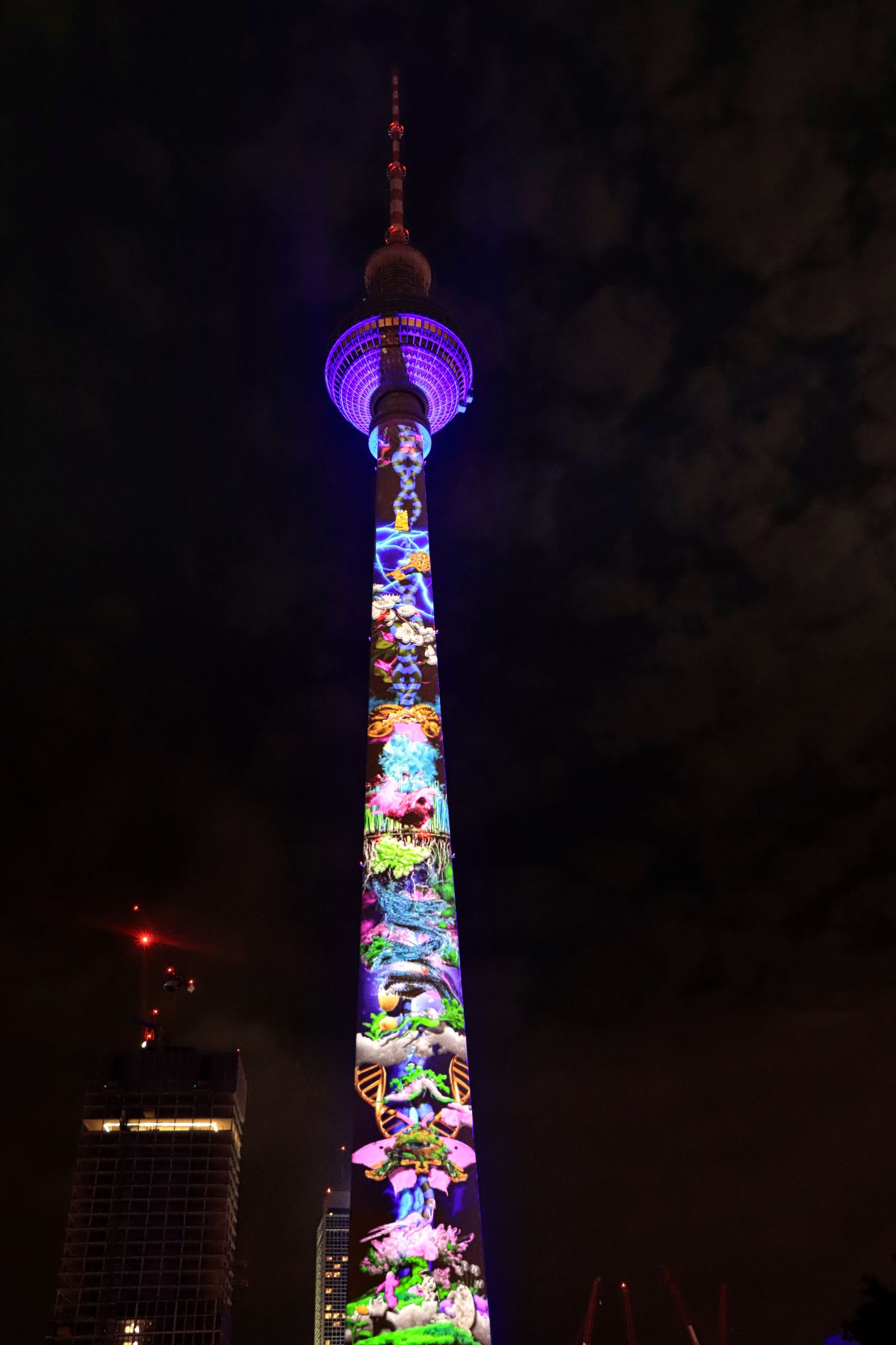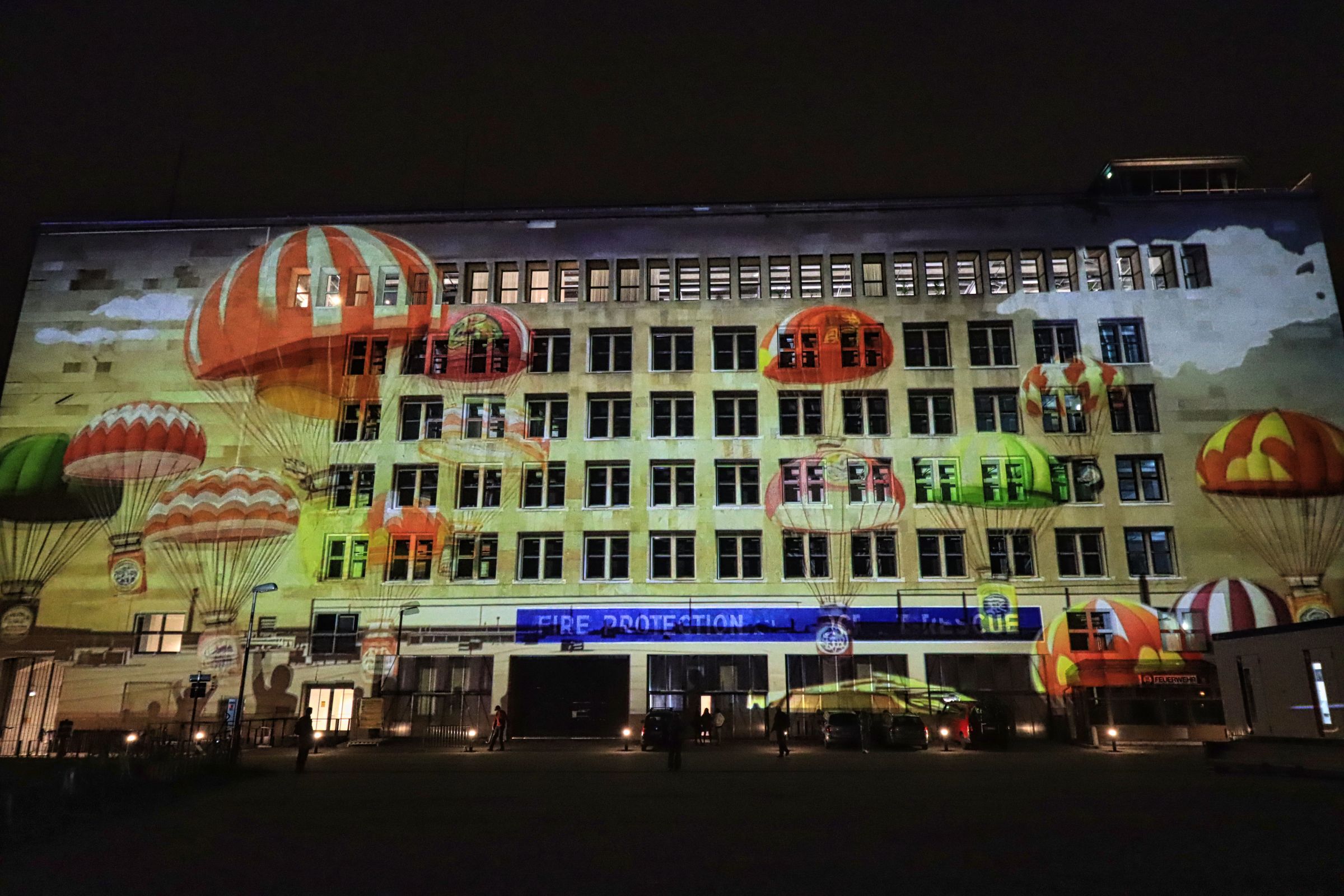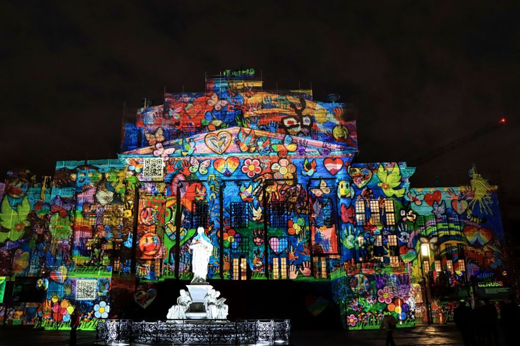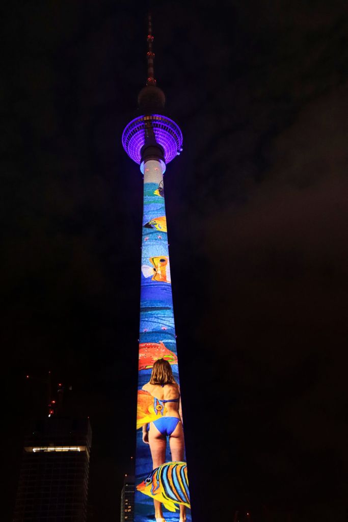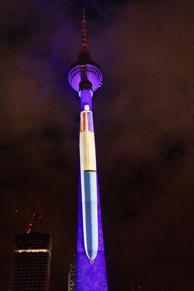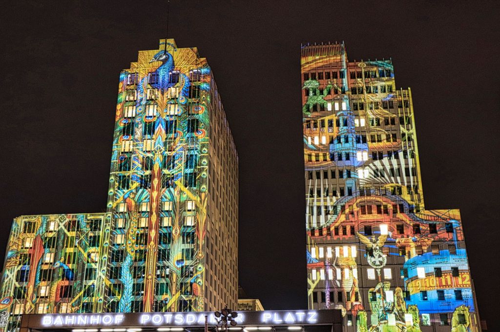 Auch der Gendarmenmarkt war nach der Renovierung dieses Jahr wieder Teil des Festival of Lights, allerdings gab es nur ein durchgehendes Standbild auf der Fassade des Konzerthauses. Daß es sich um die Kunstaktion „Die Hände Berlins“, mit Handabdrücken von Kindern der Arche Kinderstiftung handelt, habe ich erst im Nachhinein erfahren. Etwas abseits und mit kurzer U-Bahn Fahrt verbunden war der nächste Festival of Lights Ort, der Tempelhofer Flughafen (The Tower THF). Vor zwei Jahren war ich da auf der Aussichtsterrasse des alten Towers, dieses Mal war die Fassade das Programm.