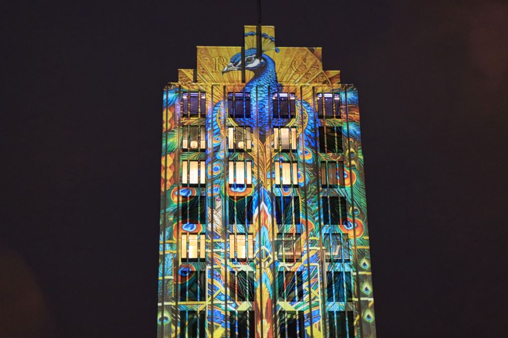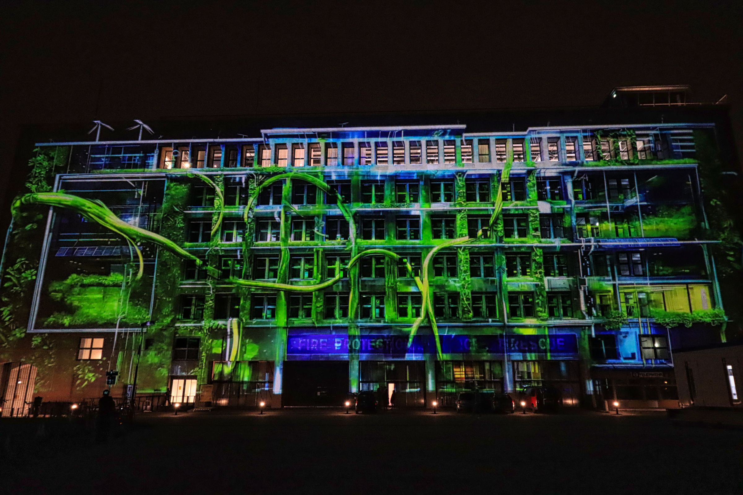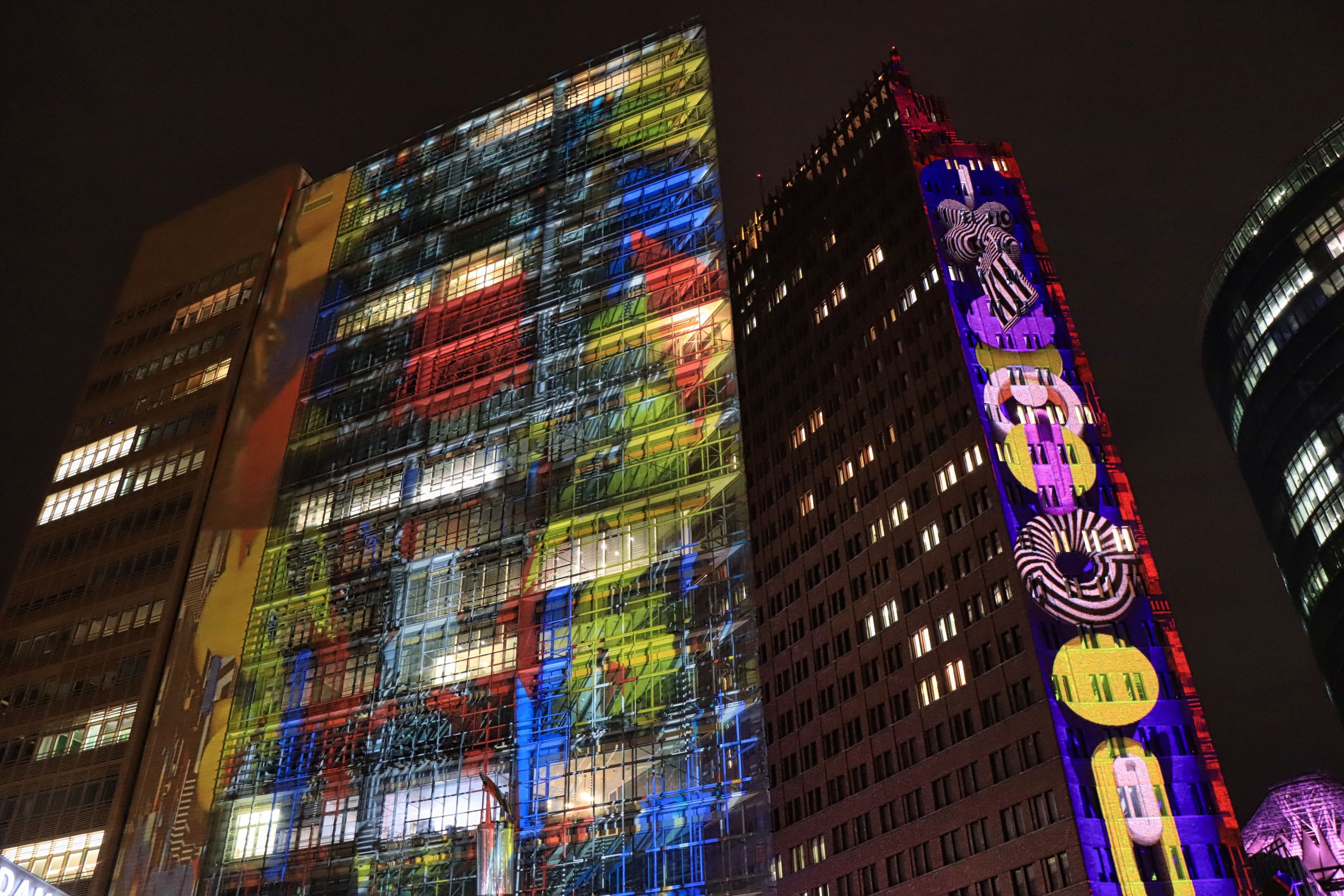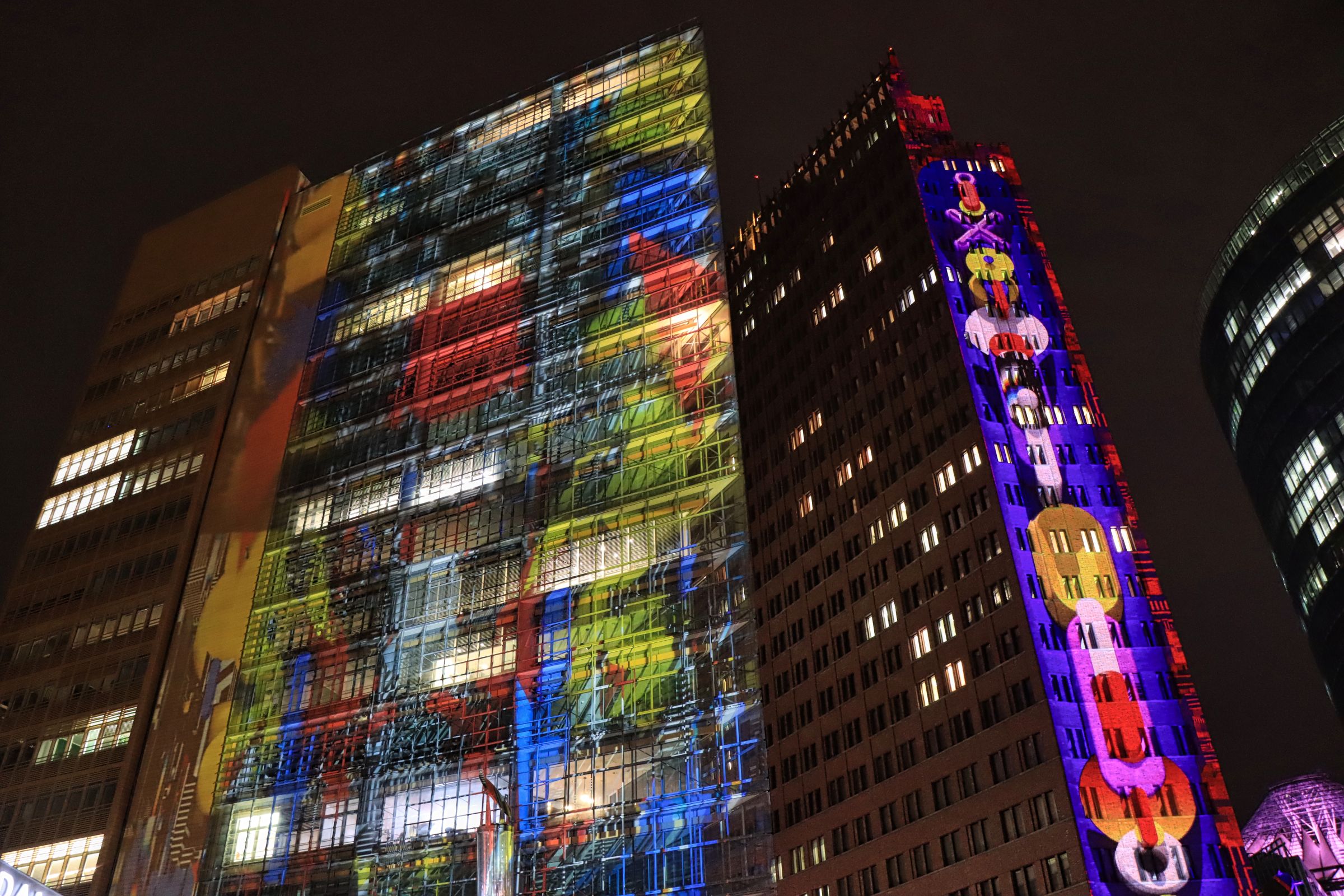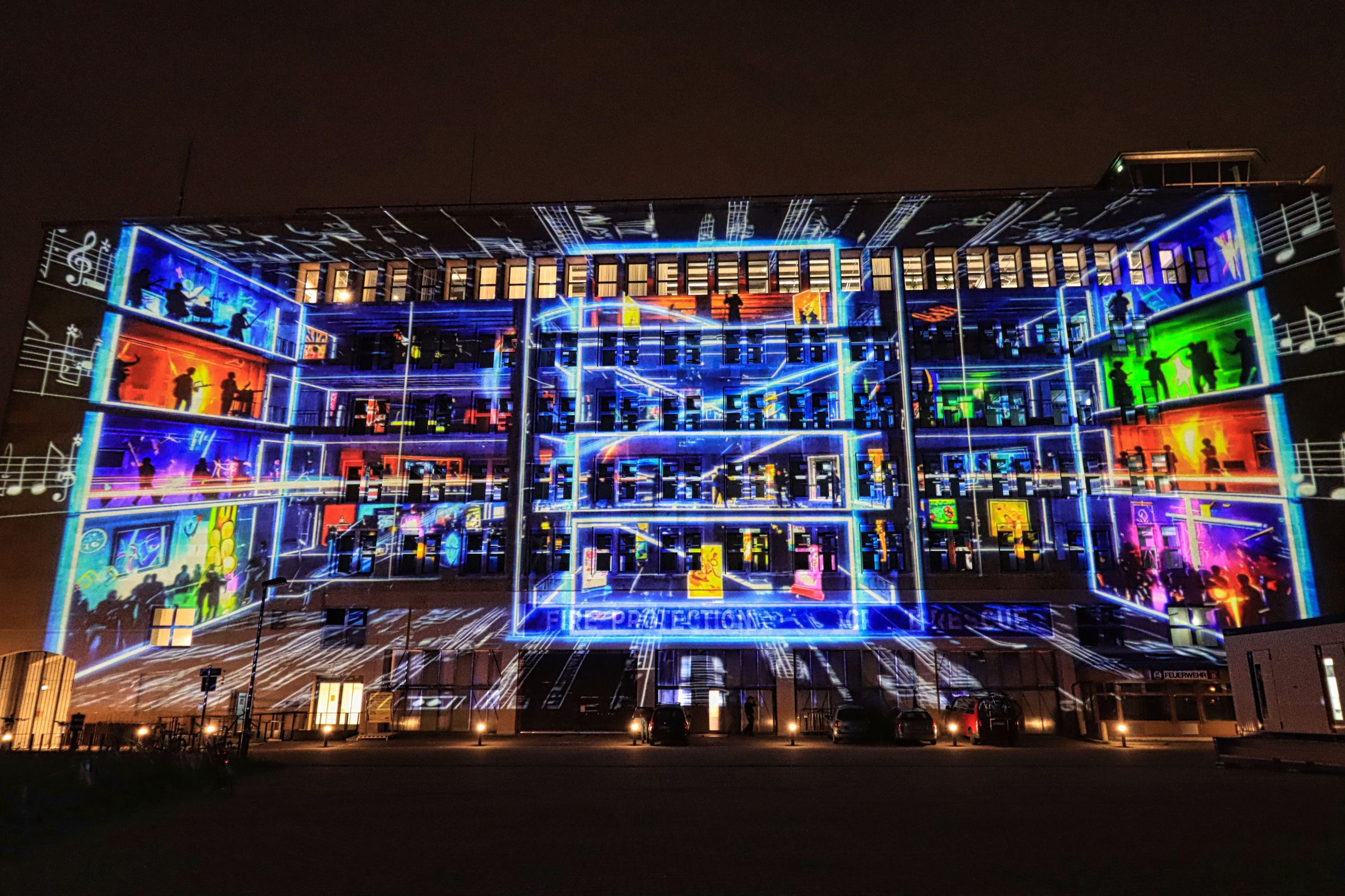 Auch der Gendarmenmarkt war nach der Renovierung dieses Jahr wieder Teil des Festival of Lights, allerdings gab es nur ein durchgehendes Standbild auf der Fassade des Konzerthauses. Daß es sich um die Kunstaktion „Die Hände Berlins“, mit Handabdrücken von Kindern der Arche Kinderstiftung handelt, habe ich erst im Nachhinein erfahren. Etwas abseits und mit kurzer U-Bahn Fahrt verbunden war der nächste Festival of Lights Ort, der Tempelhofer Flughafen (The Tower THF). Vor zwei Jahren war ich da auf der Aussichtsterrasse des alten Towers, dieses Mal war die Fassade das Programm.