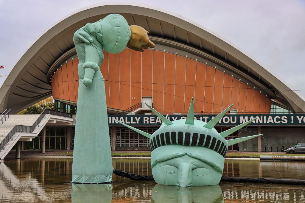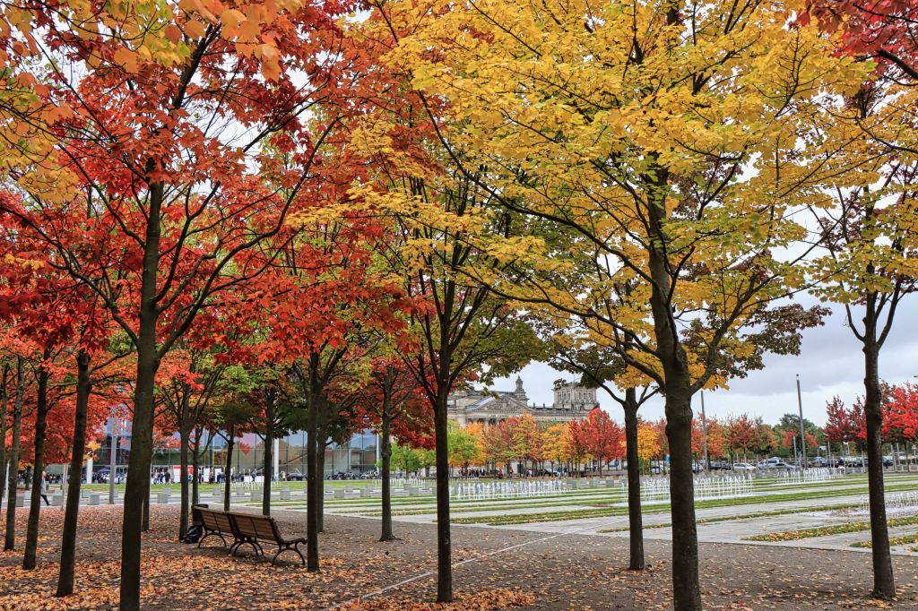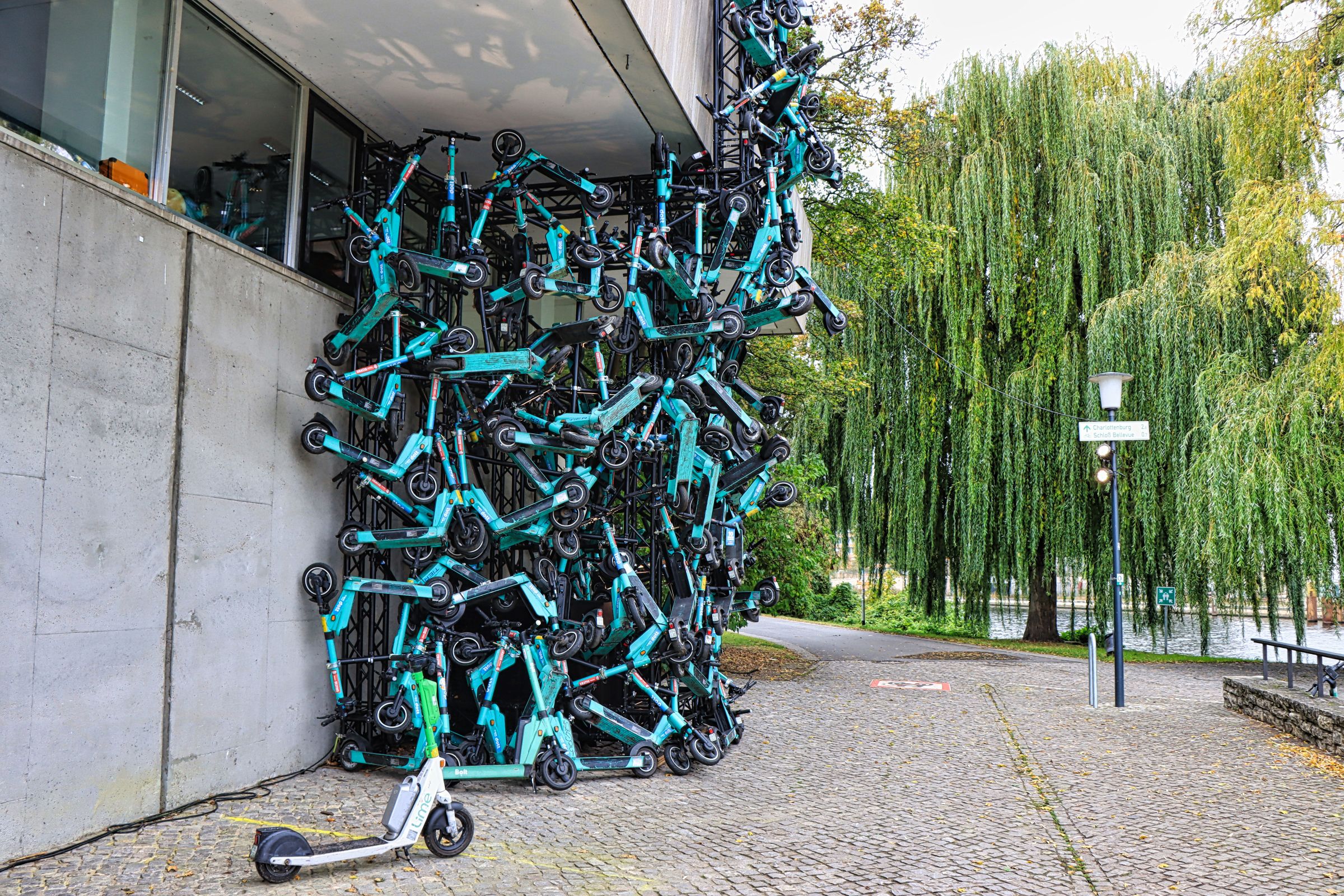 Herbstlich sah es auch rund um das Kanzleramt aus. Dort kam ich vorbei, als ich vom Haus der Kulturen der Welt kam. Das Haus hatte ich bis zu dem Zeitpunkt auch noch nie besucht. Jan Böhmermann präsentierte hier mit der Gruppe Royale die Ausstellung „Die Möglichkeit der Unvernunft“. Drinnen (mit Eintritt) aber auch vor der Türe. Zum Beispiel eine recht ungewöhnliche Ansammlung von eScootern.