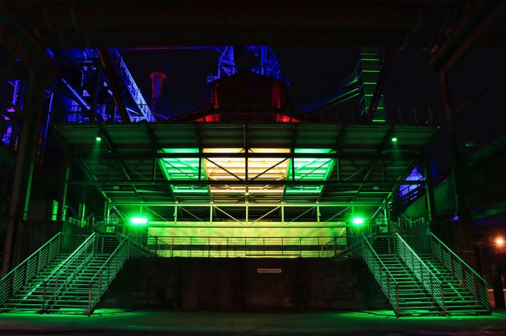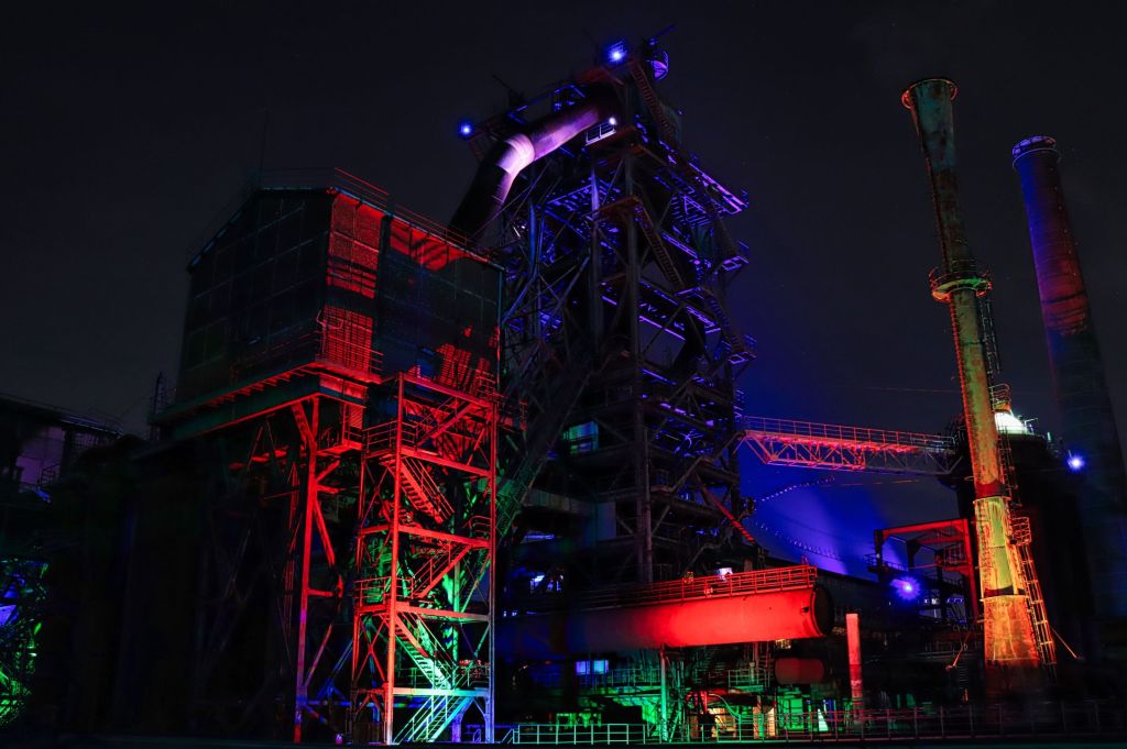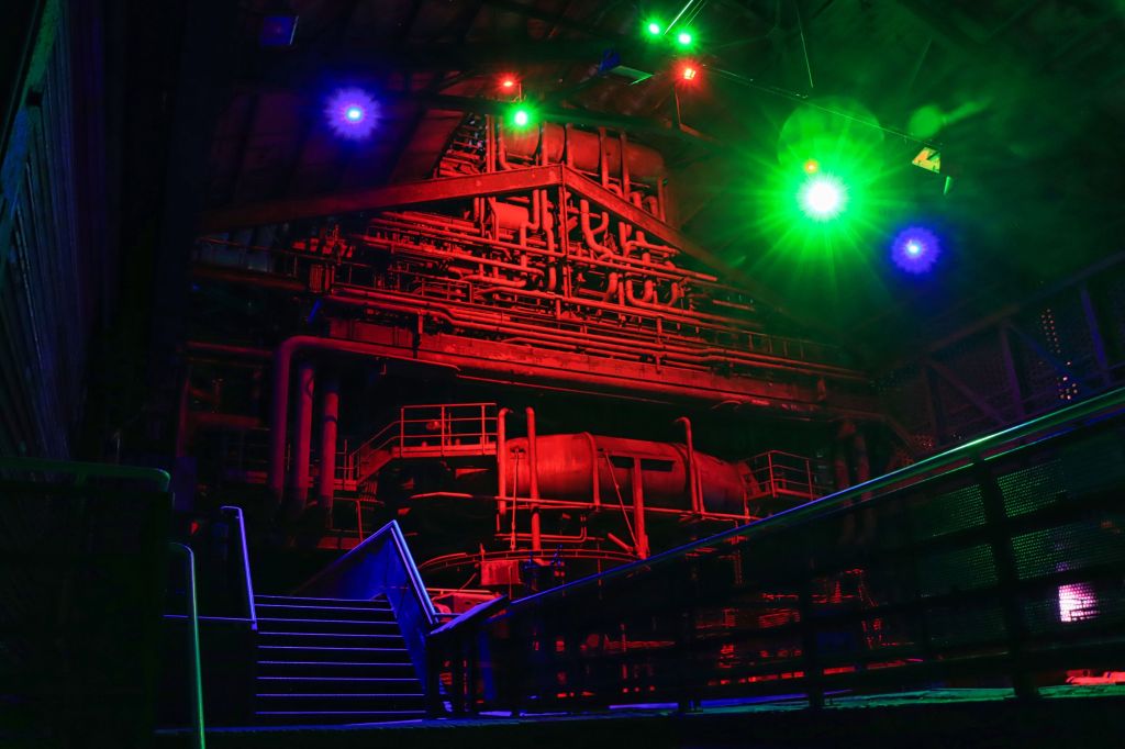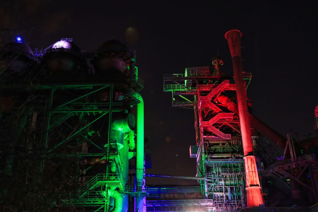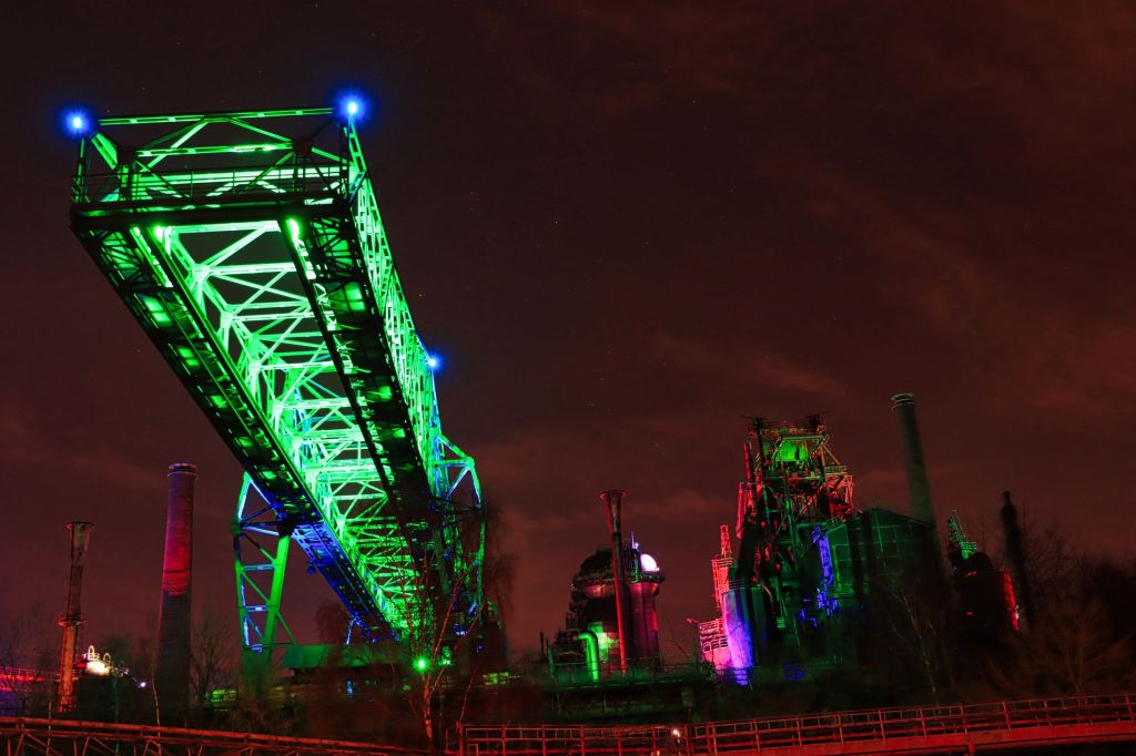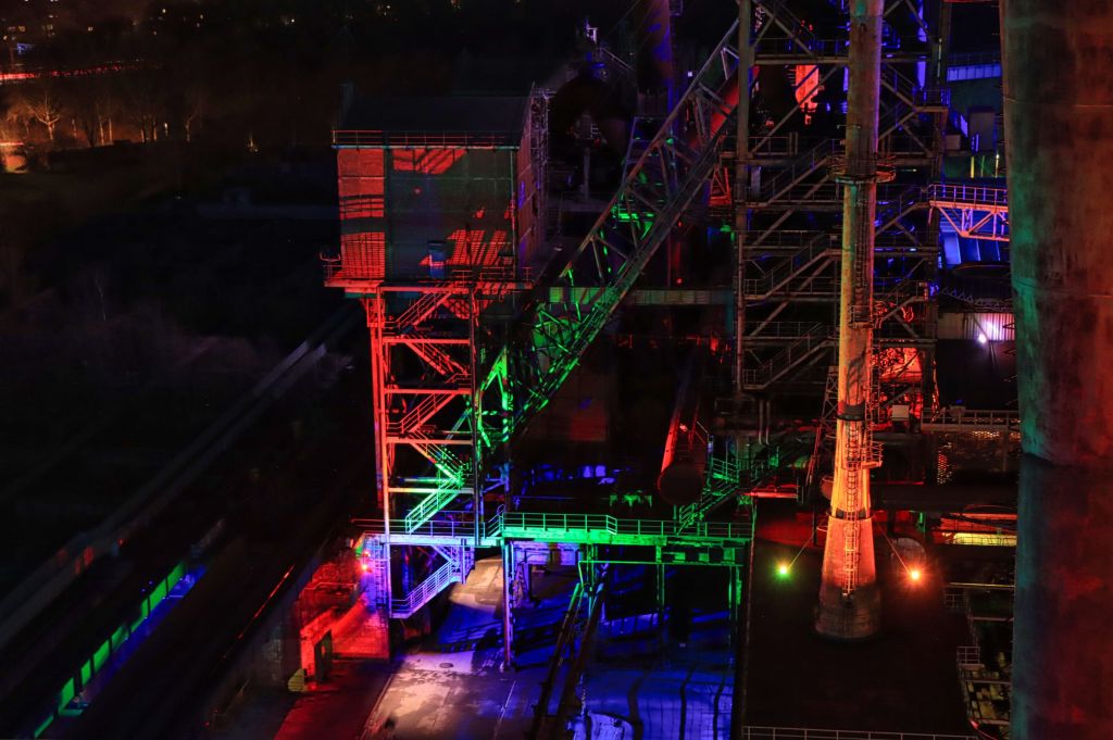 Diesmal war auch der Hochofen wieder geöffnet, also ab nach oben. Falls ihr auch mal nach oben wollt, eine Taschenlampe ist nicht Pflicht, kann aber ganz gute Dienste leisten, denn trotz aller Illumination, auf den Treppen des Hochofens kann es schon mal etwas dunkel werden. Was ich unterhalb des Windrades zu sehen bekam, hat mir sehr gut gefallen und in der ersten Etage, oberhalb der Möllerbunker (als das Hüttenwerk noch in Betrieb war, wurden hier Koks und Eisenerze zwischengelagert), bieten sich im Dunkeln wieder neue Perspektiven. Auch hier gilt, eine Taschenlampe ist nicht verkehrt.