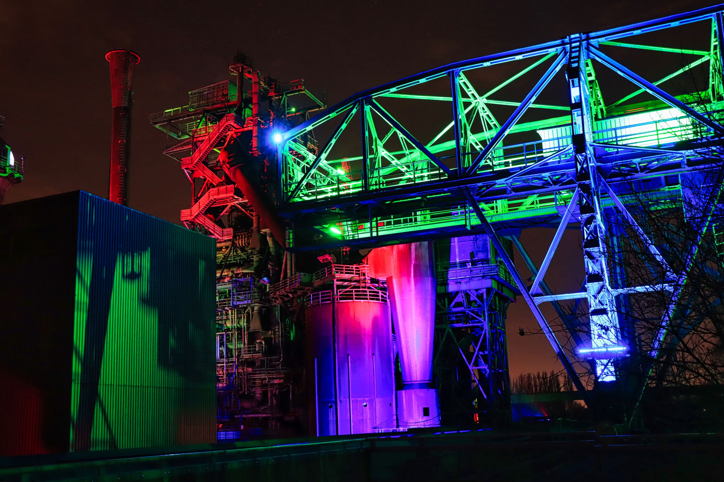 Diesmal war auch der Hochofen wieder geöffnet, also ab nach oben. Falls ihr auch mal nach oben wollt, eine Taschenlampe ist nicht Pflicht, kann aber ganz gute Dienste leisten, denn trotz aller Illumination, auf den Treppen des Hochofens kann es schon mal etwas dunkel werden. Was ich unterhalb des Windrades zu sehen bekam, hat mir sehr gut gefallen und in der ersten Etage, oberhalb der Möllerbunker (als das Hüttenwerk noch in Betrieb war, wurden hier Koks und Eisenerze zwischengelagert), bieten sich im Dunkeln wieder neue Perspektiven. Auch hier gilt, eine Taschenlampe ist nicht verkehrt.