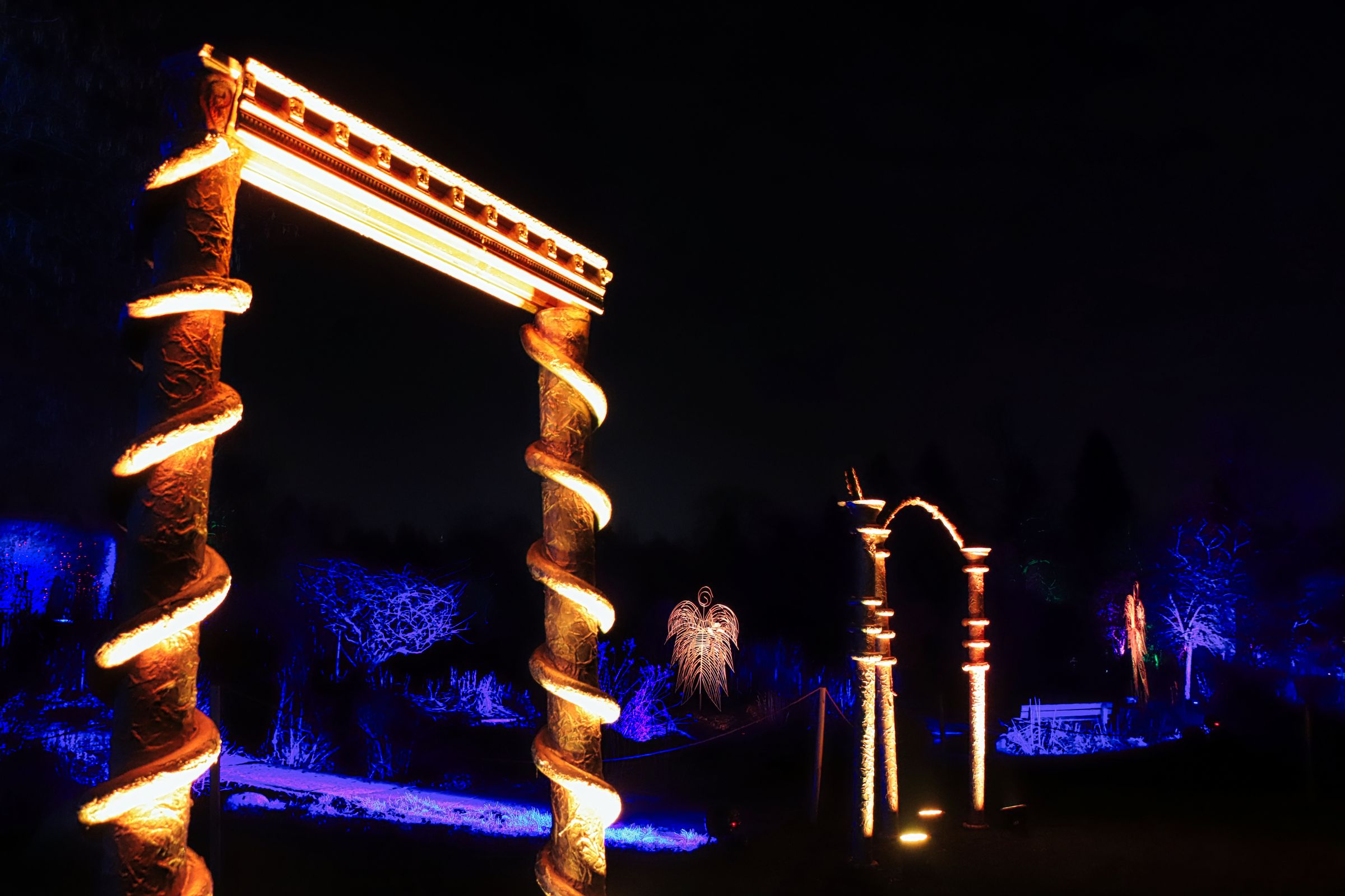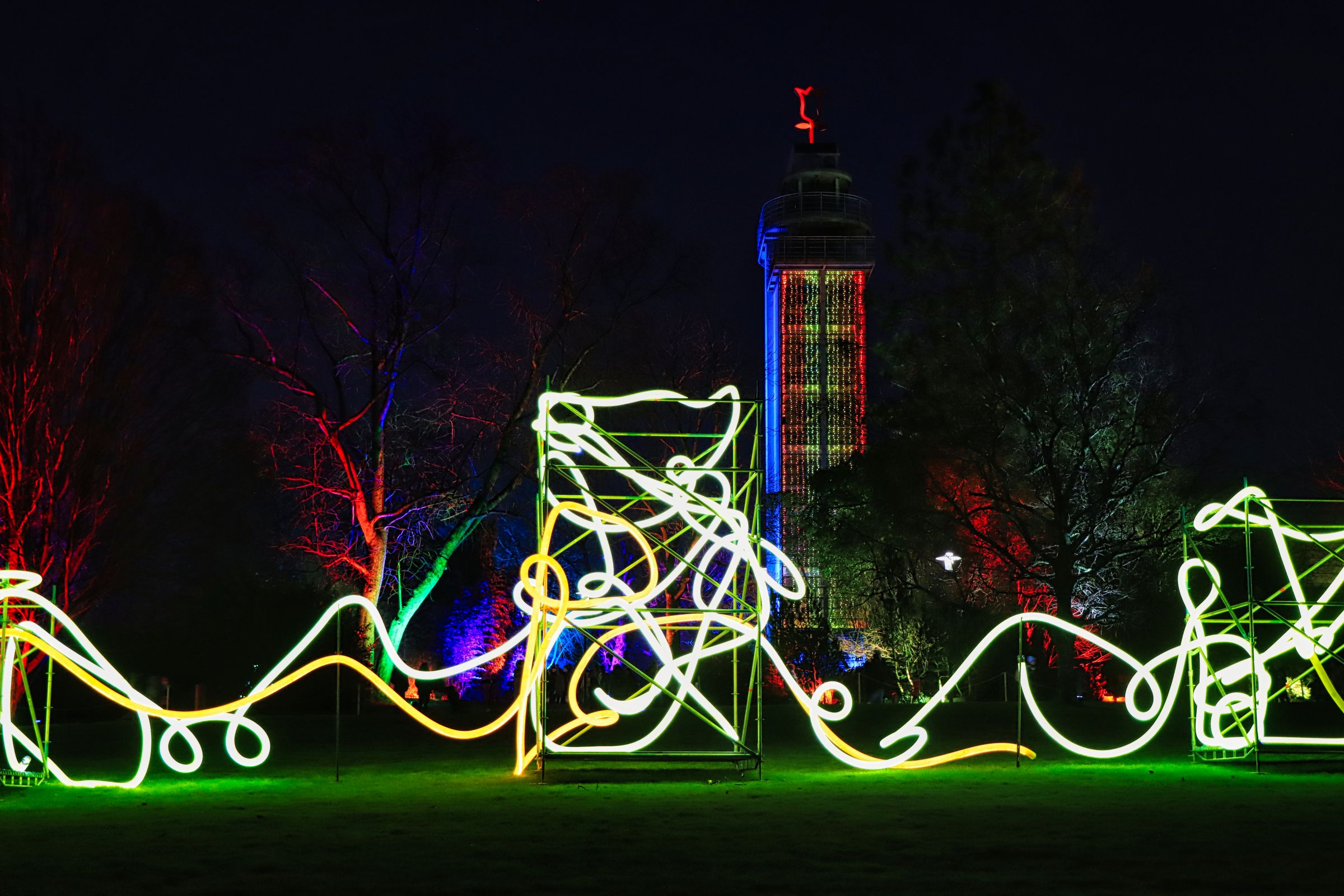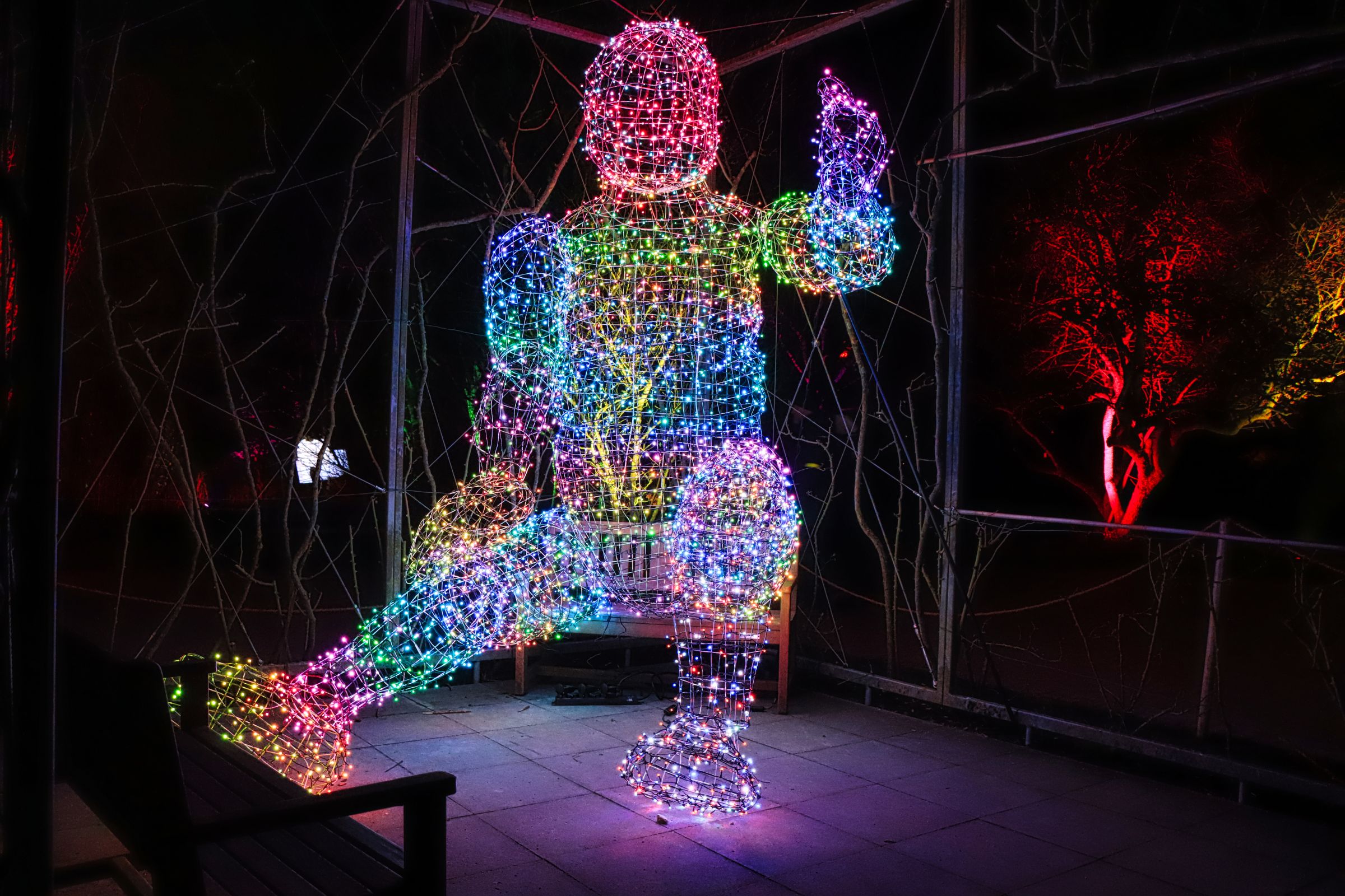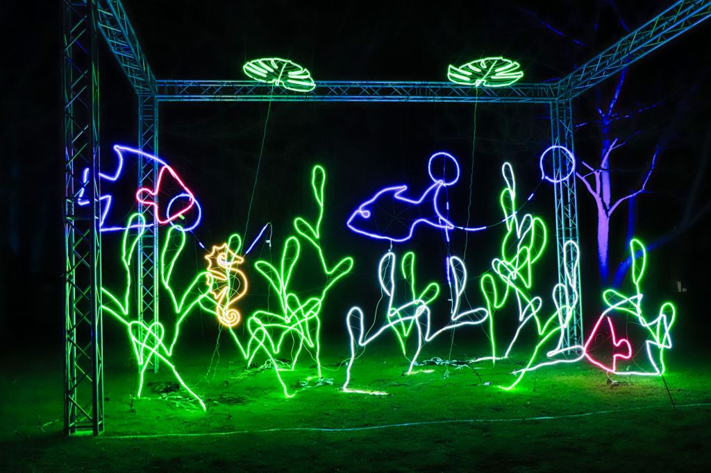 Seit letztem Samstag ist es wieder soweit und dieses Jahr wieder mit vielen neuen Lichtobjekten. Es gibt gleich verschiedene Highlights, die Lindenallee, bunt wie jedes Jahr, aber auch zwischen Lindenrund und Rosengarten ist einiges zu sehen. Vor allem der Riese aus hunderten LEDs auf der Bank ist ein Blickfang, gleich aus zwei Richtungen. Lediglich im Staudental bzw. am Staudenhang unterhalb des Lindenrunds war es dieses Mal etwas mau bestückt.