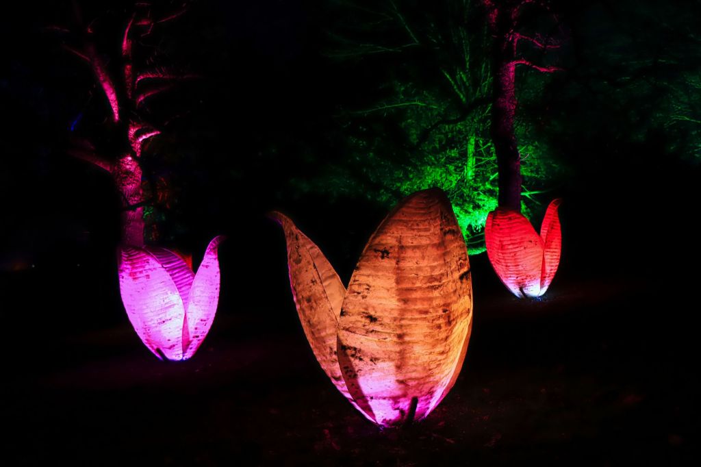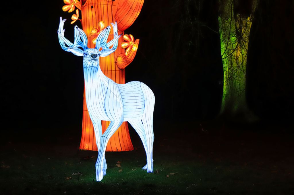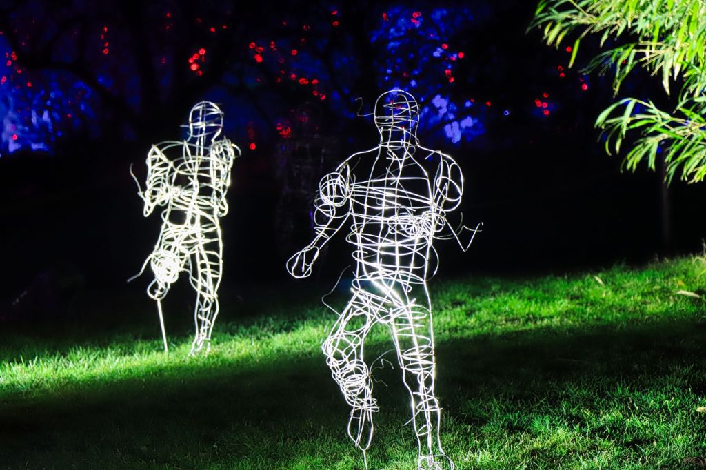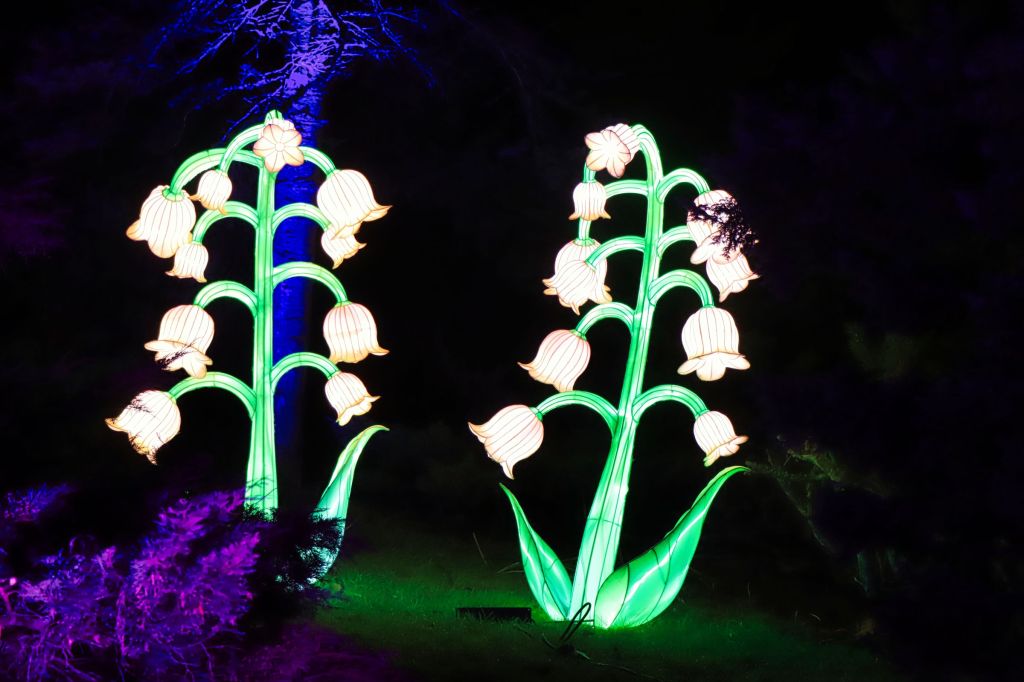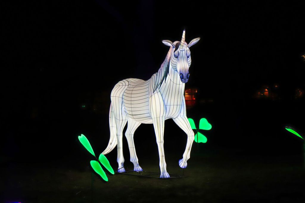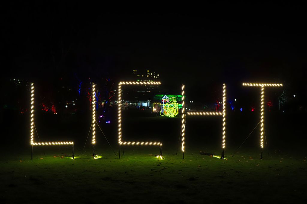 Die Fotohotspots, das darf man wohl so sagen, sind die bunten Kugeln im Musikpavillon und der Lichttunnel auf der Brücke in Höhe des Hundertwasser Hauses. Oder sollte ich die Ballerina erwähnen, die im Schloß auf der großen Wiese an der Orangerie einen Tanz hinlegt, die Einhörner am Grugaturm oder die wunderschön beleuchteten Blumen … aber vielleicht guckt ihr einfach selber mal vorbei. Oben an der großen Wiese steht das Thema, um das es geht … LICHT.