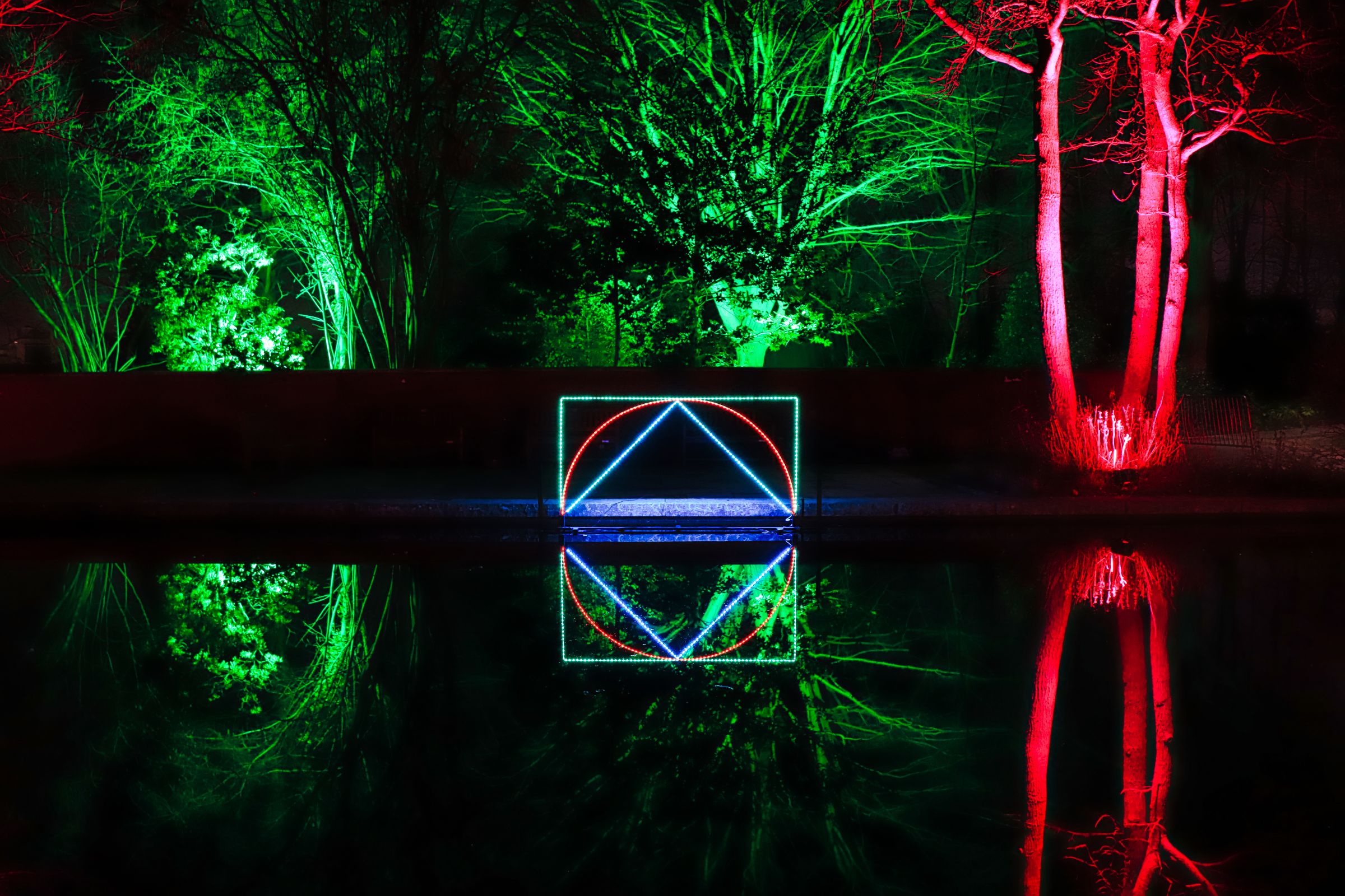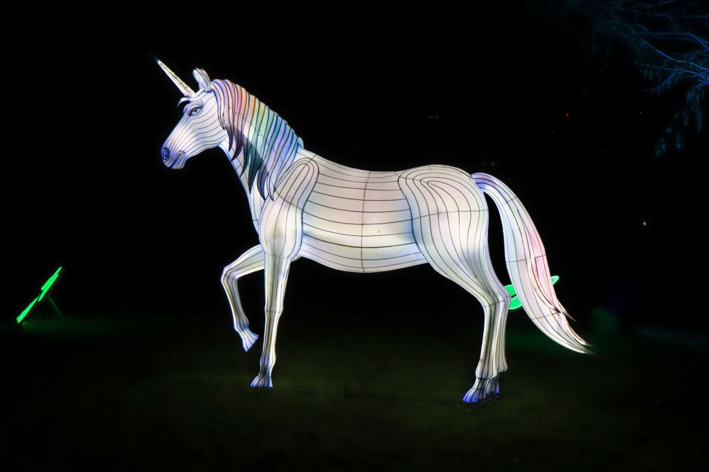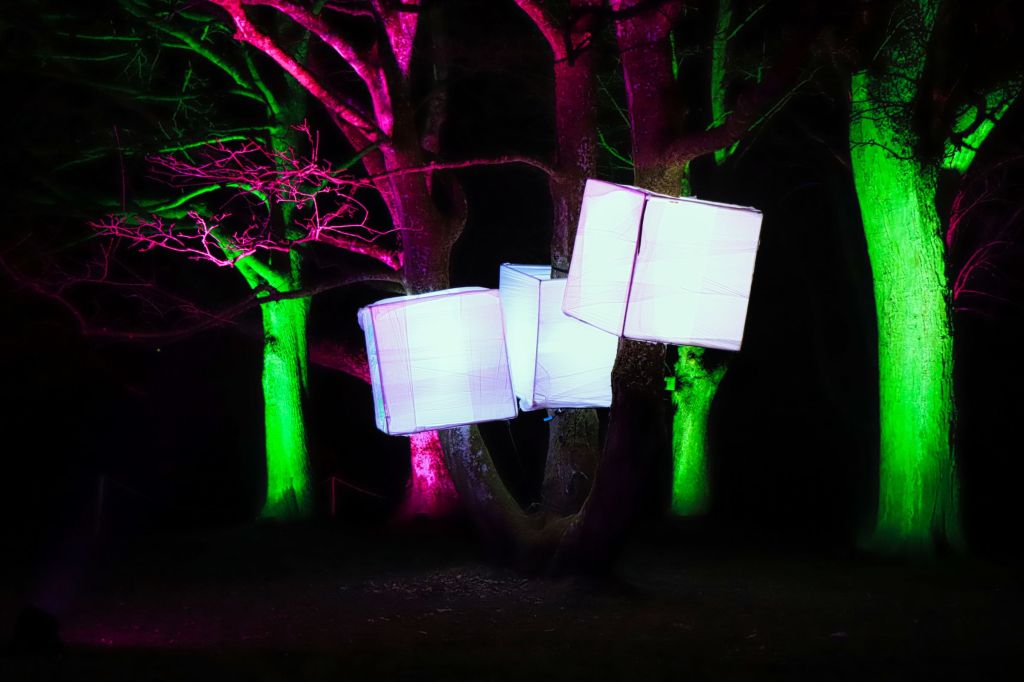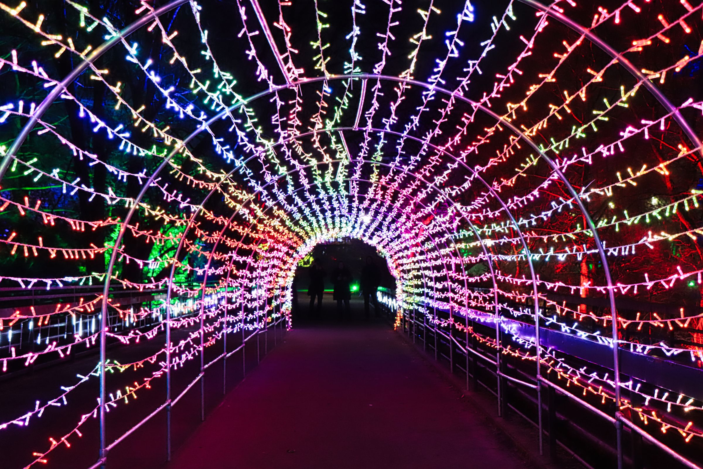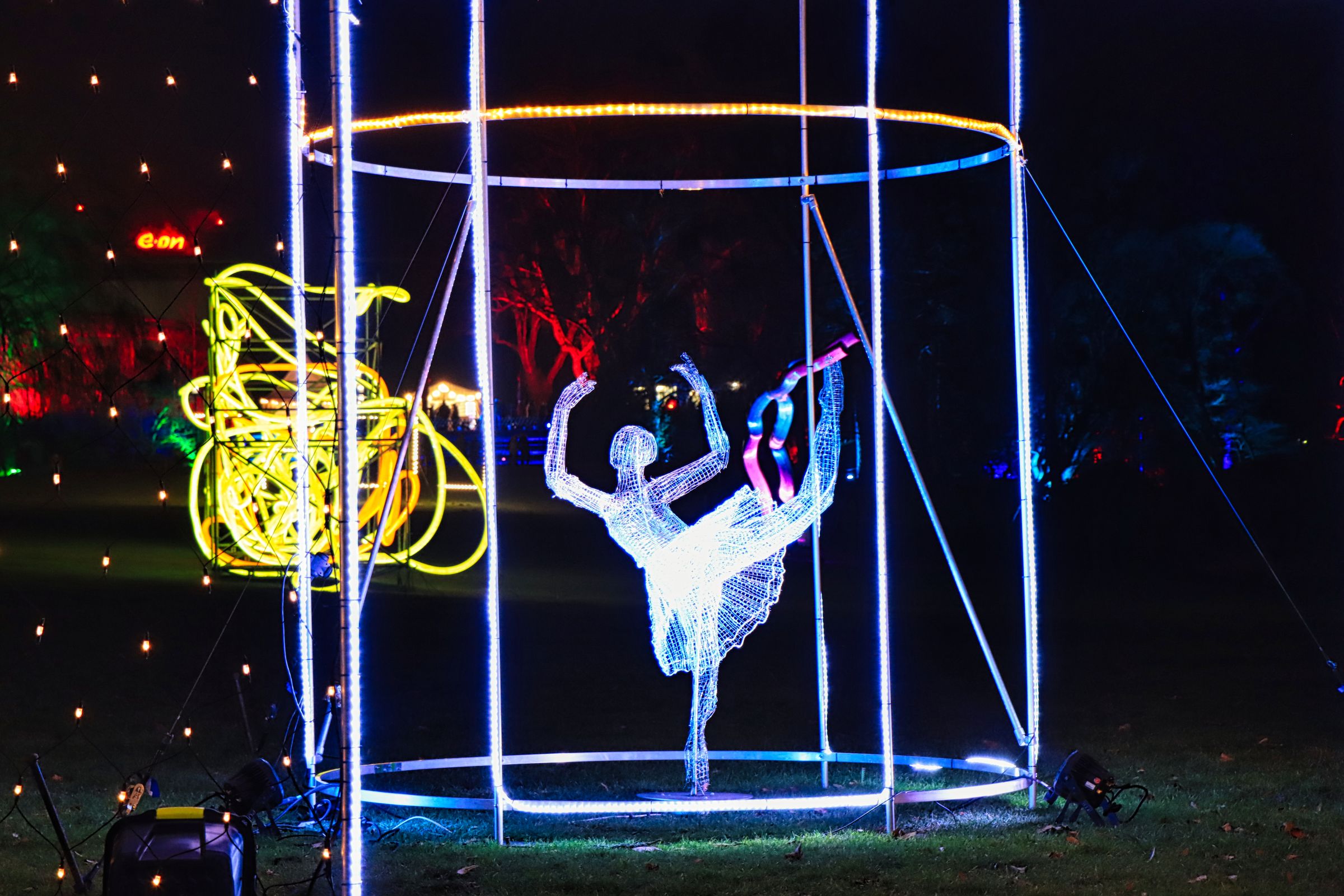 Die Fotohotspots, das darf man wohl so sagen, sind die bunten Kugeln im Musikpavillon und der Lichttunnel auf der Brücke in Höhe des Hundertwasser Hauses. Oder sollte ich die Ballerina erwähnen, die im Schloß auf der großen Wiese an der Orangerie einen Tanz hinlegt, die Einhörner am Grugaturm oder die wunderschön beleuchteten Blumen … aber vielleicht guckt ihr einfach selber mal vorbei. Oben an der großen Wiese steht das Thema, um das es geht … LICHT.