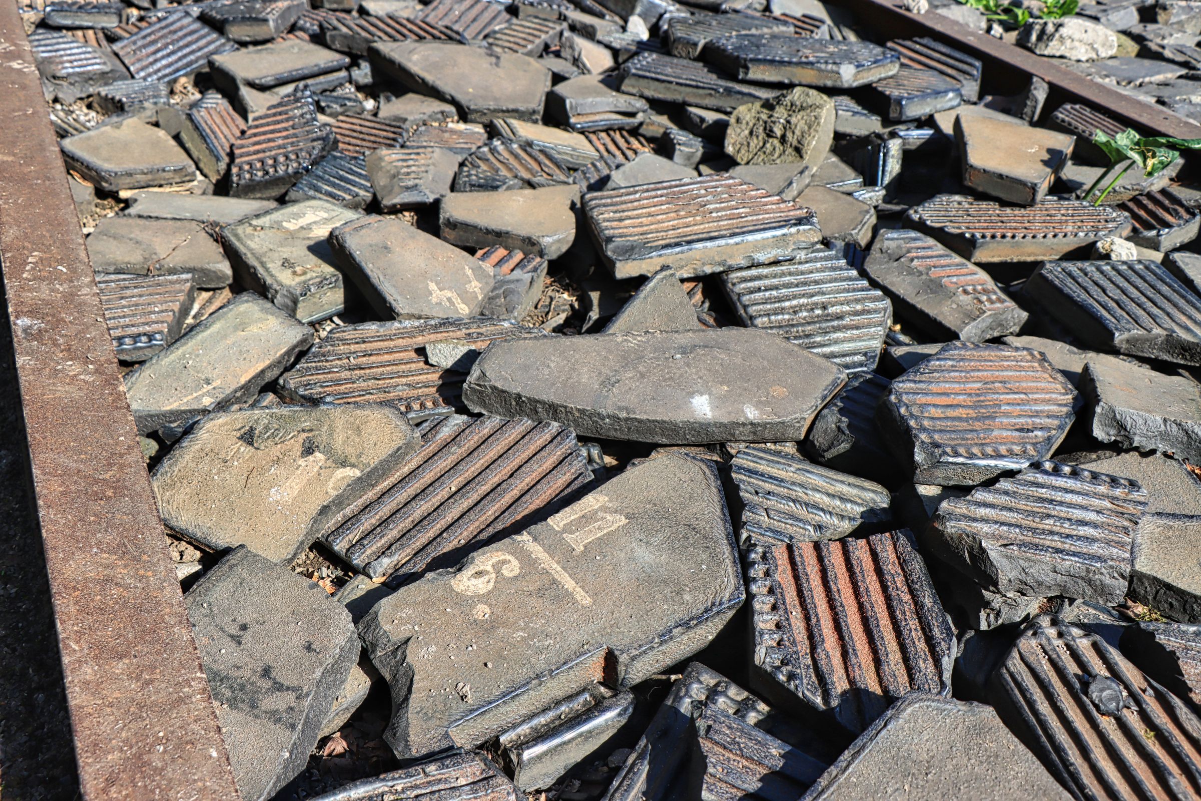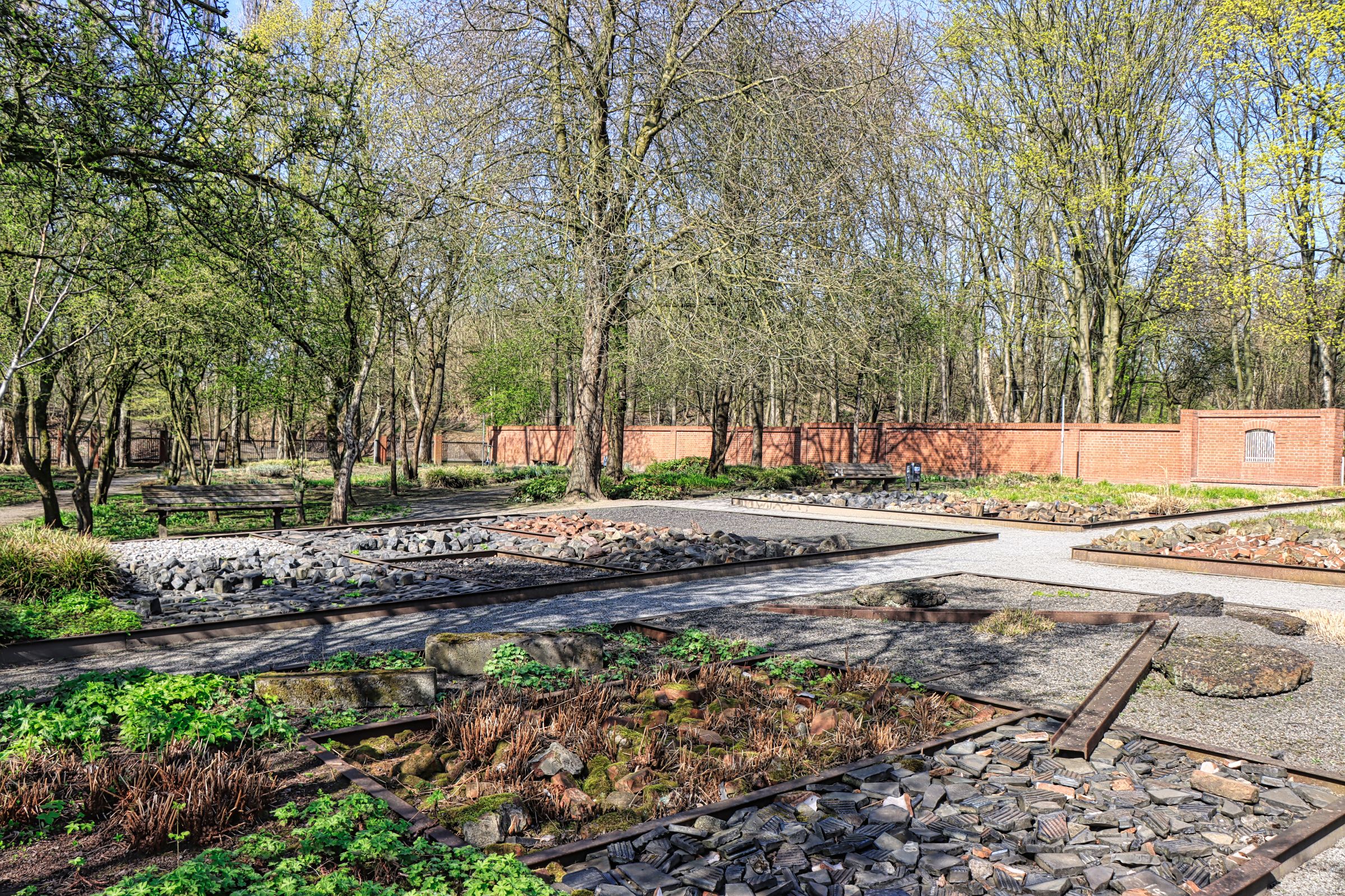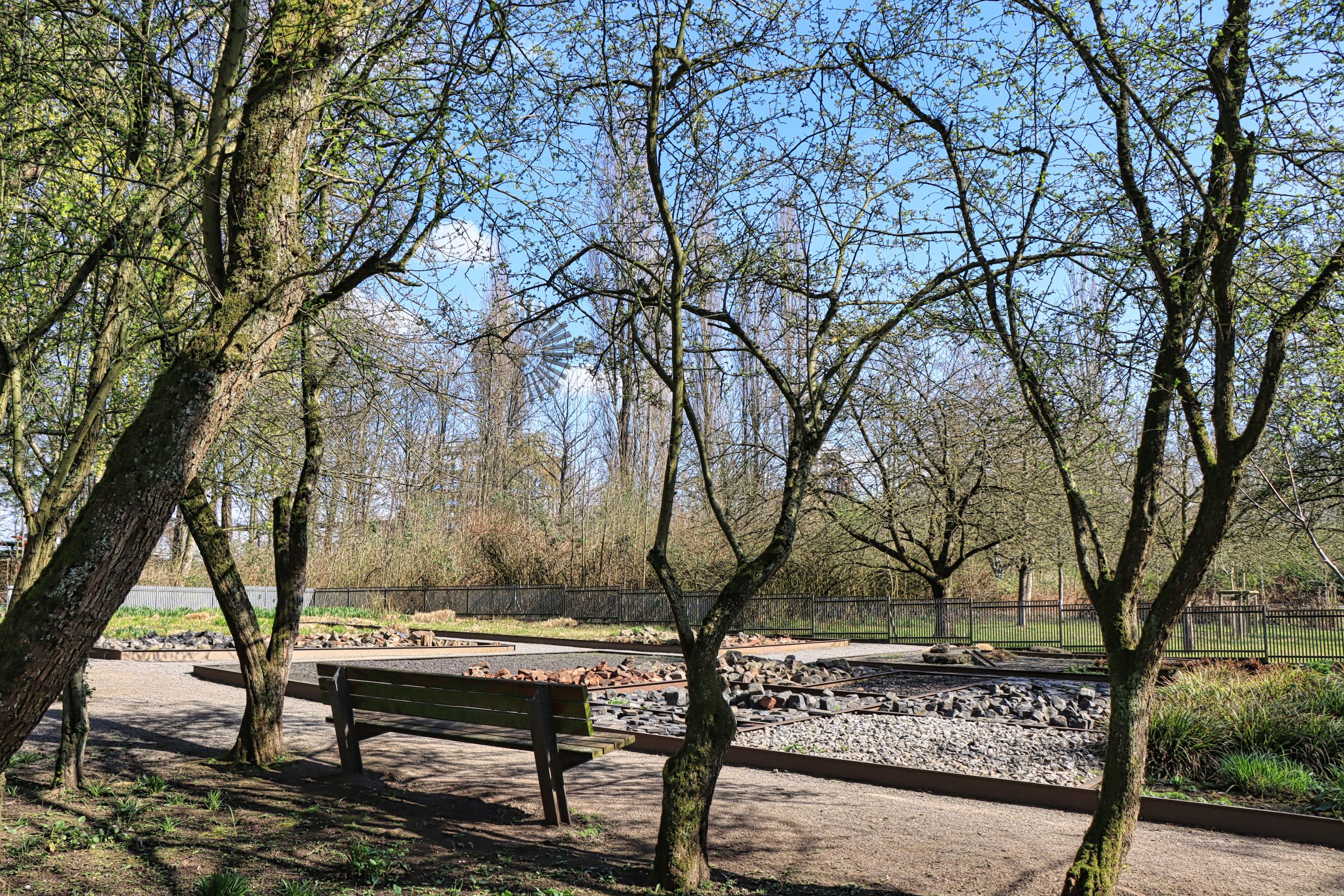 Der weitere Weg geht direkt unterhalb der Autobahn vorbei und als es wieder etwas ruhiger wird, erreicht man hinter einem Zaun den Stadtrandgarten. Es sieht wirklich aus, wie ein Garten mit Obstbäumen, im März noch ohne bunte Pflanzen und diversen Steinbeeten, welche verschiedene Materialen des Geländes aufweisen. Bis in die 1920’er Jahre war hier die Grenze zur damals noch eigenständigen Stadt Hamborn. Mit dem Bau der Autobahn wurden die restlichen Häuser und eine Gaststätte in den 1970’er Jahren abgerissen. Erst mit der Entwicklung des Landschaftsparks wurde der Garten sozusagen wiederentdeckt und neu gestaltet.