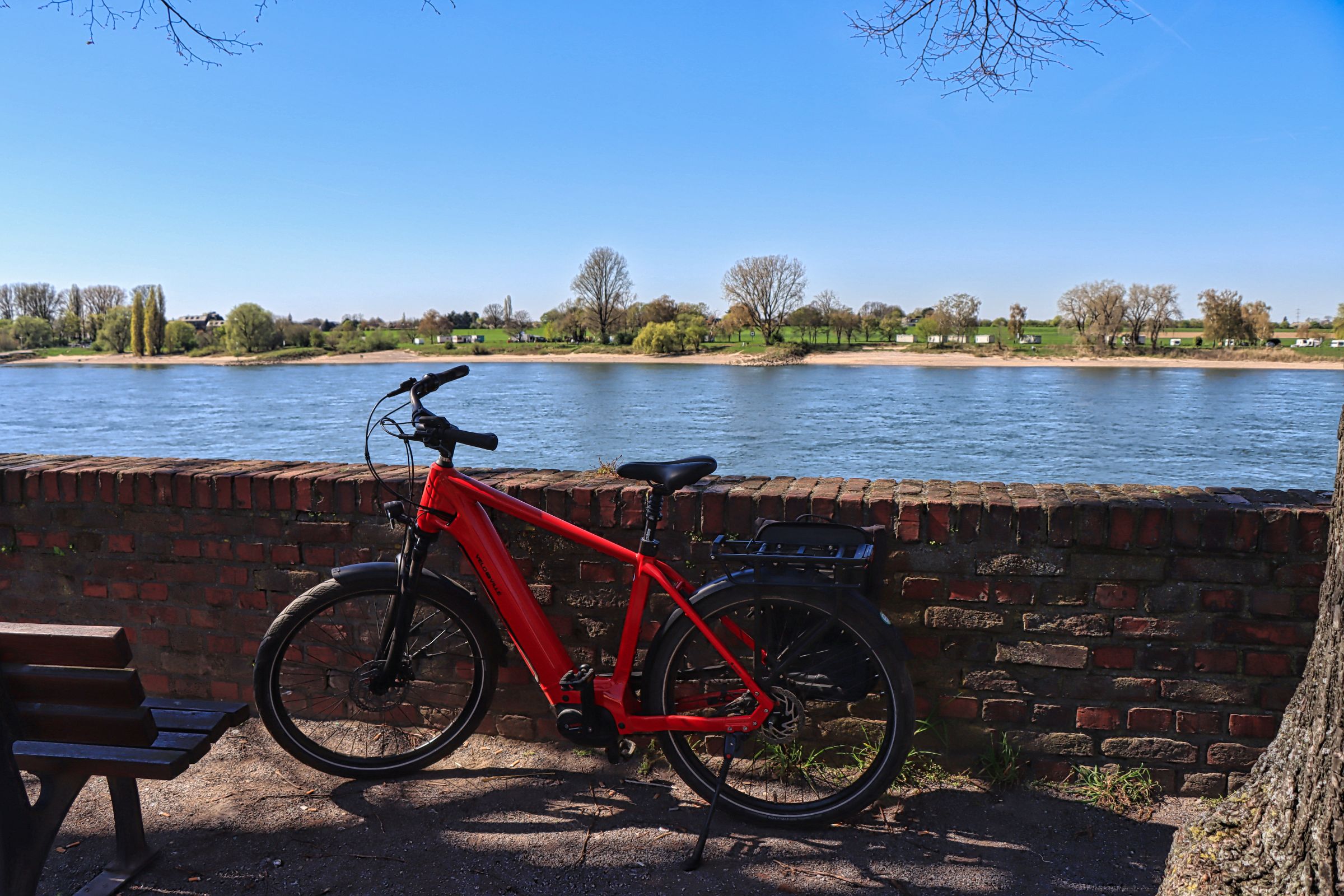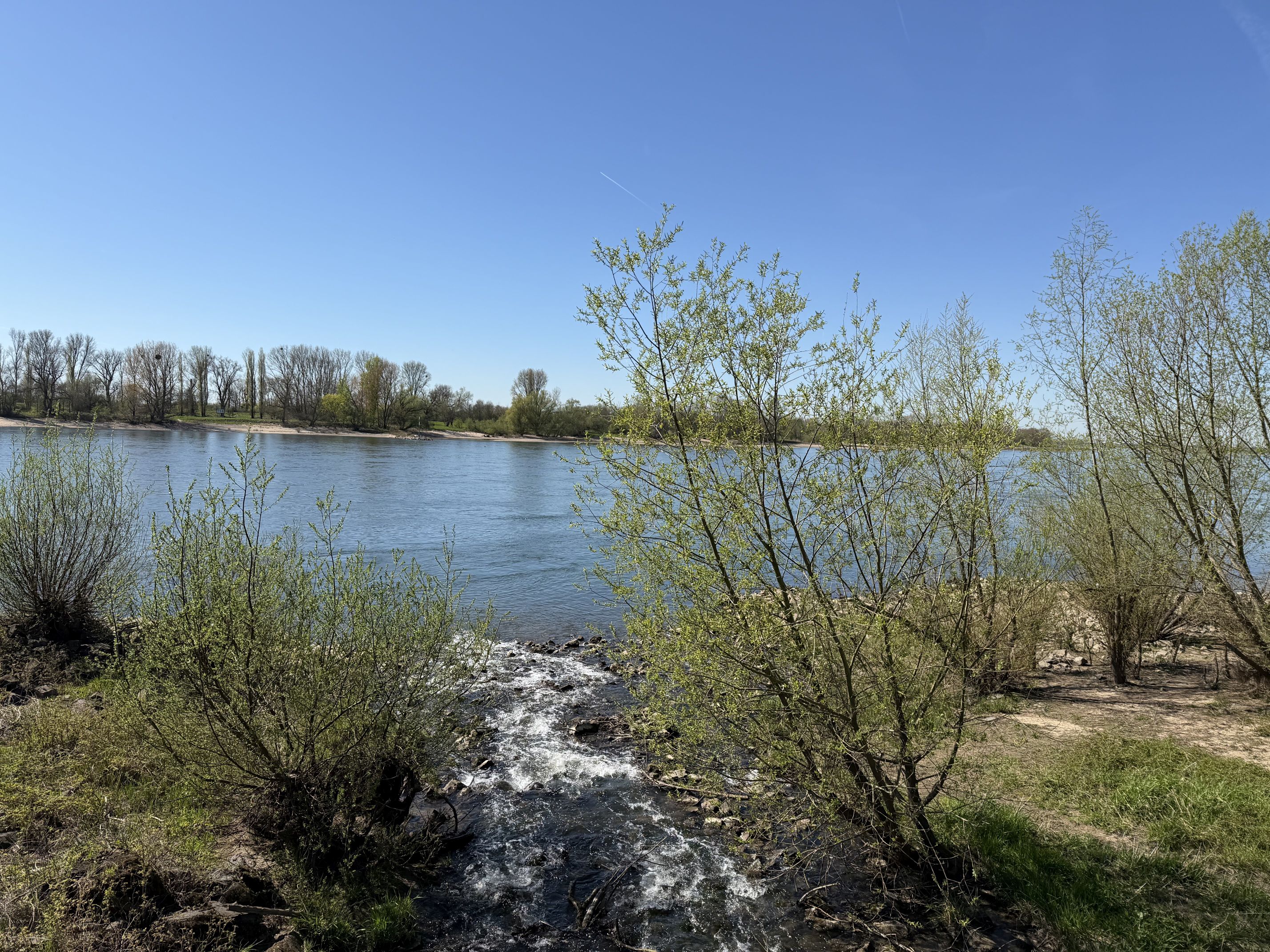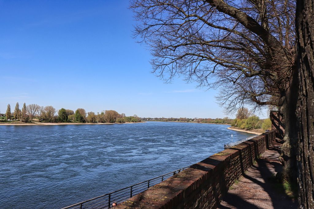 Jetzt kommt der gemütliche Teil der Strecke, denn rechtsrheinisch führt hier ein gut geteerter Fuß- und Radweg immer am Rhein entlang. Nach kurzer Fahrzeit erreiche ich Düsseldorf Kaiserswerth. Ich werfe einen Blick auf die Rheinpfalz, habe aber keine Lust mein Rad hier anzuschließen. So geht es kurz danach ein paar Meter weiter, bis zu einer Bank und Blick direkt auf den Rhein. Schräg gegenüber fährt normalerweise die Rheinfähre zwischen Langst-Kierst und Kaiserswerth.