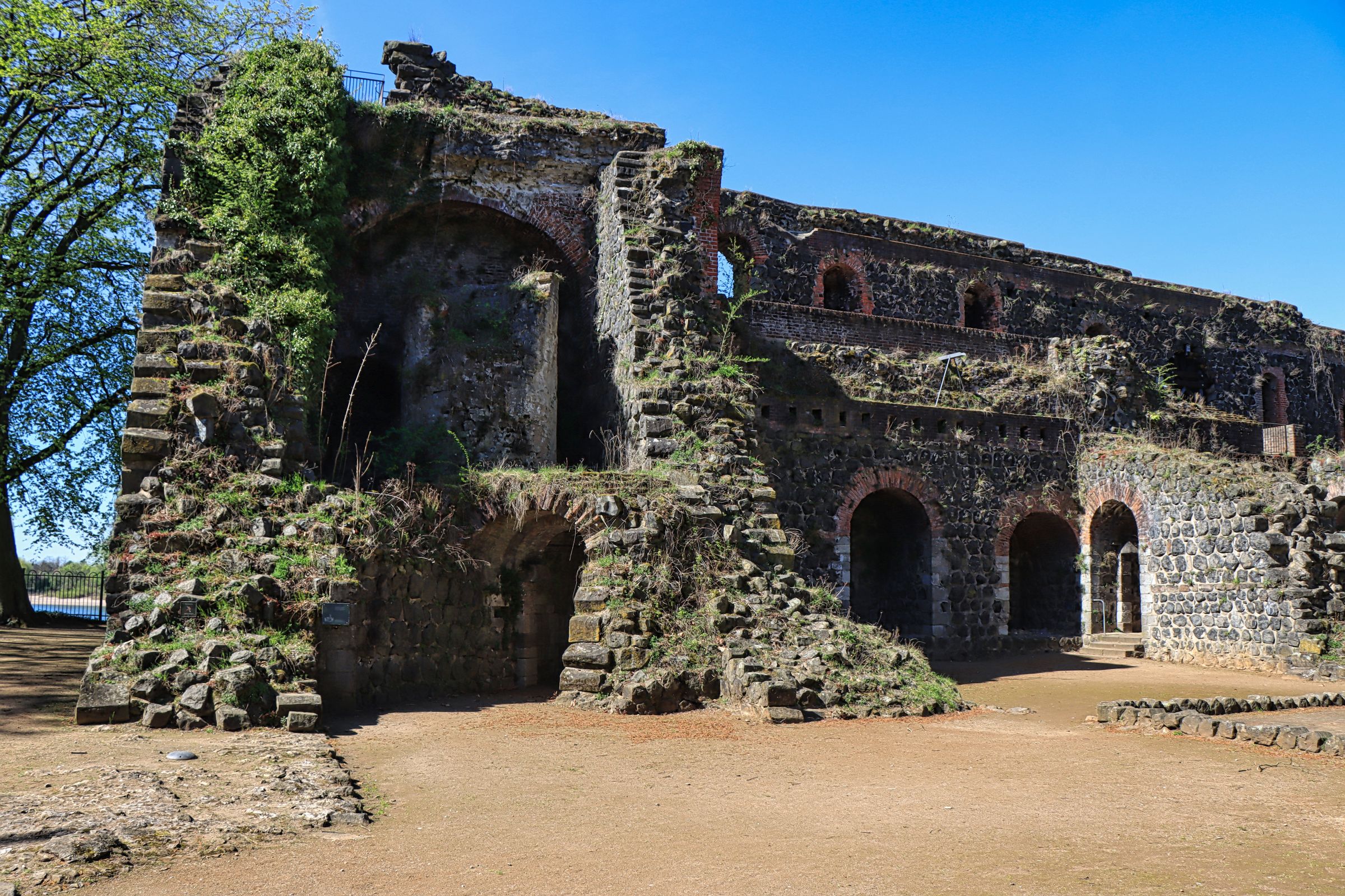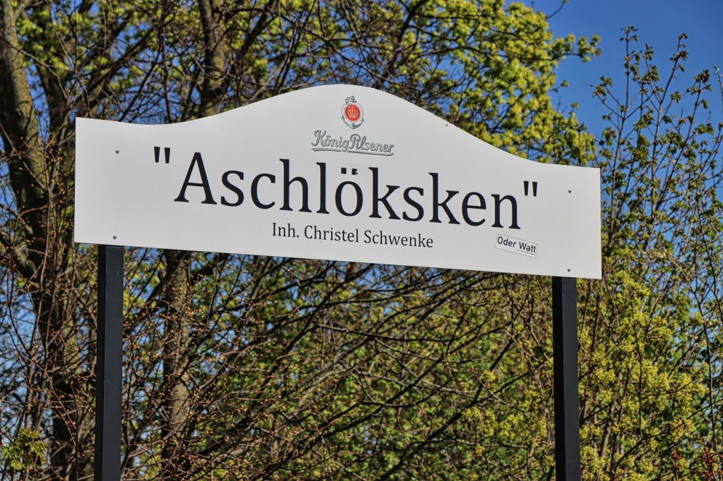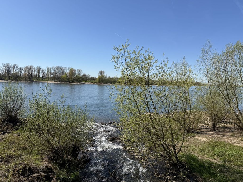 Von Kaiserswerth geht es weiter über die gut ausgebaute Strecke Richtung Duisburg Mündelheim. Ich quere die Mündung des Schwarzbachs und werde erst an der Baustelle zur (ewig dauernden) Deichsanierung kurz ausgebremst. Das heißt eine kurze Pause lege ich zwischendurch doch nochmal ein und zwar an einem Aussichtspunkt oberhalb eines kleinen Abzweigs. Hier ist das berühmte „Aschlöksken“ (genau lesen). Der Name des Biergartens am Rhein entstammt den Wörtern Asche und Loch, weil hier bis ins 19. Jahrhundert eine historische Grube zur Lagerung von Kohle und Asche lag.