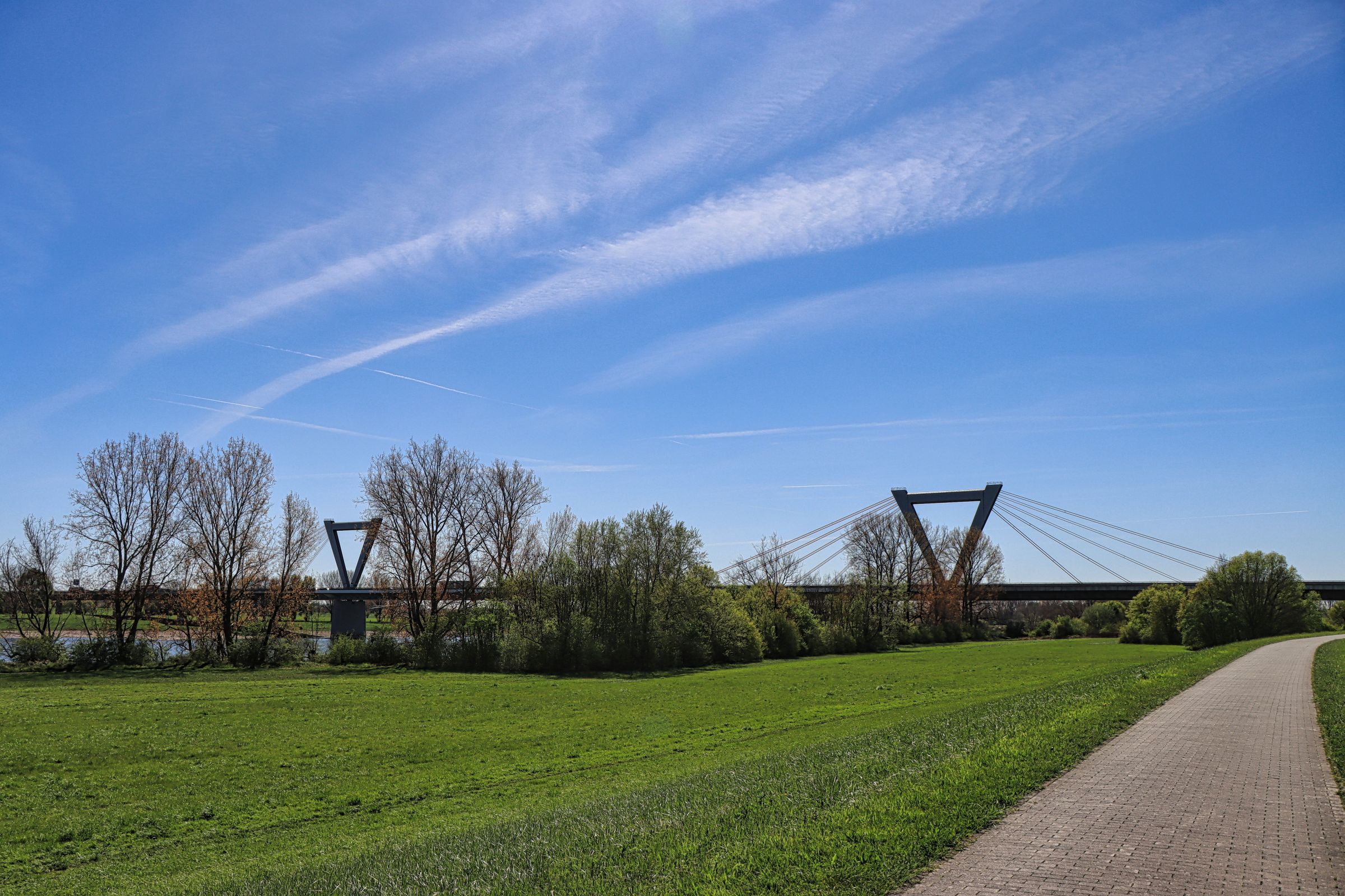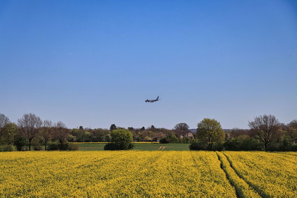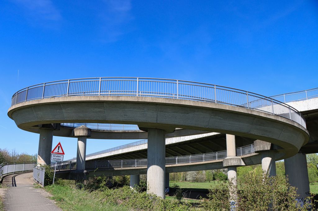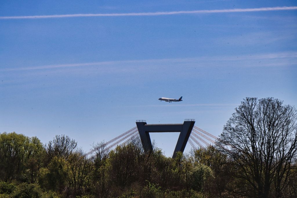 Auf halber Strecke mußte ich kurz einen Abzweig mitten zwischen ein paar Rapsfelder nehmen, um dann, nach kurzer Fahrt, linksrheinisch den Rheindeich nahe der Ilvericher Altrheinschlinge zu erreichen. Die Pylonen der Flughafenbrücke (A44) sind bereits zu sehen. Hier geht es mit dem Rad in einer Art Schnecke auf die Autobahnbrücke Richtung Flughafen. Der Radweg führt hier getrennt durch eine Leitplanke über den Rhein. Auf der anderen Seite weitere Rapsfelder und Flugzeuge im Landeanflug auf den Düsseldorfer Flughafen.