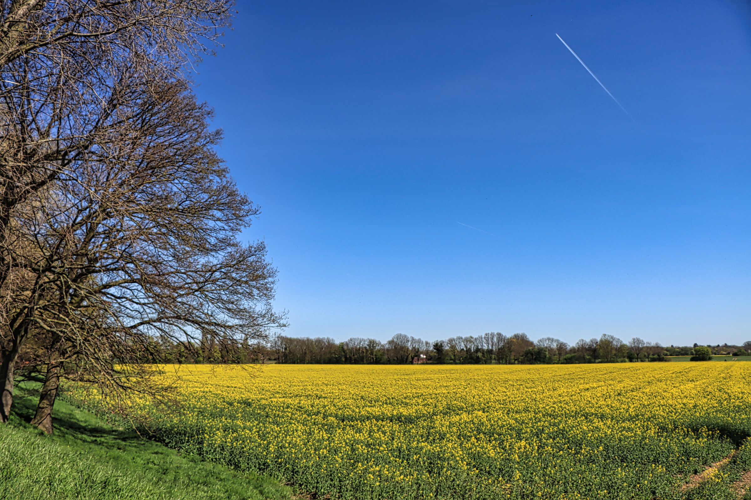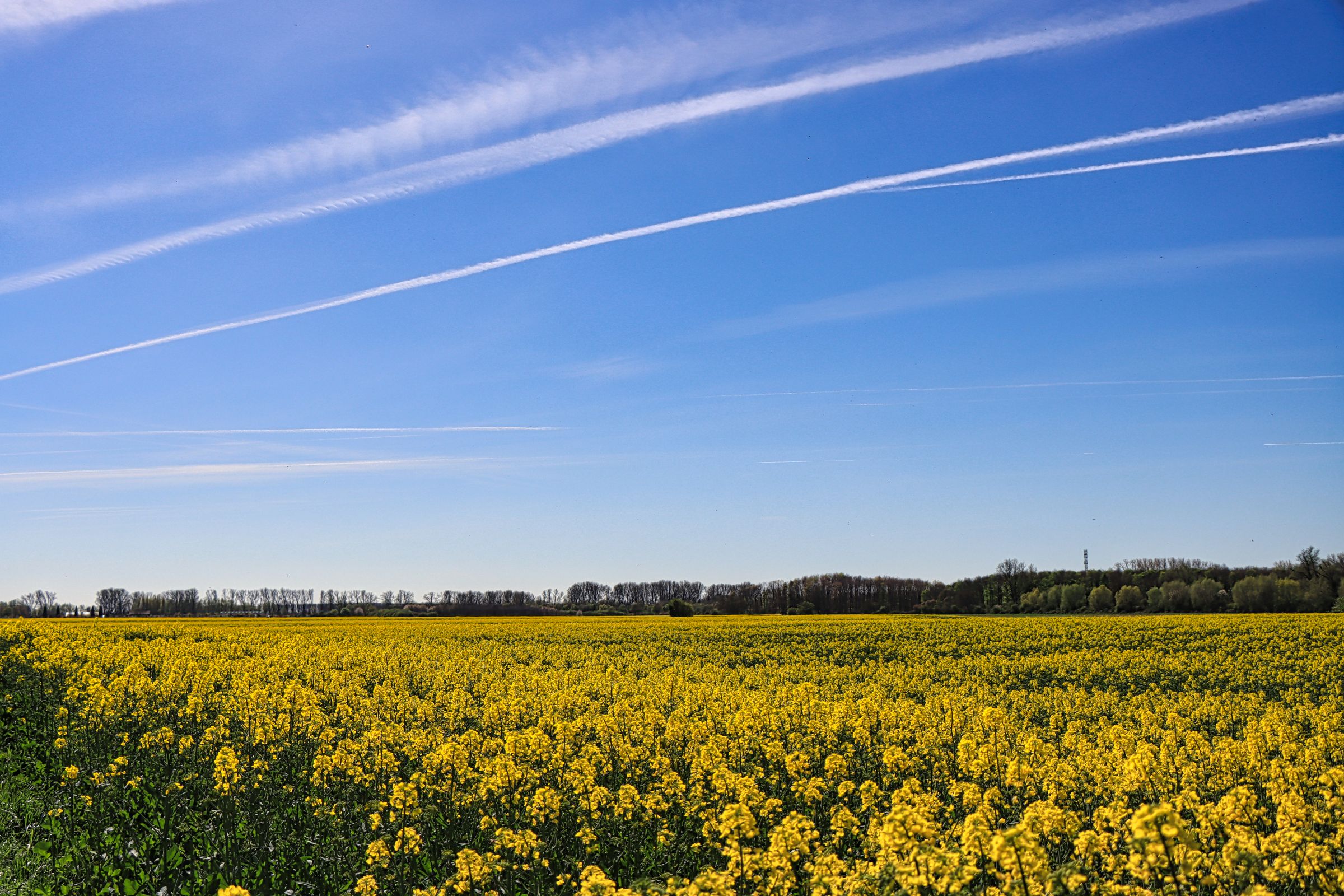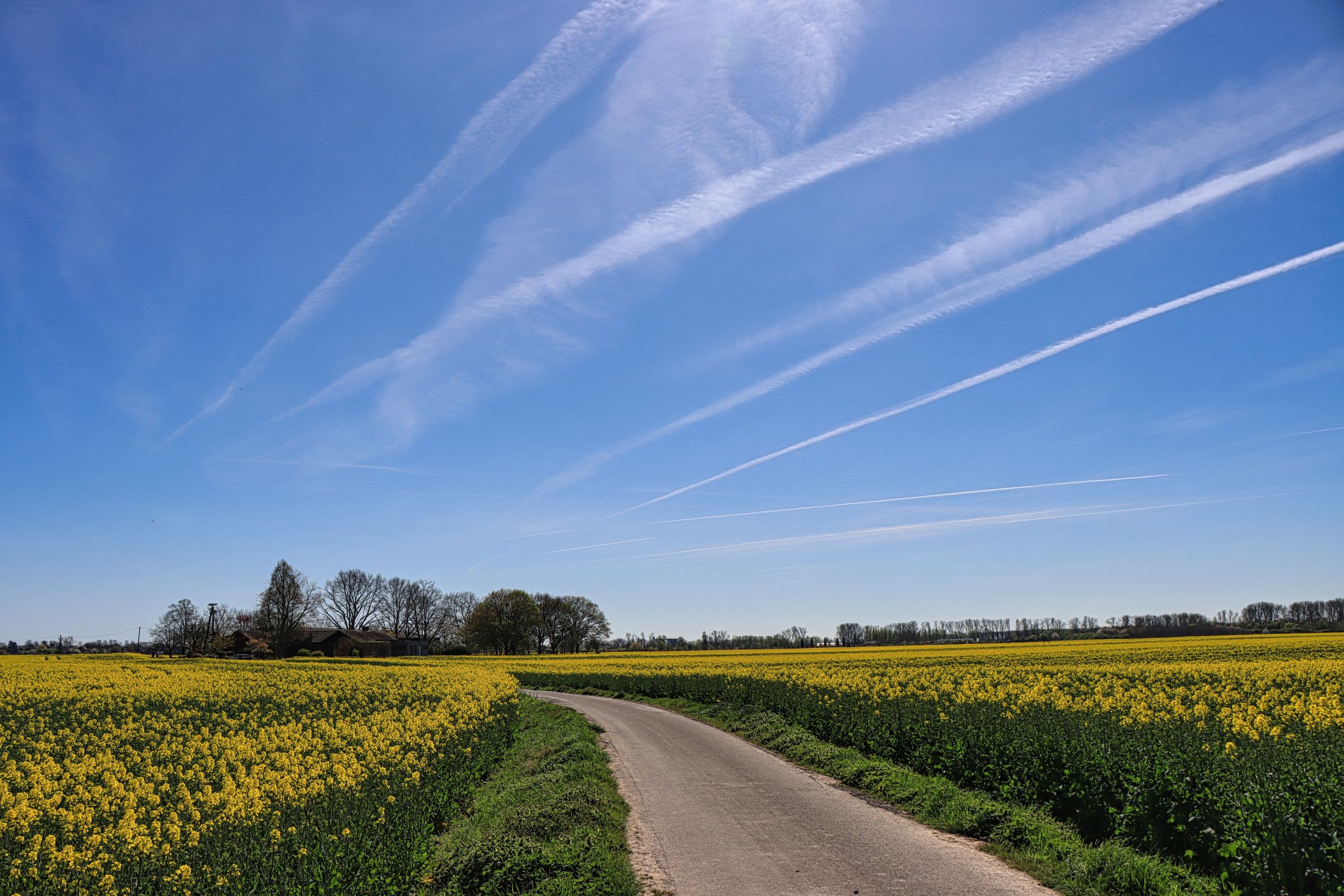 Auf halber Strecke mußte ich kurz einen Abzweig mitten zwischen ein paar Rapsfelder nehmen, um dann, nach kurzer Fahrt, linksrheinisch den Rheindeich nahe der Ilvericher Altrheinschlinge zu erreichen. Die Pylonen der Flughafenbrücke (A44) sind bereits zu sehen. Hier geht es mit dem Rad in einer Art Schnecke auf die Autobahnbrücke Richtung Flughafen. Der Radweg führt hier getrennt durch eine Leitplanke über den Rhein. Auf der anderen Seite weitere Rapsfelder und Flugzeuge im Landeanflug auf den Düsseldorfer Flughafen.