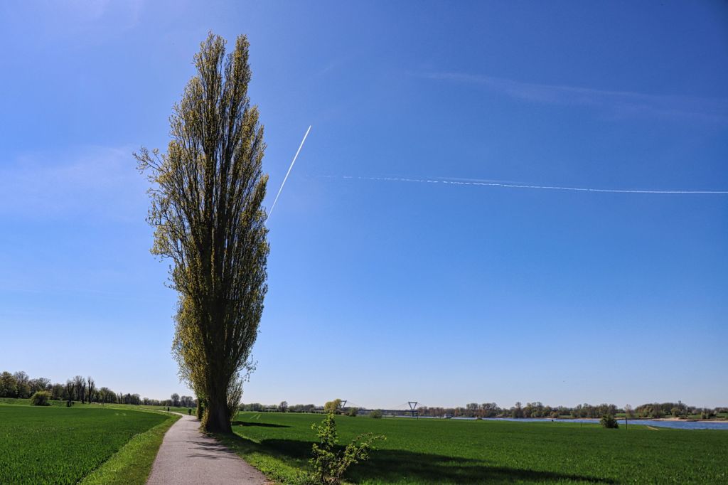 Nach Überquerung der Autobahn ging es dann ins Grüne. Durchs Naturschutzgebiet „Die Buersbach“ (den Latumer See habe ich links liegen gelassen) ging es Richtung Lank Latum. Lank Latum gehört zu Meerbusch, allerdings habe ich den Ort nur ganz am Rande gestreift. Über eine mit Pappeln gesäumte Allee, die auch genau so hieß, ging es durch weitere Grüngürtel, kurz nach Langst Kierst (auch Meerbusch) und gleich wieder raus in Richtung Rhein.