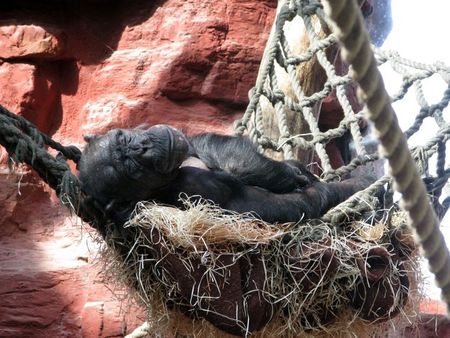 Leider sind nicht alle Tiere draußen, so wie im Sommer und auch die Restaurants sind größtenteils noch geschlossen, so daß Selbstverpflegung angesagt ist, aber dafür hat man Zeit und Muße die Tiere in aller Ruhe zu betrachten. Natürlich ist immer ist ein bischen Zufall dabei, dann in den Gehegen zu sein, wenn die Tiere nicht gerade schlafen. So hatte ich z.B. das ausgesprochene Glück im Tropenparadies zu sehen, wie die Hulman Affen mit den Orang Utans versuchten Freundschaft zu schließen oder wie die Schimpansen das erste Mal nach dem Winter wieder auf die Außenanlage durfen, dort mit Apfelstückchen gefüttert wurden und außer Rand und Band schienen. Gerade bei den Schimpansen muß man unweigerlich darüber nachdenken wer hier wen beobachtet. Die Menschen die Affen oder umgekehrt. So saß an einem Fenster ein kleines Mädchen und schaute hinaus, als plötzlich einer der jüngeren Affen angerannt kam, von außen ans Fenster klopfte und wieder verschwand, während das Mädchen einen Schreckensschrei ausstieß. Die Affen vor der Scheibe schienen sich köstlich zu amüsieren.