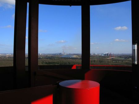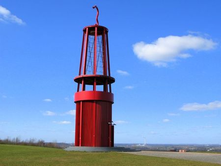 Anfang 2010, das Kulturhauptstadtjahr hatte gerade begonnen und die Halde Rheinpreussen in Moers war noch winterlich eingefroren, da war ich das erste Mal auf der Halde an der Gutenbergstr. Eine überdimensionale Grubenlampe ziert dort die Halde. Eine 30 Meter hohe Sicherheitslampe aus Stahl (Geleucht genannt), die am Wochenende auch als Aussichtsturm genutzt werden kann. Trotz der geringen Höhe hat man vor dort einen guten Blick über den Niederrhein (z.B. nach Kamp Lintfort) bis über den Rhein und auf die Industriekulissen von Duisburg.