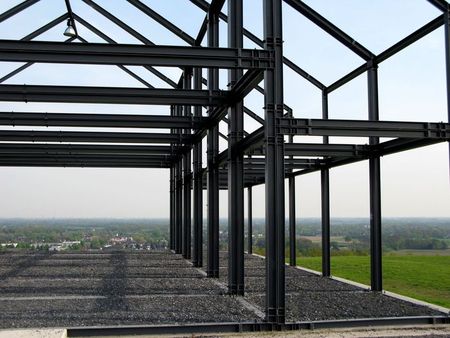 Als erstes fällt einem eine Stahlkonstruktion ins Auge. Das Kunstwerk nennt sich „Hallenhaus“ und ist eine Art Haus ohne Dach und Wände 15 x 18 x 10 m (LxBxH). Rund um das Haus erstrecken sich Rundwege, die von Freizeitsportlern aller Art genutzt werden. Radfahrer, Wanderer, Jogger, Nordic Walker alles ist vertreten und die Wege sind sogar ausgeschildert. Wer genügend Kondition hat (oder sich diese antrainieren will) nimmt die 359 Stufen im Laufschritt, am besten gleich mehrfach (keine Idee von mir, es gab junge Menschen vor Ort, die das trainierten).