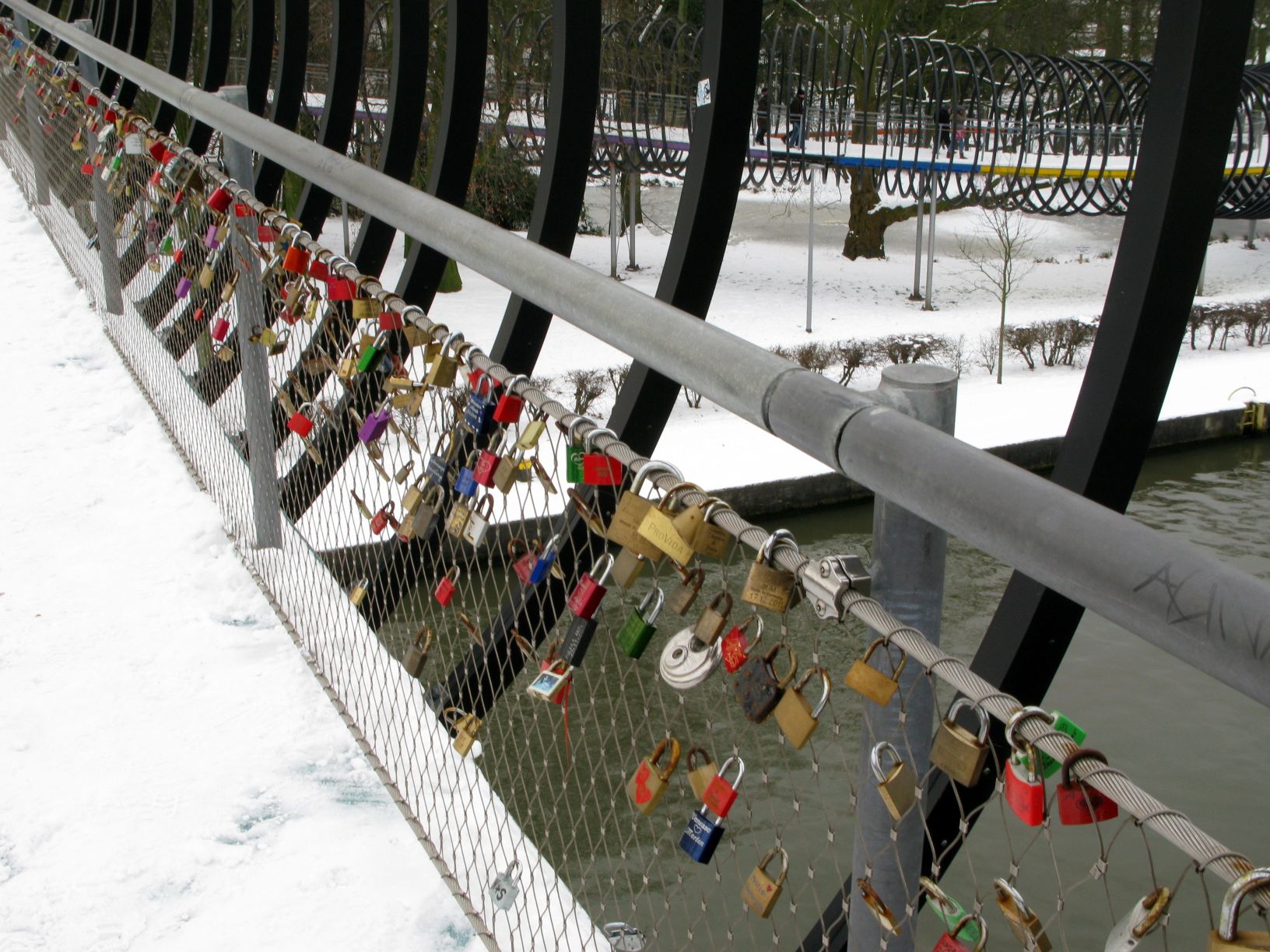 … und da mehren sich die Schlösser an Brücke 316a. Ob die passenden Schlüssel alle im Rhein-Herne-Kanal darunter landen? Ich hatte ja mal überlegt, ob die ganzen Schlösser nicht irgendwann zu schwer werden, aber wenn ich die Schneemengen sehe, brauche ich mir wohl keine Gedanken zu machen 🙂 . Der Rhein-Herne-Kanal selbst war übrigens frostfrei. Im letzten Jahr war ich ein wenig weiter östlich und habe Aufnahmen von Eisschollen gemacht. Na ja, die Schifffahrt wird’s freuen.