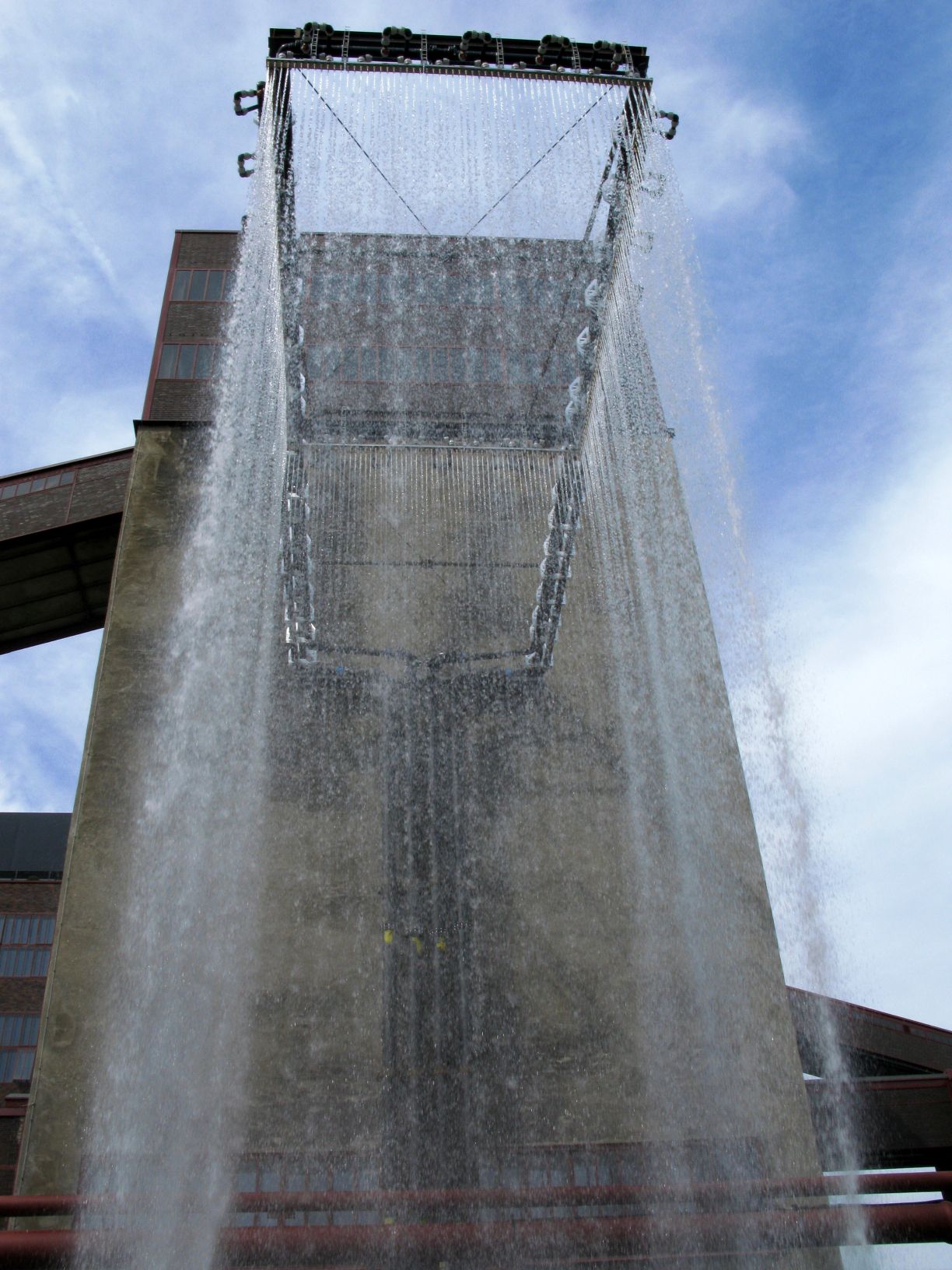 Start war an der Zeche Zollverein. Dort findet ihr bis zum 6. Oktober (täglich außer bei zu starkem Wind) den rAndom International: Tower. Aus 19 Metern Höhe schießt aus 520 Düsen 800 Liter Wasser pro Sekunde(!) herunter. Bewaffnet mit einem Regenmantel (hängt vor Ort aus) kann man sich in die Mitte des Rechtecks (6 x 8 Meter) stellen, aber auch mitten in den Wasserstrom. Nein, ich habe es nicht ausprobiert, weil ich noch was vor hatte an dem Tag und befürchtet habe, völlig durchnäßt den Resttag verbringen zu müssen. Aber es muß wohl eine tolle Erfahrung sein, wenn ich mir betrachte, wieviele Menschen den Versuch gewagt haben.