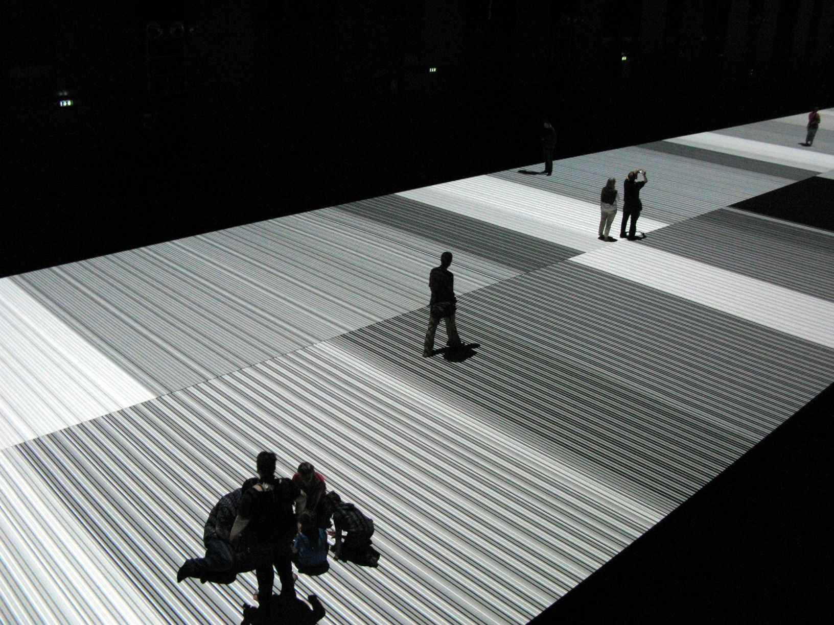 Es quietscht und pfeift, kurz leise, dann wieder ohrenbetäubend laut. Gut, daß ich eh schon halb taub auf einem Ohr bin. Zuerst auf die Empore rauf und das ganze Spektakel von oben betrachten. Auf dem Boden liegt 100 m heller Belag, eine Art Leinwand auf dem Fußboden. An der Decke der Kraftzenztrale Projektoren die Strichcodeähnliche Bilder auf den Boden spielen. Erst langsam, dann schneller werdend. Dann große weiße Vierecke, gefolgt von großen schwarzen Vierecken. Dazwischen Besucher als Teil der Installation. Die Treppe wieder runter, Schuhe aus und die „Leinwand“ betreten. Jetzt bin ich Teil der Kunst und merke, mir donnern die Bässe in den Bauch und pfeifen die hohen Töne in den Ohren. Mir ziehen die Streifen den Boden unter den Füßen weg :-o.