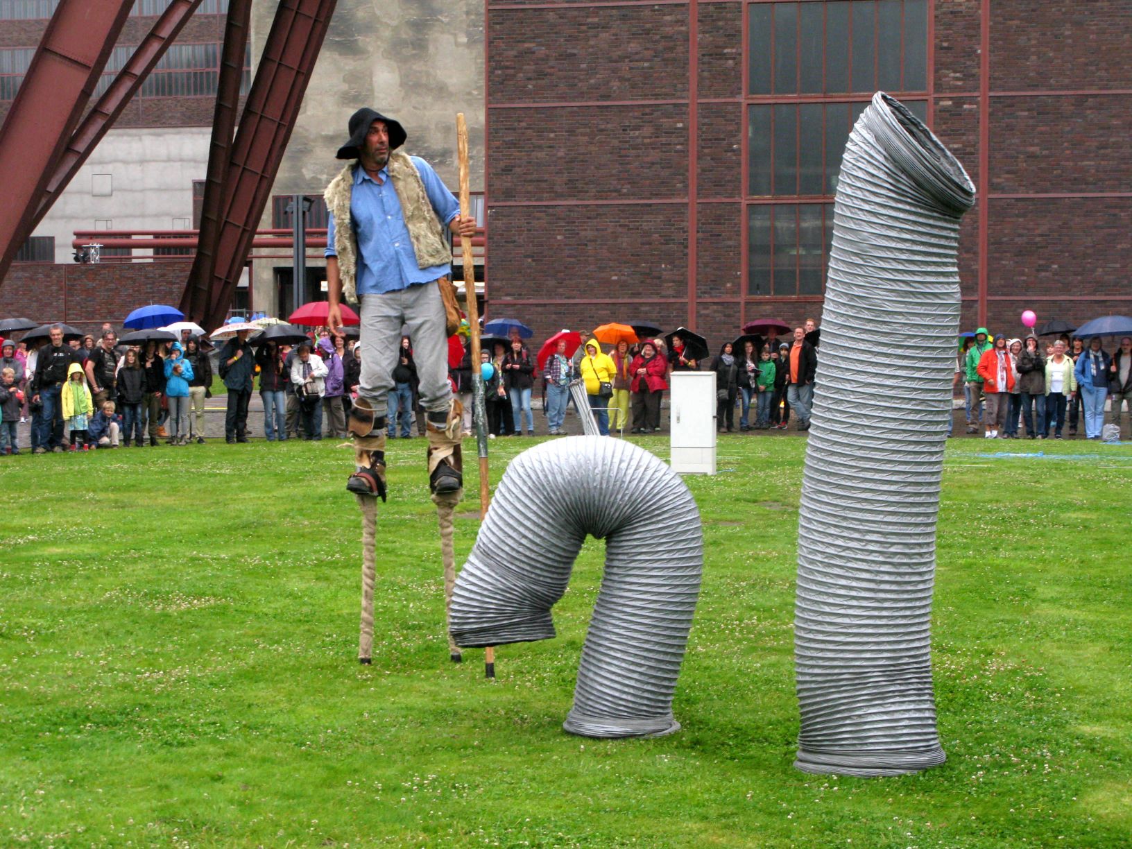 Die Museum und Ausstellungen hatten lange Warteschlangen, dafür strickten, pardon häkelten ein paar Leute etwas abseits eine Europakarte und auch im hinteren Teil der Kokerei, wo die RAG seit einiger Zeit ihren Firmensitz hat, stand eine Bühne, die aber am frühen Abend nur eine handvoll Zuschauer im Regen erfreute. Zwischen der Zeche und der Kokerei klaffte, vielleicht wetterbedingt, ein Unterhaltungsloch. Ob später noch mehr Gäste dorthin gefunden haben, kann ich nicht sagen. Zum Wetter paßt zumindest das obige Bild, daß ich am Straßenrand aufgenommen habe 🙂 . Mein Abend endete mit der Show von „Mister M“, der wieder mal (ich kannte ihn bereits aus dem Vorjahr) mit Geschick und Humor mit Feuerkeulen jonglierte, während er auf einem drei Meter hohen Einrad saß.