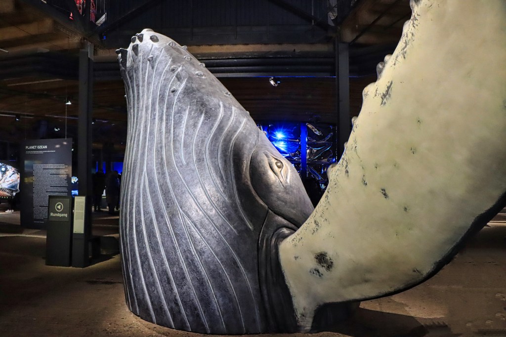 Neues Jahr, neue Ausstellung. Gleich neben Rhein-Herne-Kanal und dem Einkaufscentrum Centro befindet sich der Gasometer in Oberhausen. Der alte Gasspeicher zeigt in diesem Jahr die Ausstellung „Planet Ozean“, die am vergangenen Montag schon ziemlich gut besucht war, aber die Besucher haben sich nach dem ersten Andrang dann doch recht gut verteilt. Von den Küsten bis in die Tiefsee geht die Ausstellung dieses Mal mit seinen verschiedenen Ausstellungskapiteln. Gleich am Eingang begrüßt mich die riesige Skulptur eines Blauwals, die aus dem Boden zu kommen scheint.
