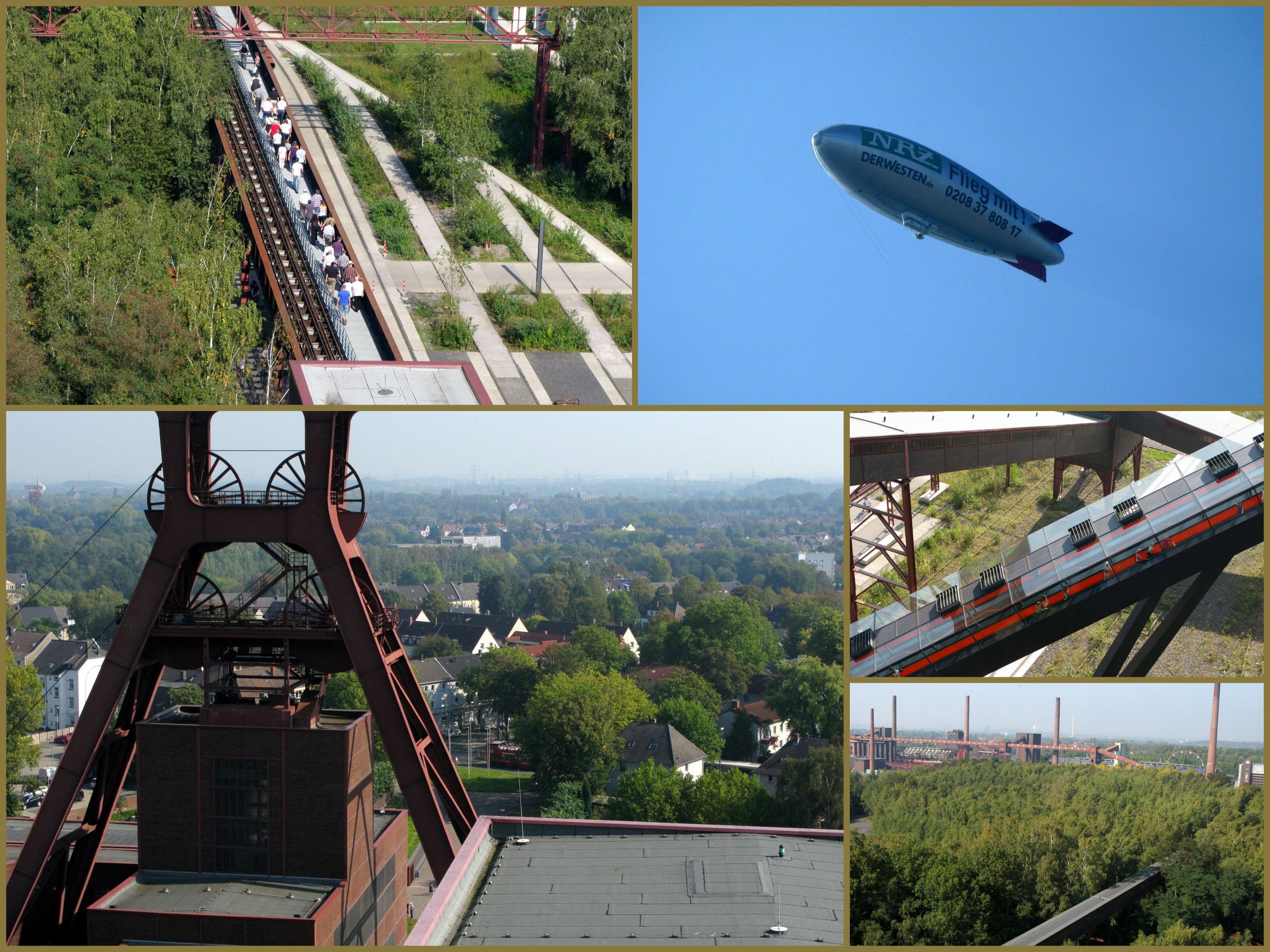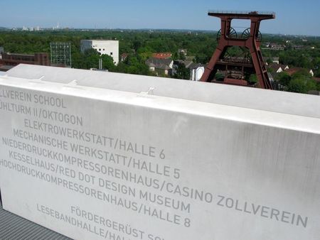 Nach dem Film geht es noch auf die 45 Meter Aussichtsebene, also auf’s Dach der Zeche Zollverein. Auch hier nicht einfach Augen zu und durch, denn der Weg auf die Dachterrasse geht durch einen Teil der Kohlenwäsche. Man läuft sozusagen selbstständig eine Etage oberhalb von Eingangshalle und Ruhrmuseum und kann dort hinunterschauen. Wer mehr sehen möchte, muß die Führung über den „Denkmalpfad Zollverein“ mitmachen. Da kaum andere Gäste da waren also Zeit für ein paar Fotos drinnen und erst Recht draußen. Der Blick geht über Förderturm, Kokerei, die Skyline von Essen auf das umliegende Ruhrgebiet und die Halden mit ihren Landmarken (Richtung Westen ist die Sicht leider etwas versperrt). Darüber habe ich ja auch schon hier im Beitrag „Kulturhauptstadt Essen“ erzählt.